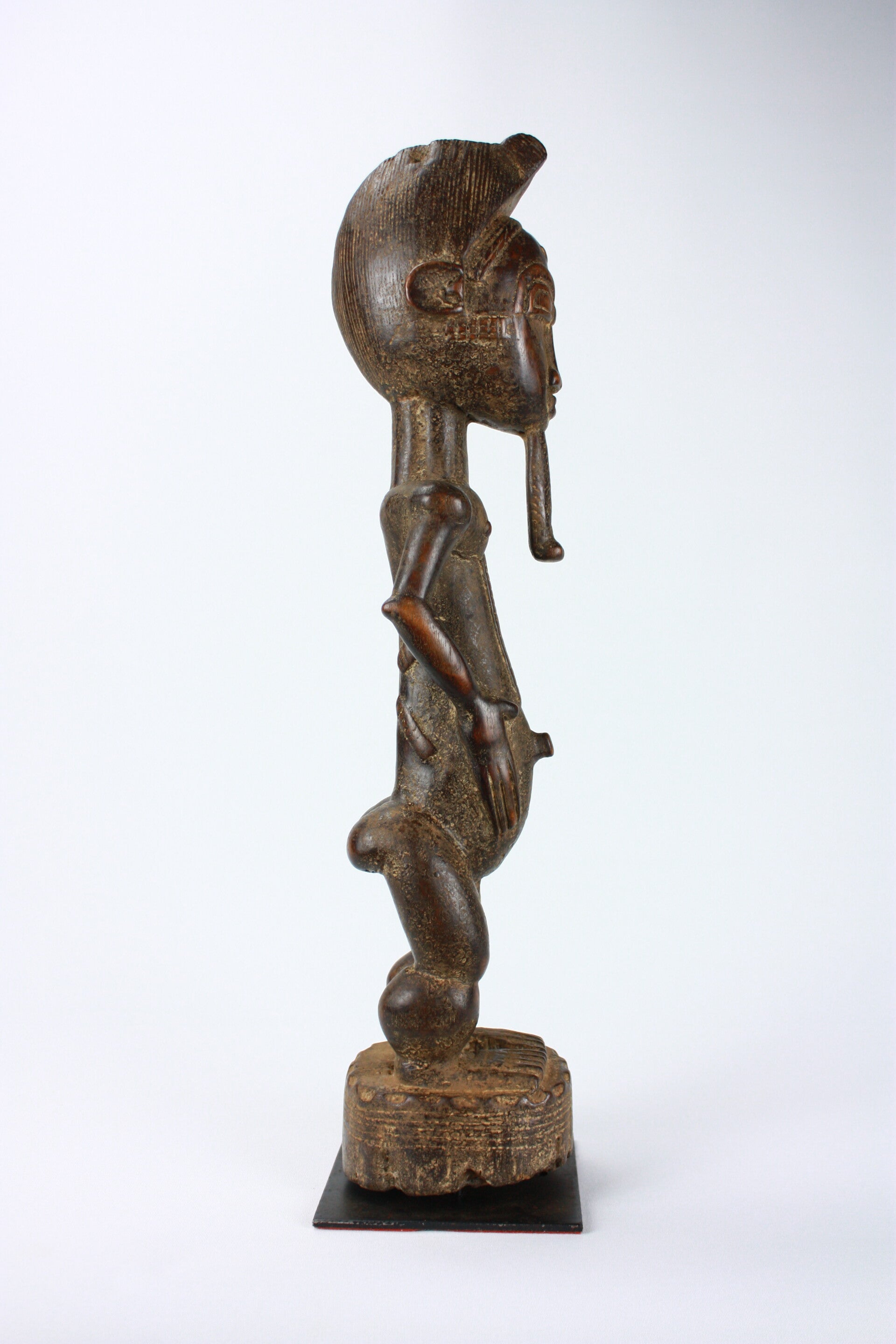 An expressive male sculpture of the Baule culture, Ivory Coast, carved with attention to symmetry and proportion. The figure’s poised stance and stylized anatomy reflect the classical canon of Baule carving. A collectible example of a tradition that has long been represented in major ethnographic and fine art institutions.