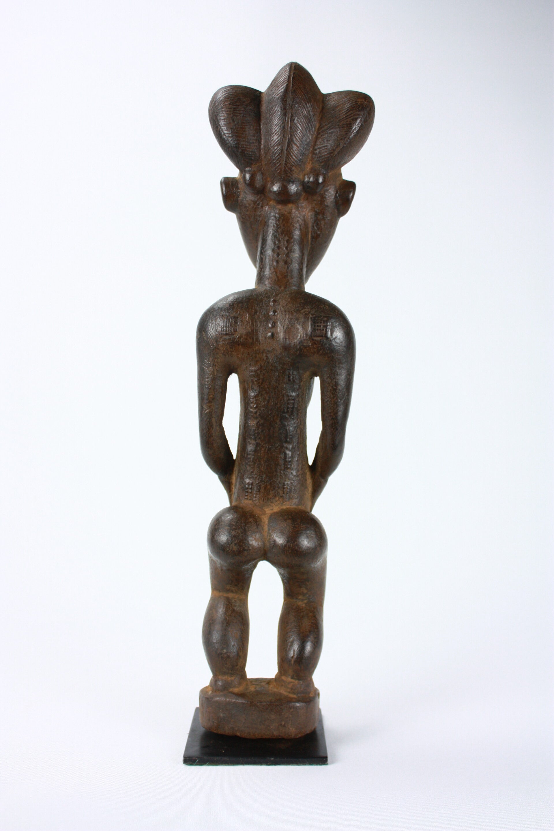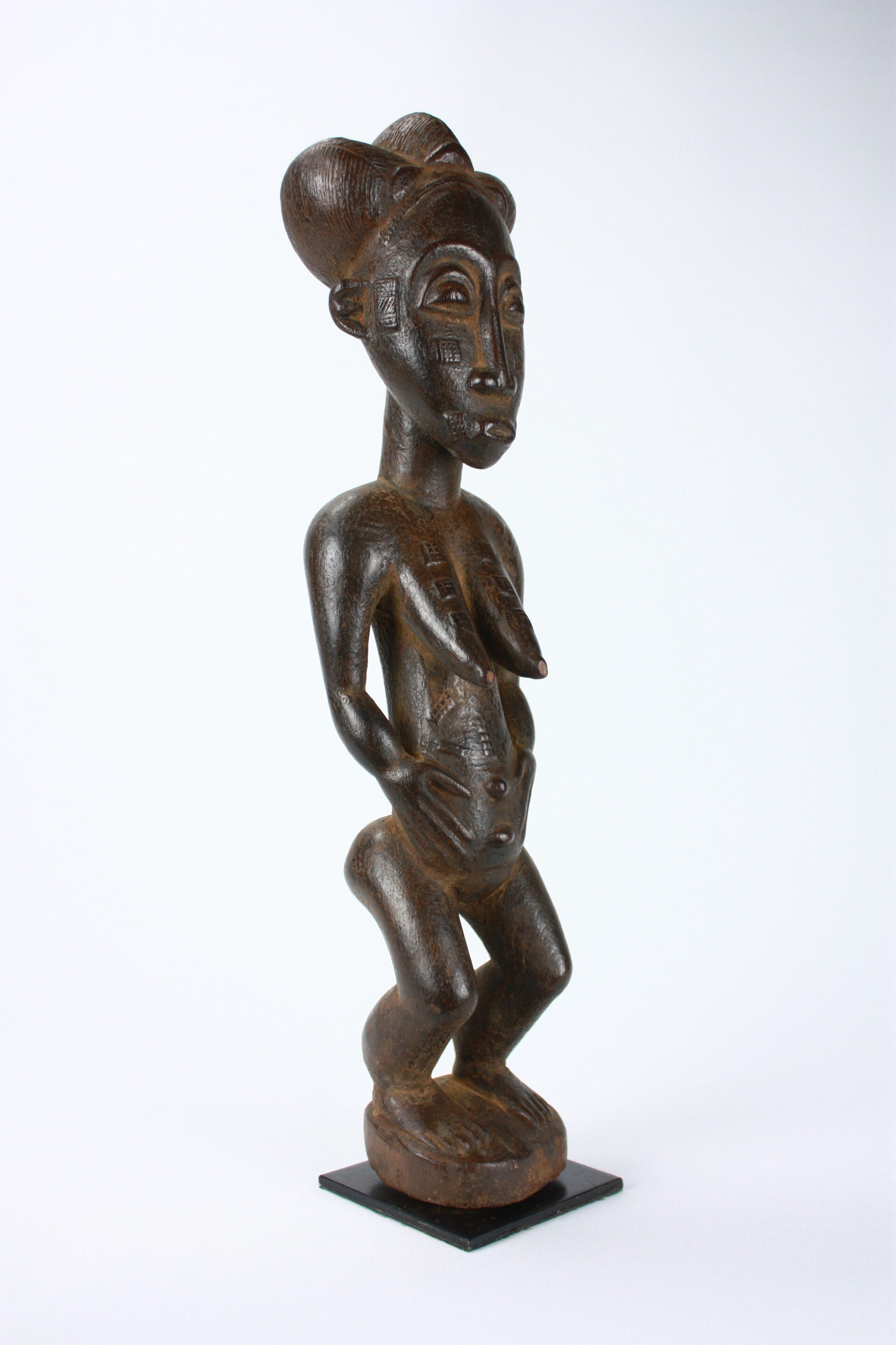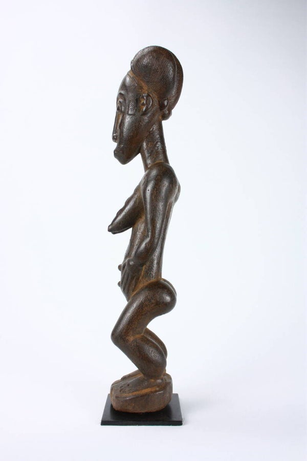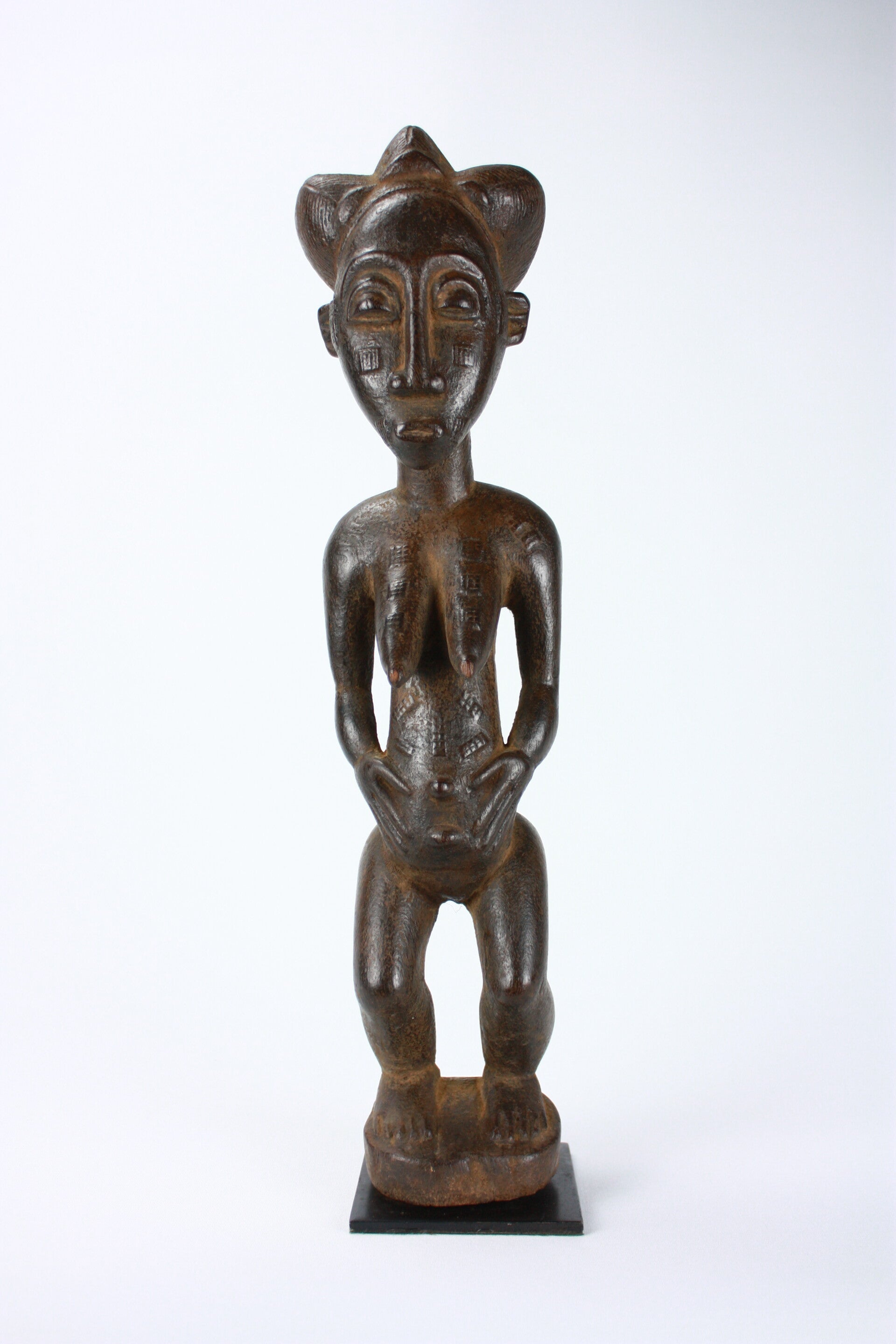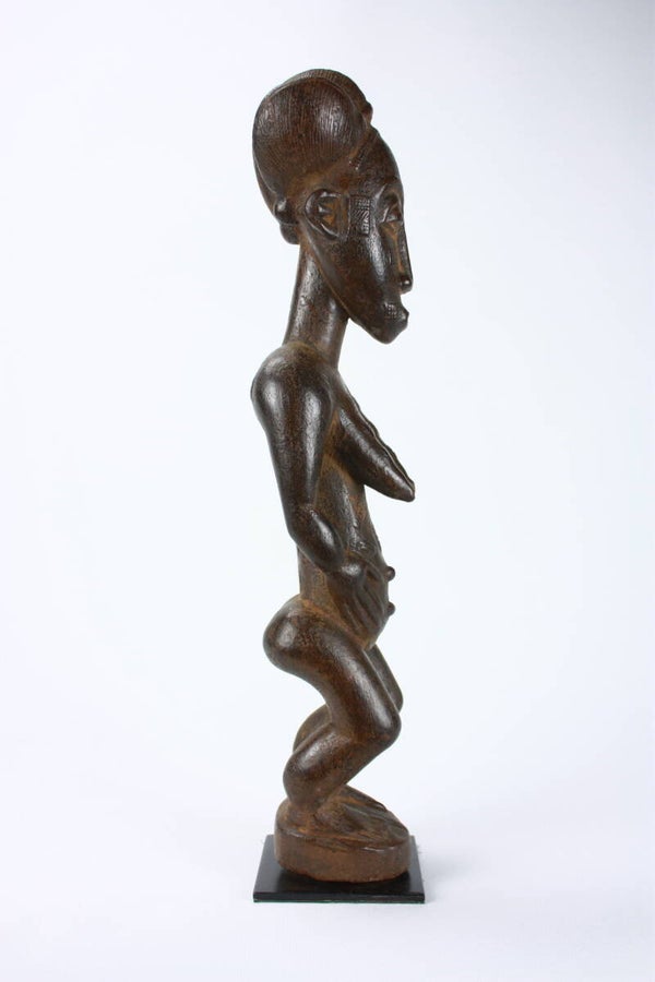 This Baule female maternity sculpture embodies maternal protection and spiritual continuity. The elegant posture and refined carving highlight the sculptural sophistication of the Baule workshop tradition. A museum-worthy piece for collectors focused on symbolism and form in West African art.
