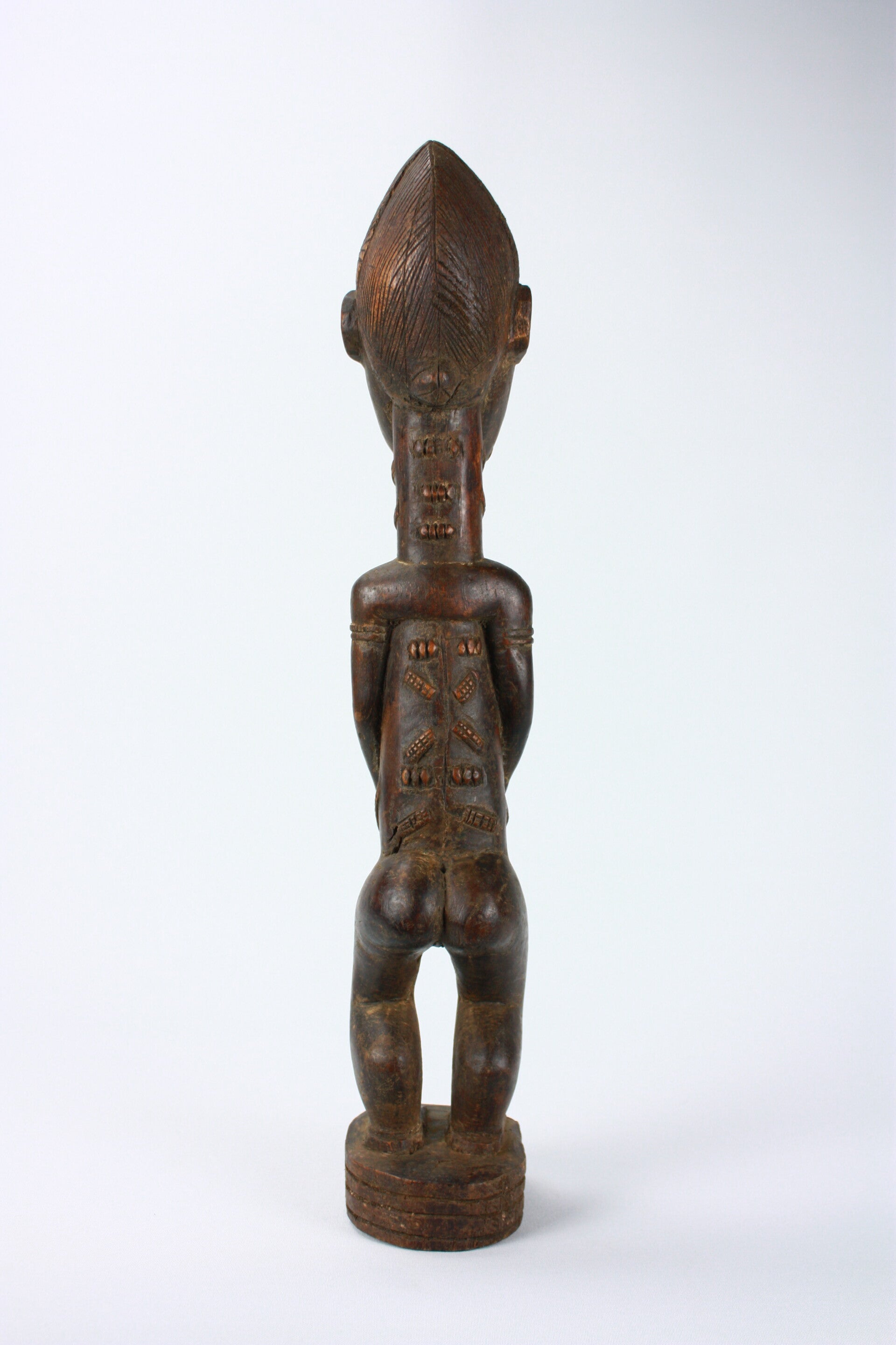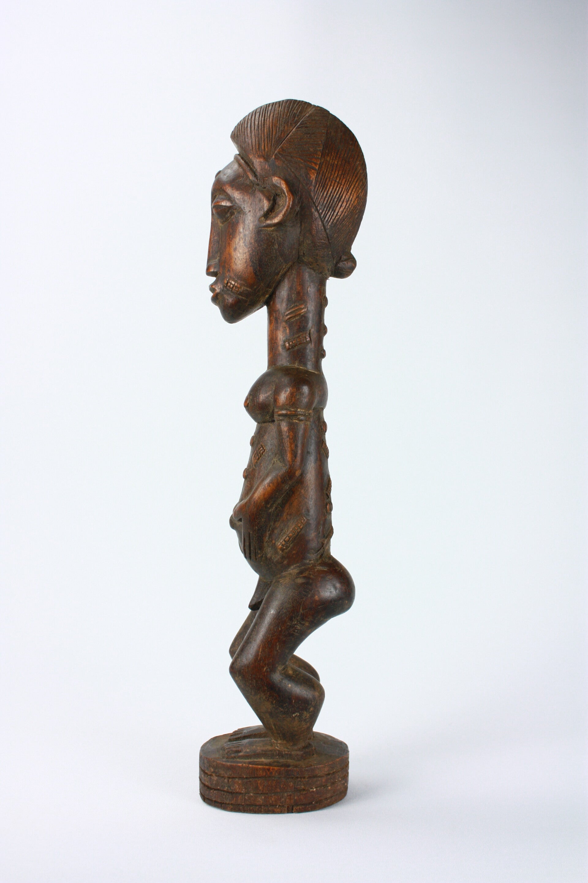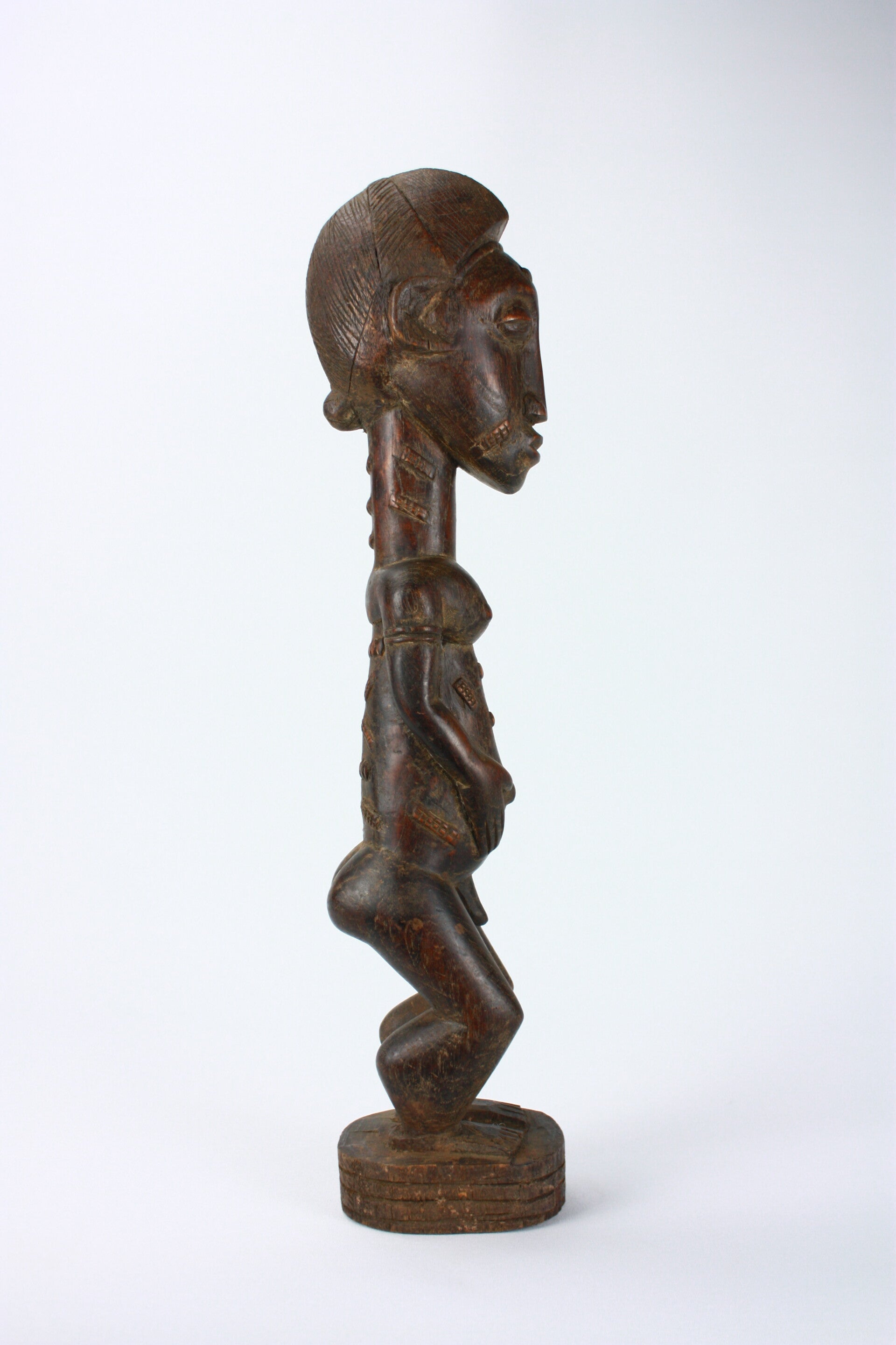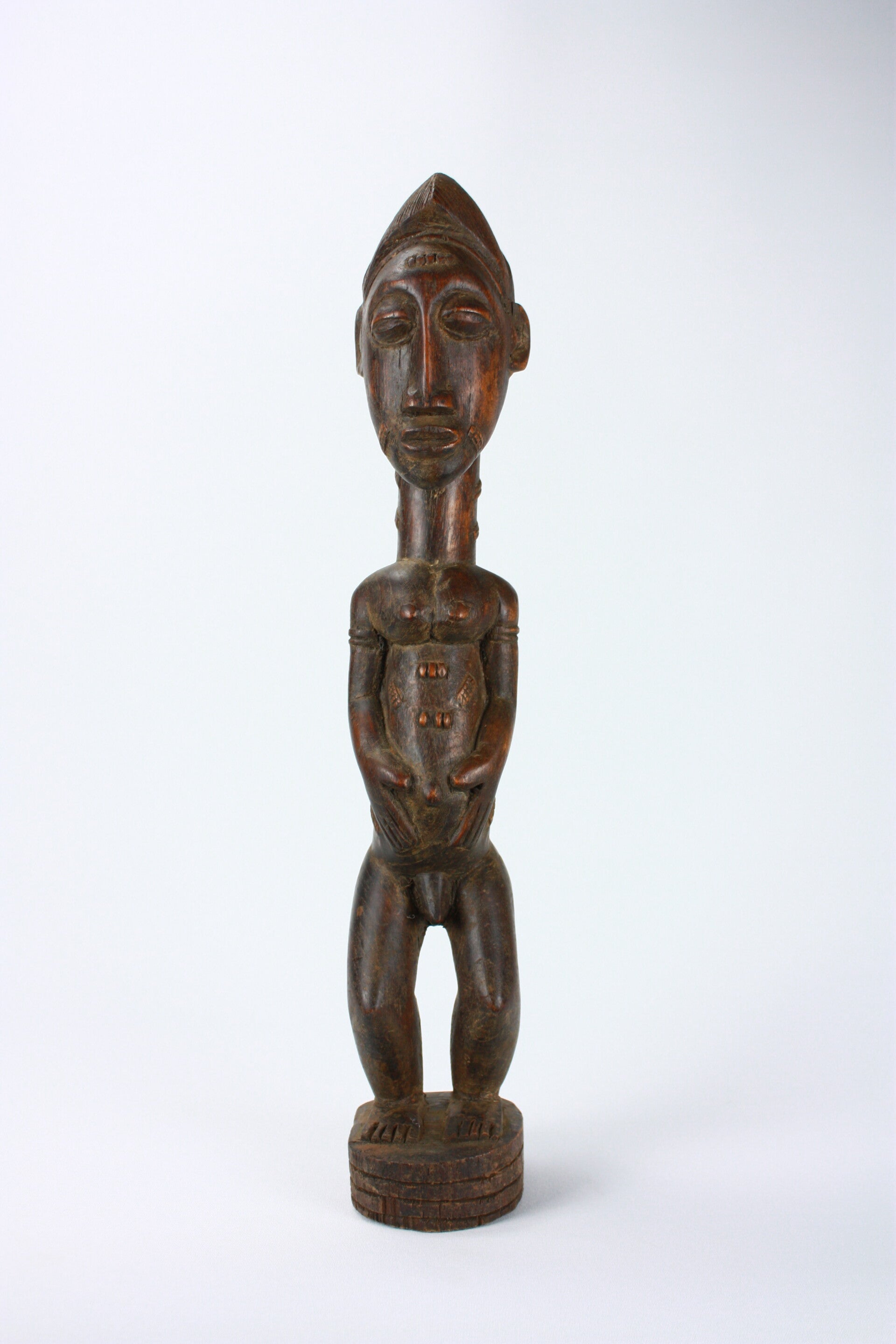A traditional male statue from the Baule people, notable for its balanced proportions and carefully articulated features. The piece reflects the enduring artistic discipline of Baule woodcarvers and would sit comfortably within a focused collection of West African figurative sculpture.