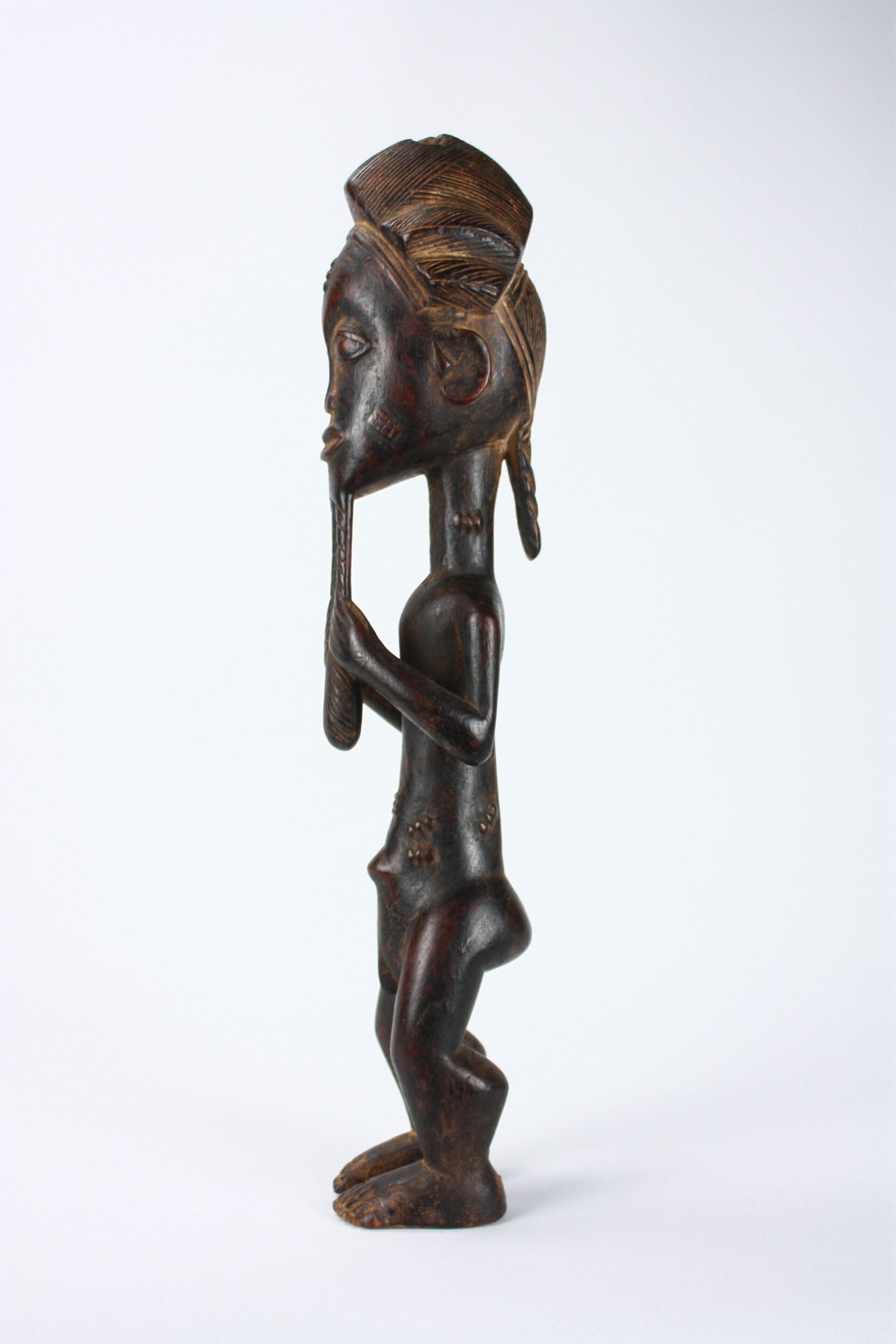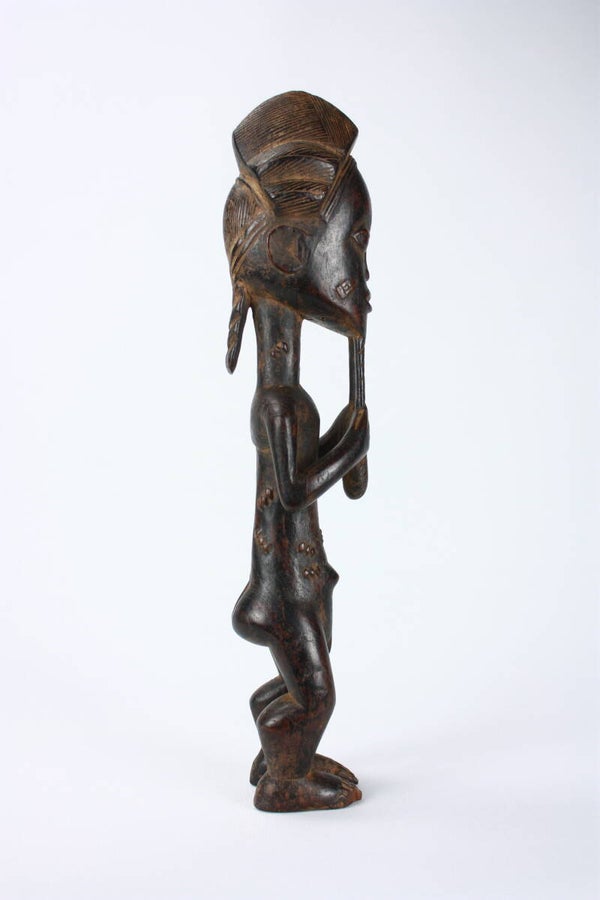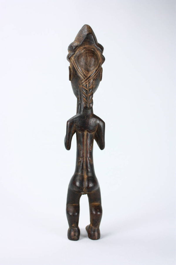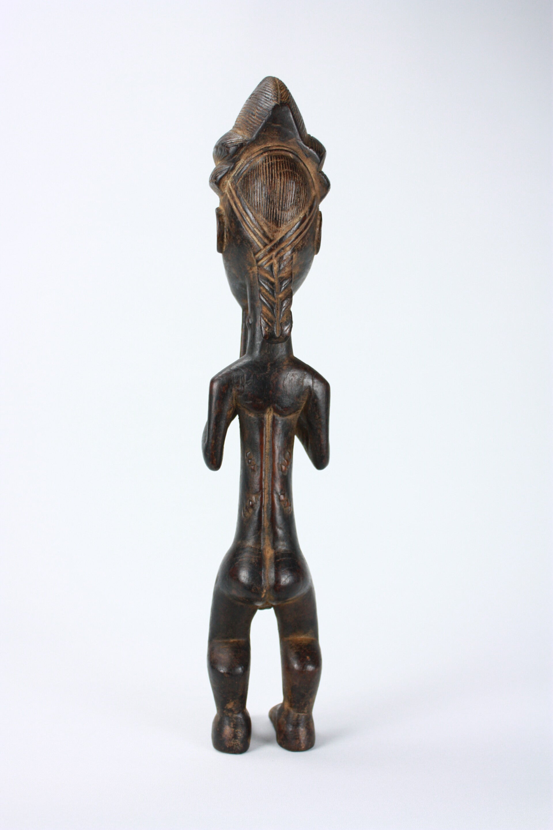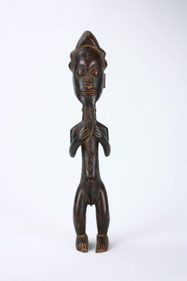 This authentic Baule male sculpture conveys quiet authority through its upright posture and composed demeanor. The figure exemplifies the sculptural balance and spiritual undertone that characterize Baule statuary, making it suitable for advanced private collections or curated displays.