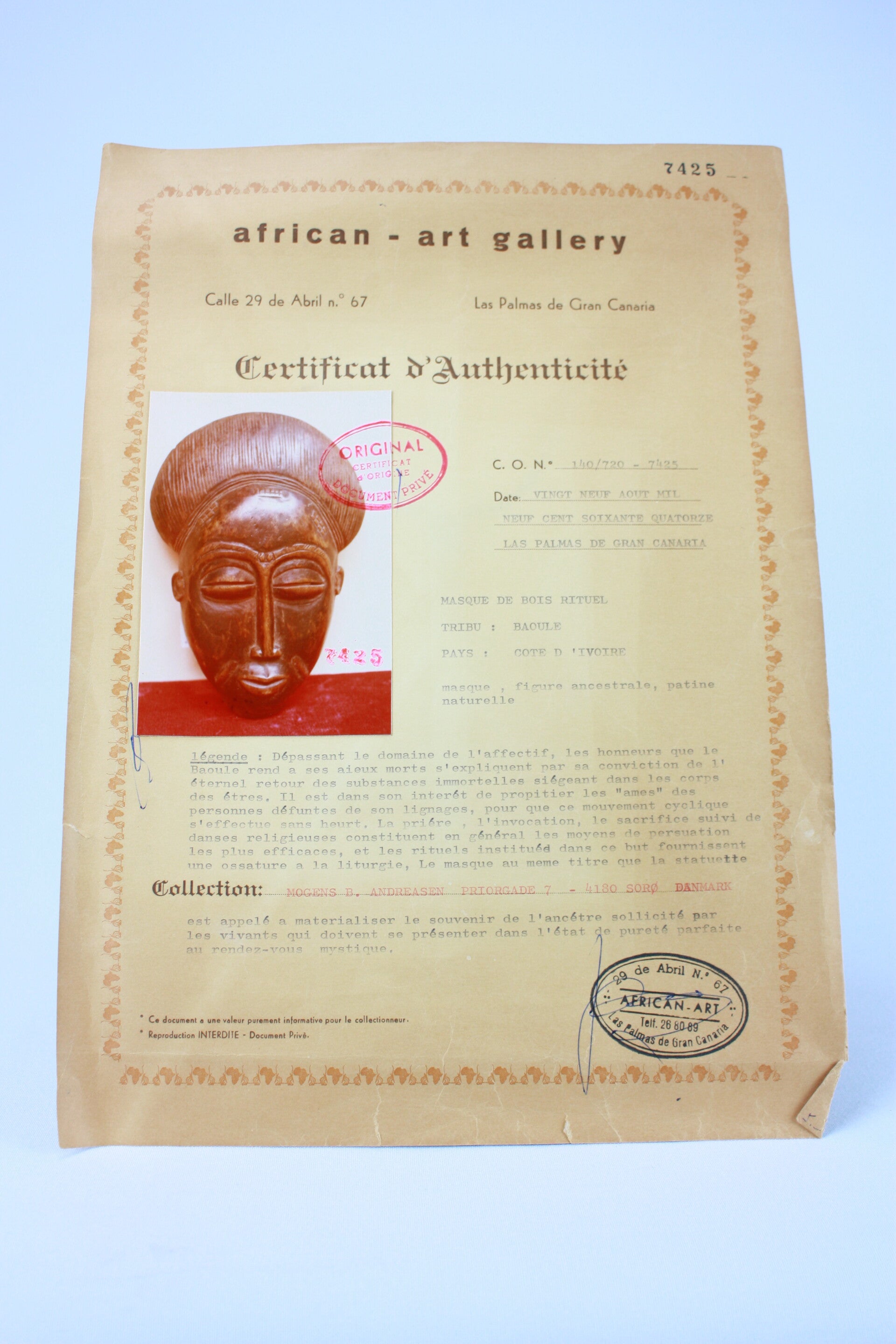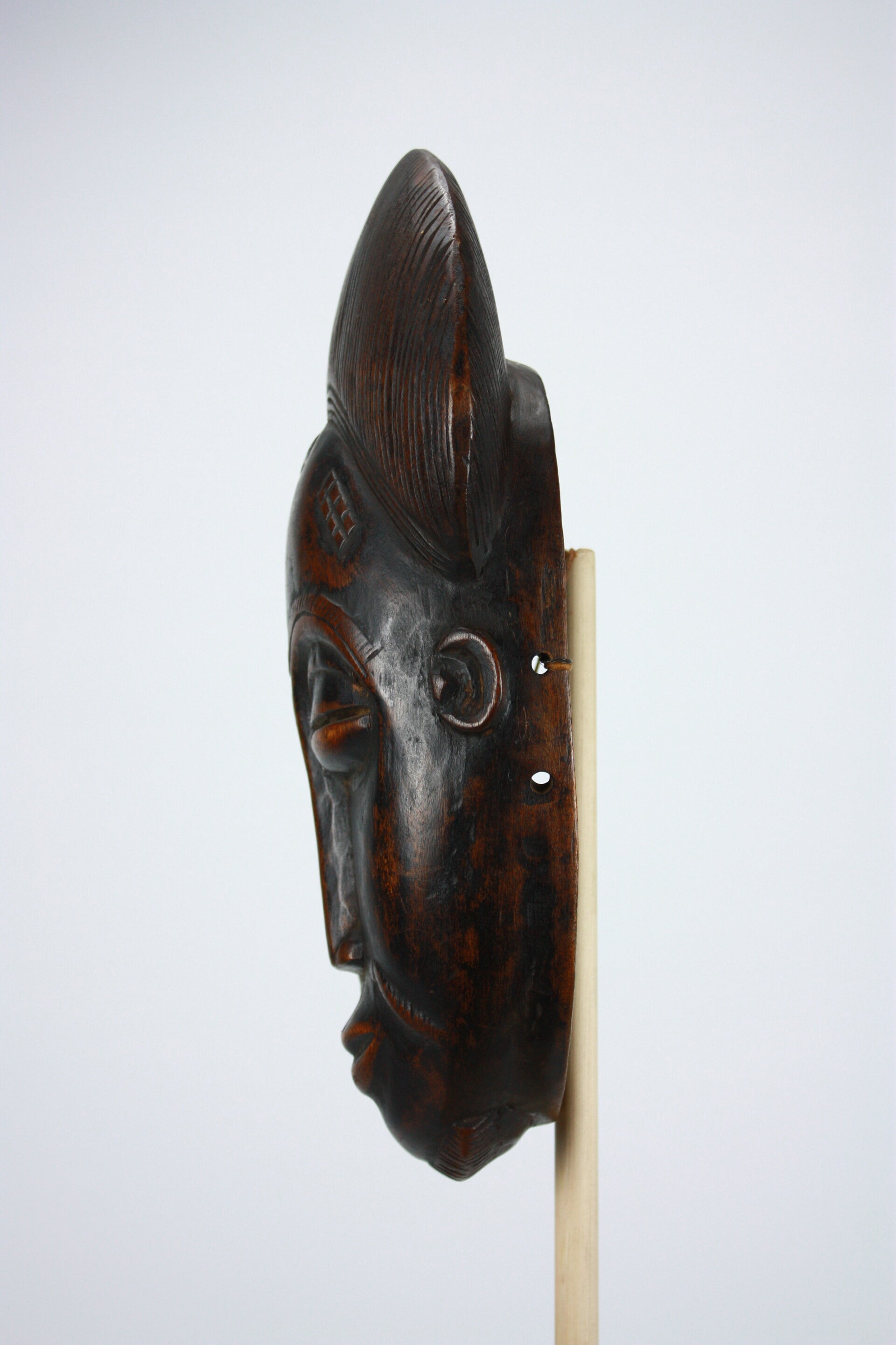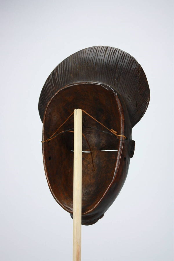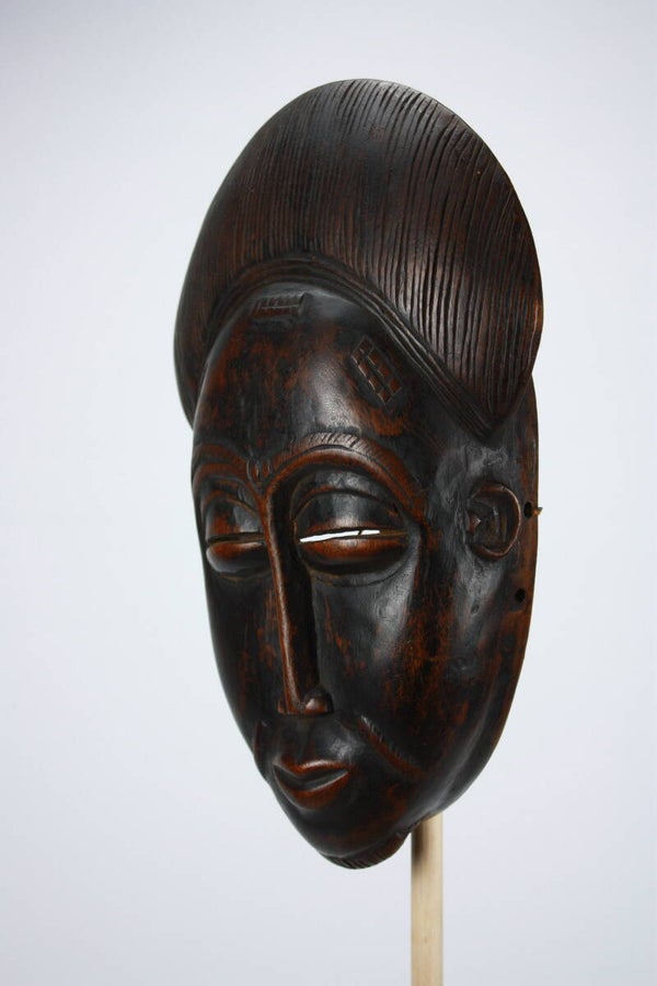 A traditional Baule mask from Ivory Coast, carved with refined symmetry and an introspective expression. Baule masks are celebrated for their elegance and spiritual resonance, and this example reflects the aesthetic sophistication that has secured Baule masking traditions a place in prominent museum holdings.