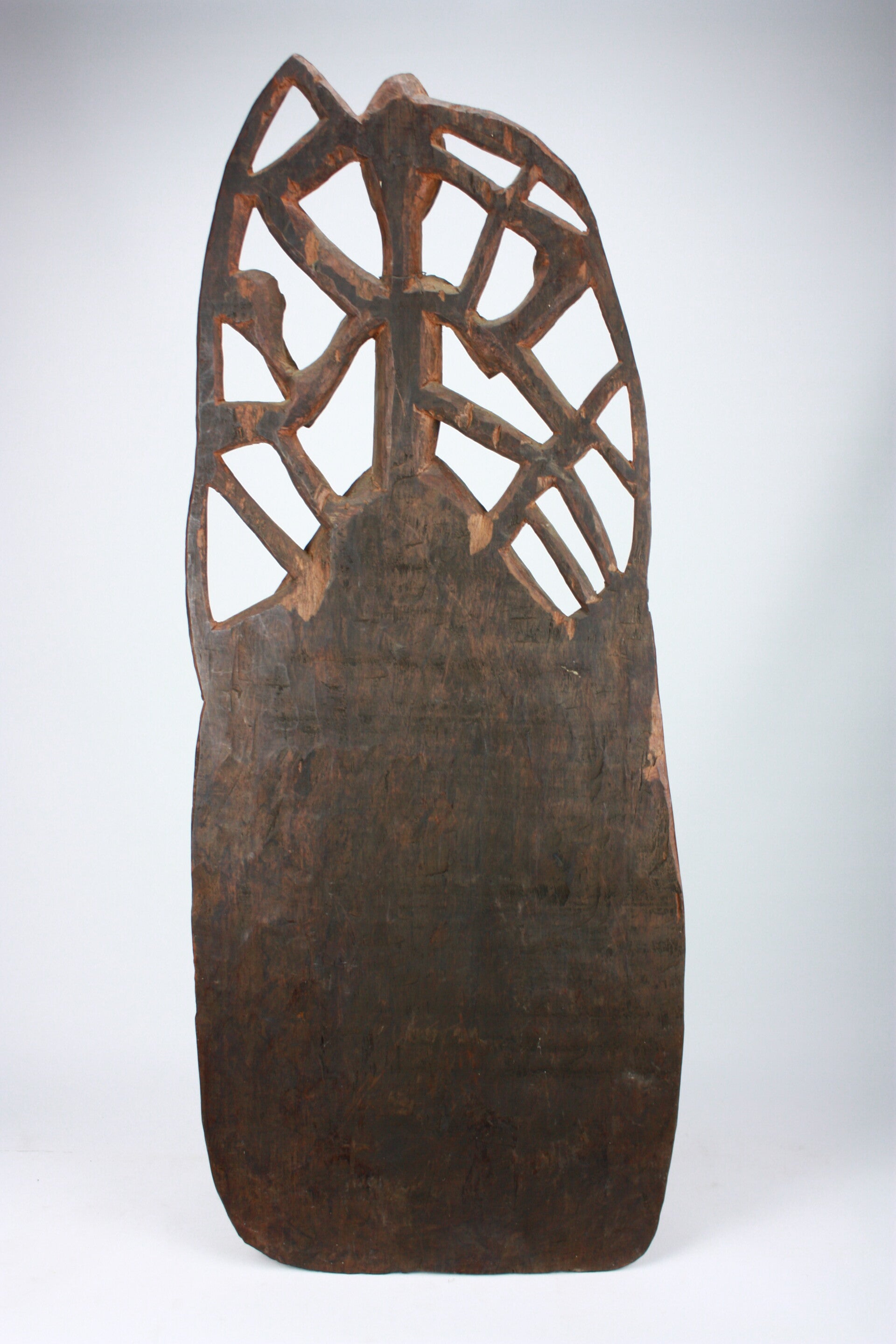 Carved wooden ceremonial shield surmounted by an openwork ancestral figure framed within a lattice structure. The shield body is decorated with incised zigzag motifs typical of Asmat clan symbolism. The sculptural superstructure suggests ritual display rather than combat use.