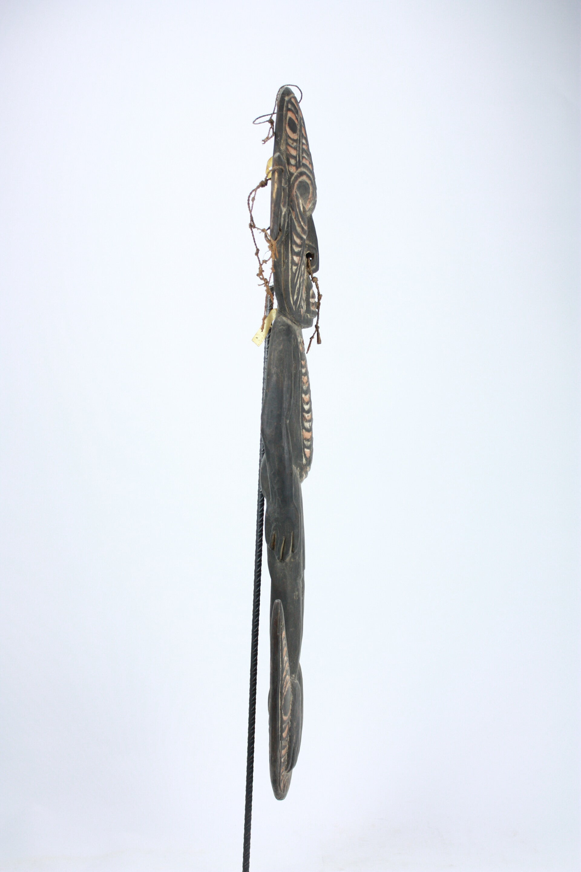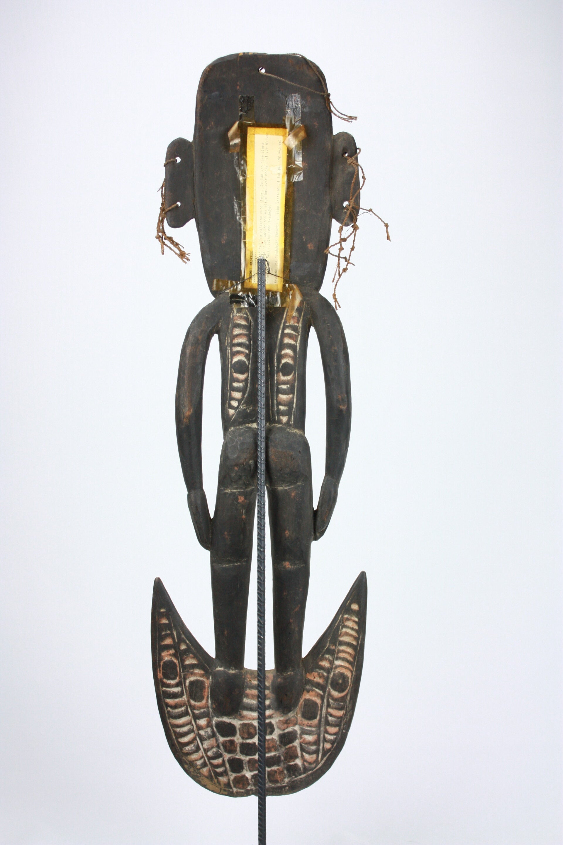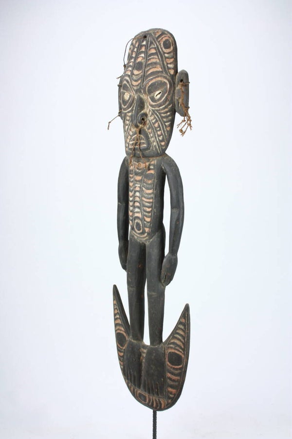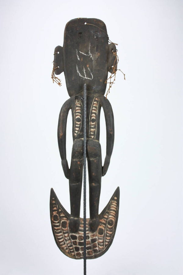 The crescent-shaped base is carved with spirit imagery, and the figure was designed to be suspended in a ceremonial men’s house. Works of this type are associated with ancestor veneration and clan identity within the Sepik River cultural tradition.