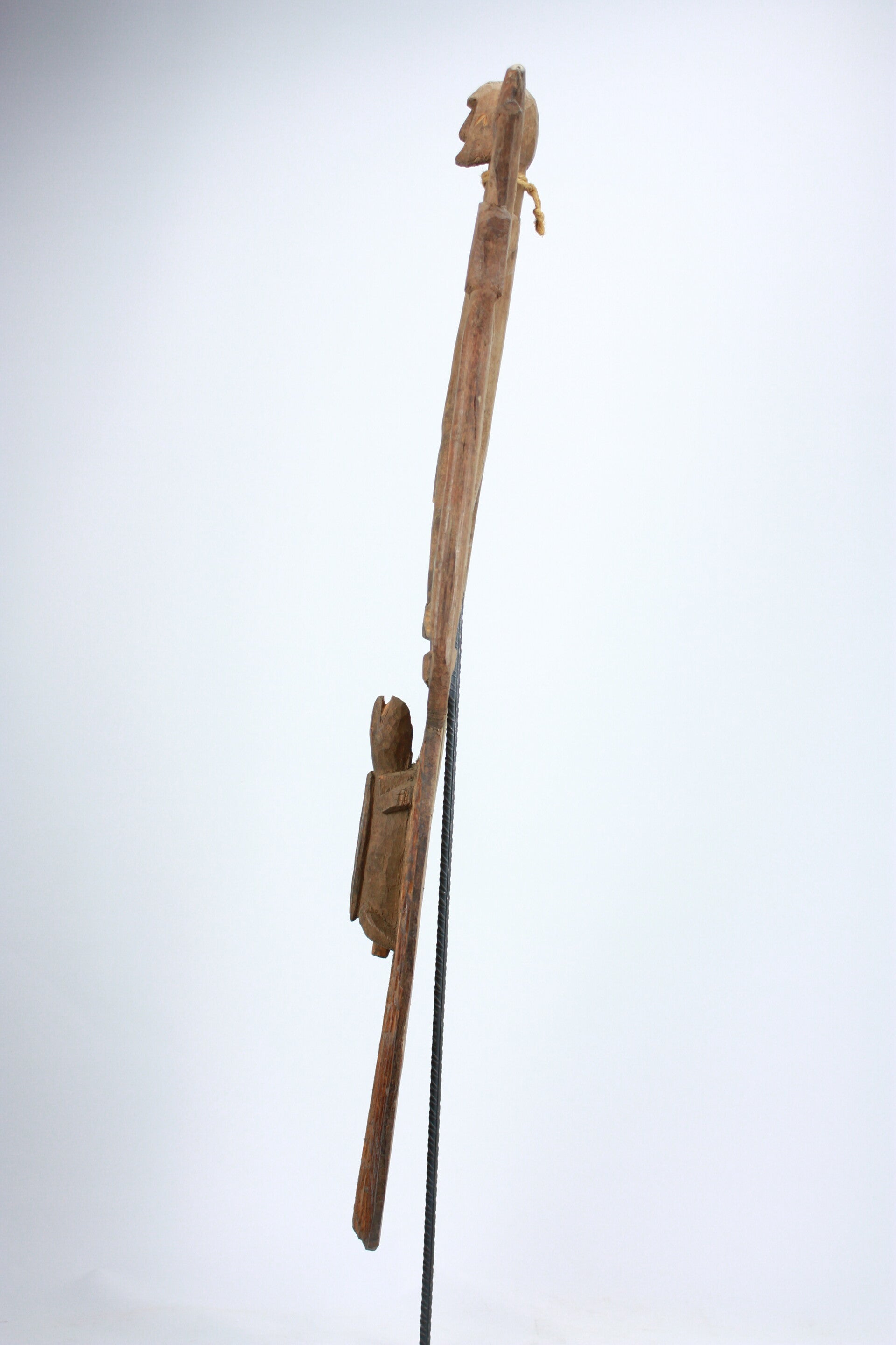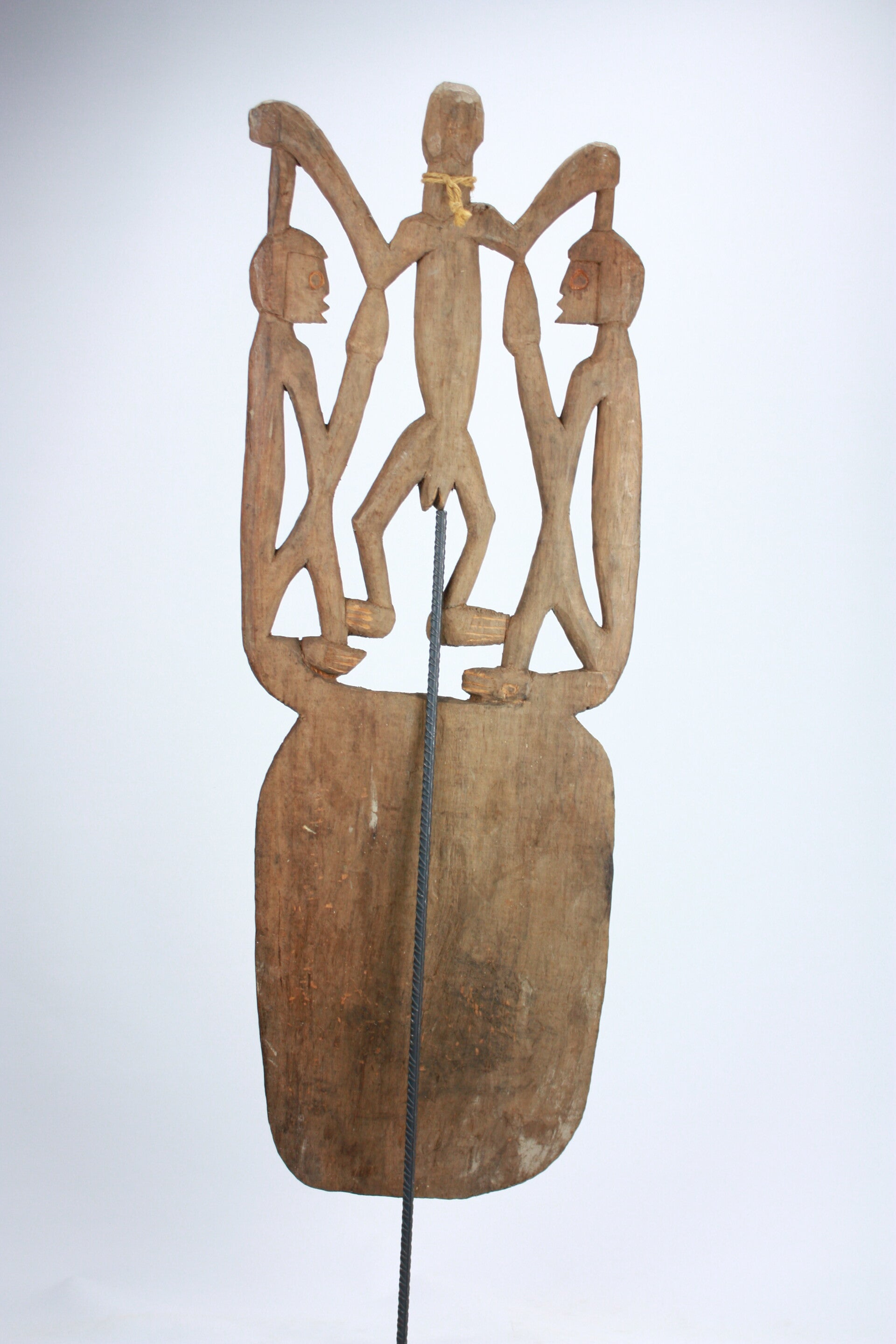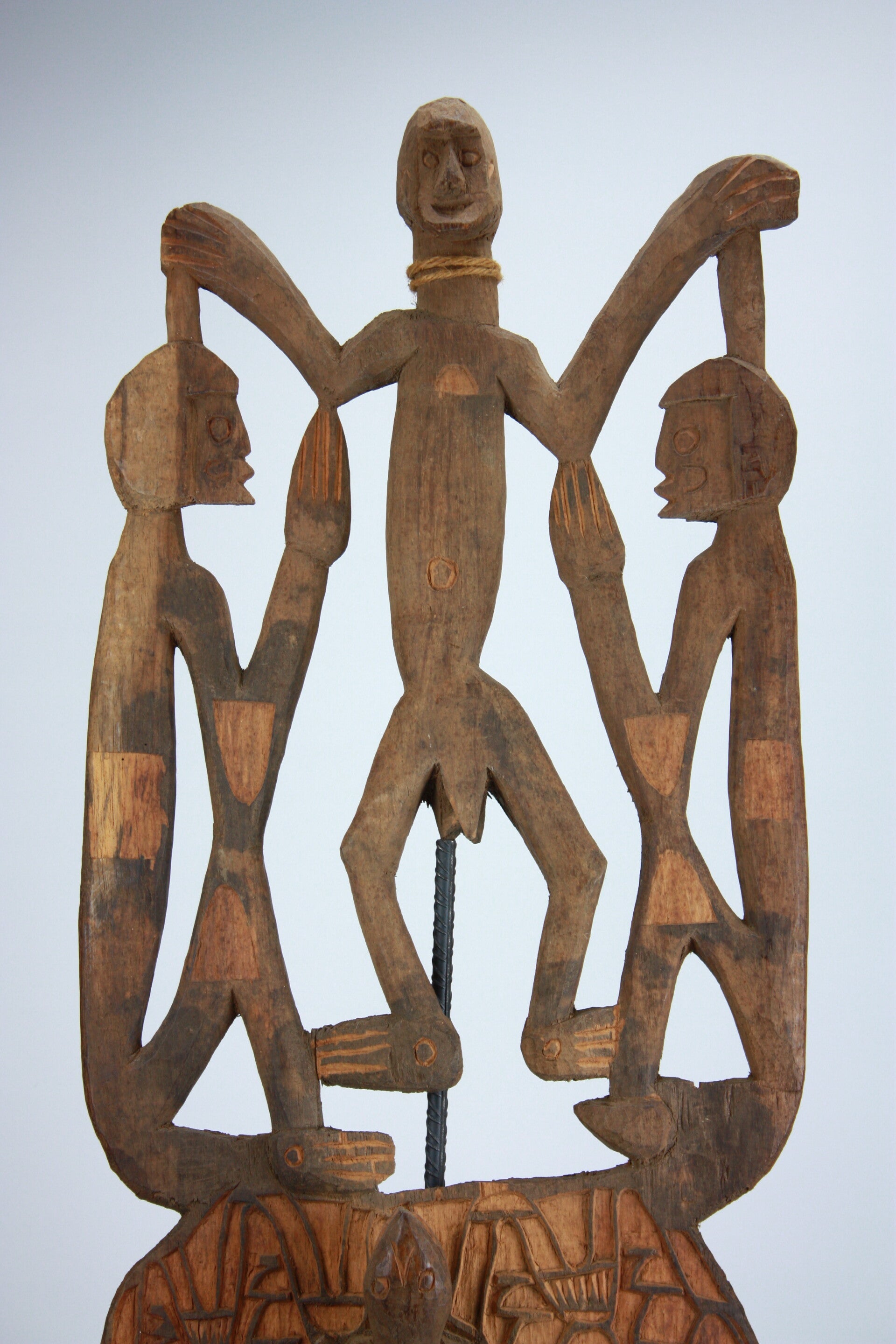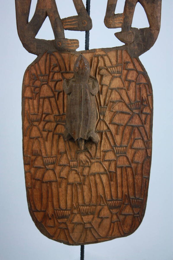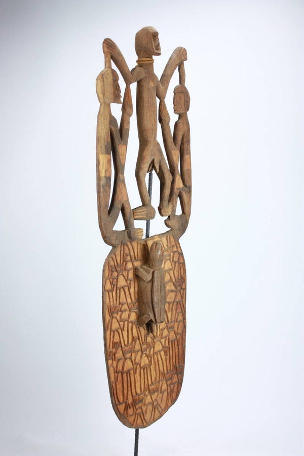 Carved wooden ceremonial shield surmounted by three stylized ancestral figures. The shield body is densely decorated with geometric and clan-related motifs and features an applied spirit figure in relief. The elongated proportions and carving style are characteristic of Asmat sculptural tradition.
