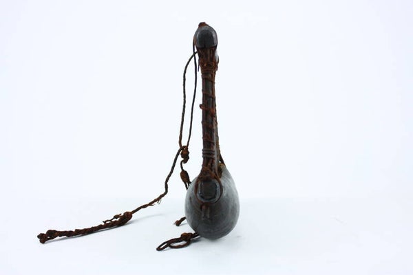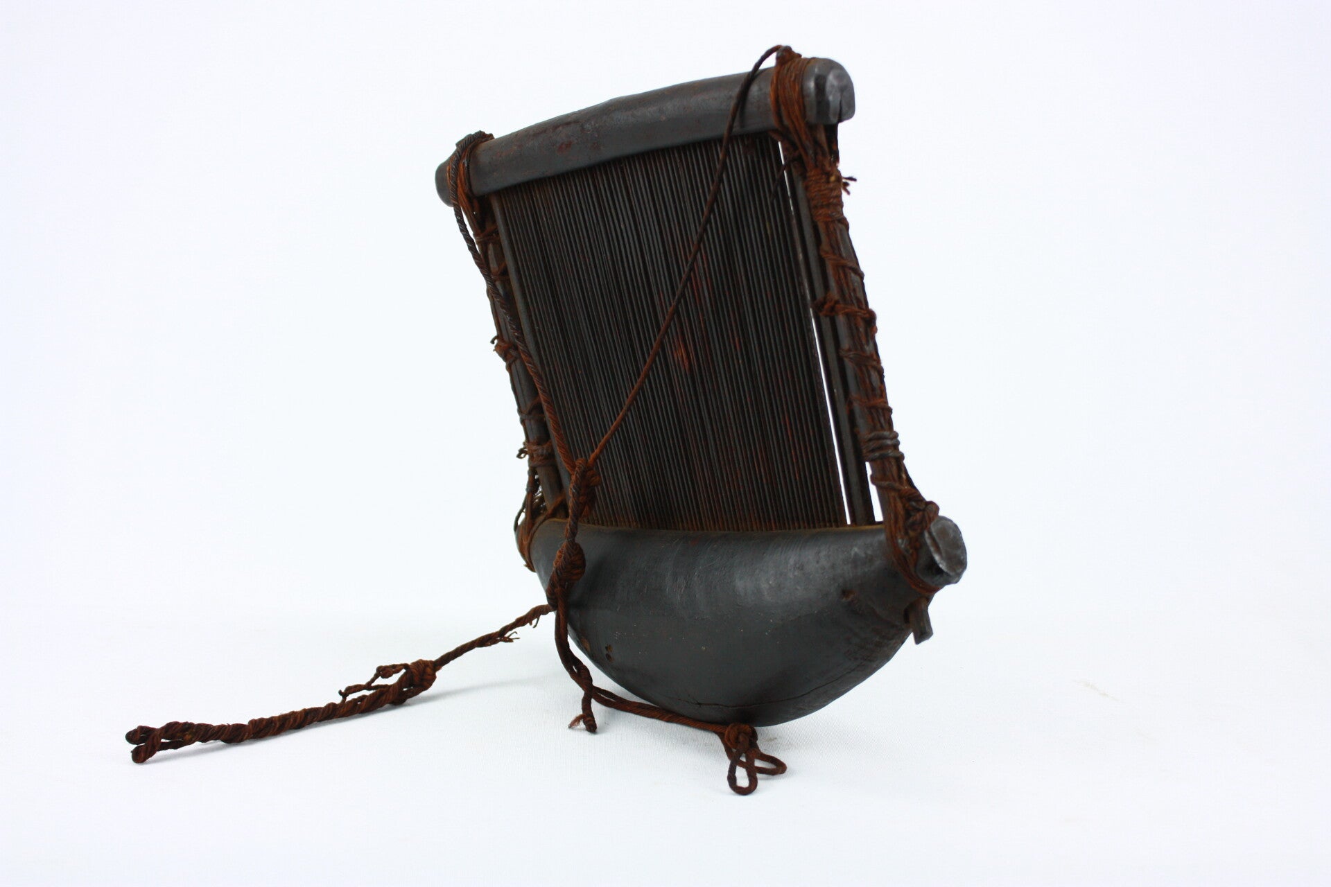 Traditional narrow-strip loom used by Baule weavers in Côte d’Ivoire. The hand-carved wooden frame holds tightly stretched vertical warp threads, secured with natural fiber bindings. The curved lower section rests against the body, allowing the weaver to control tension during the weaving process.