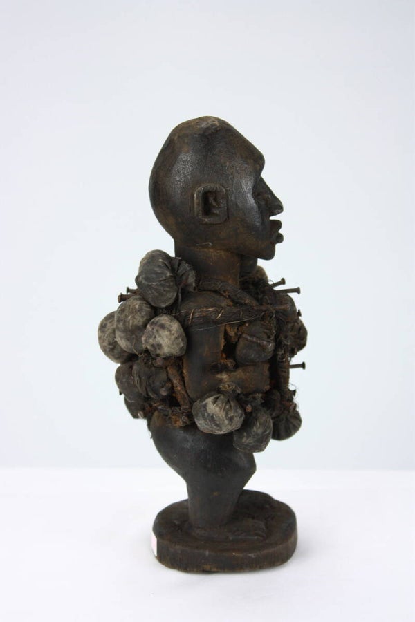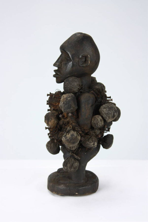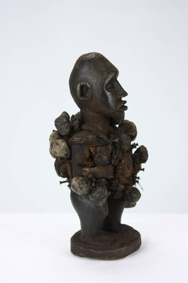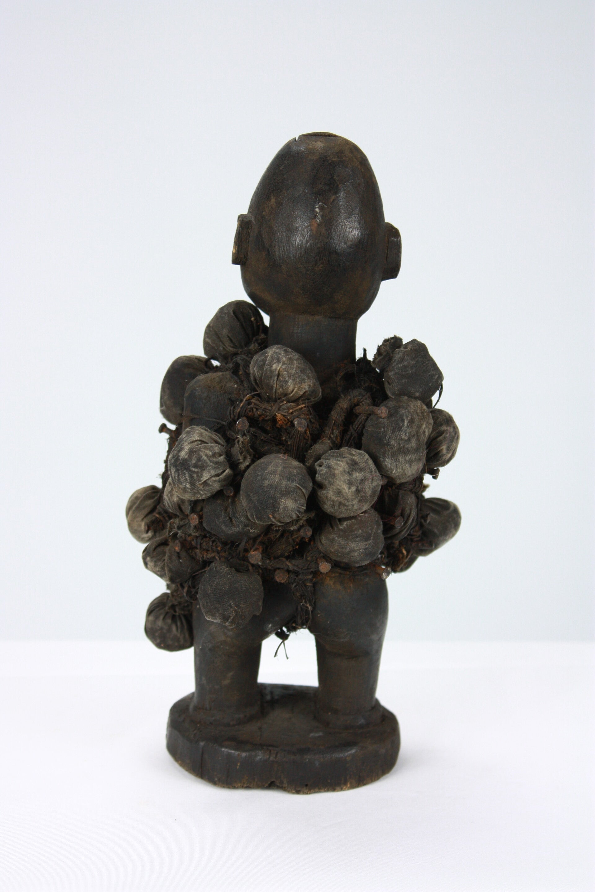 Such figures were empowered through the insertion of medicinal and symbolic substances, serving protective, judicial, or oath-related functions within community life. The layered surface, oxidized nails, and aged organic materials indicate prolonged ritual use.
