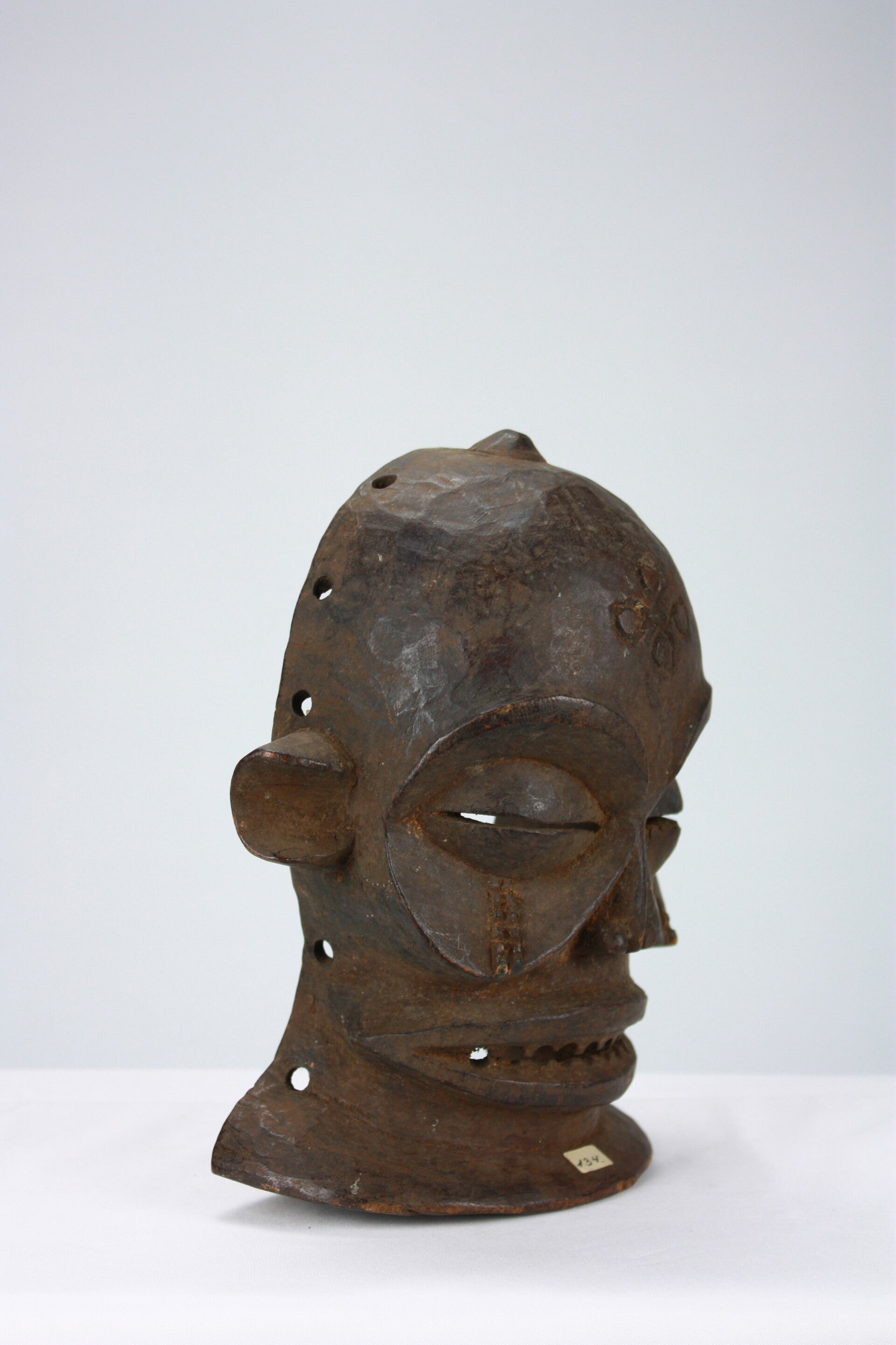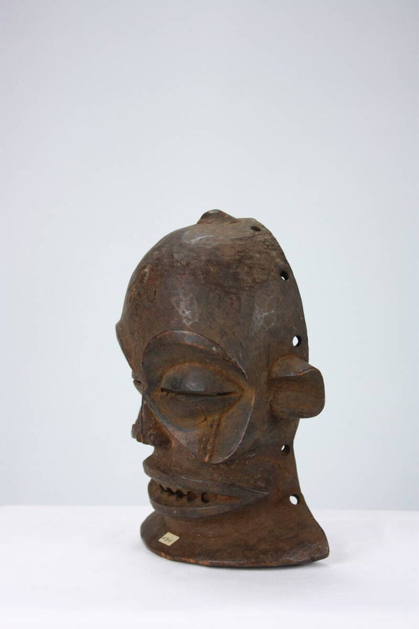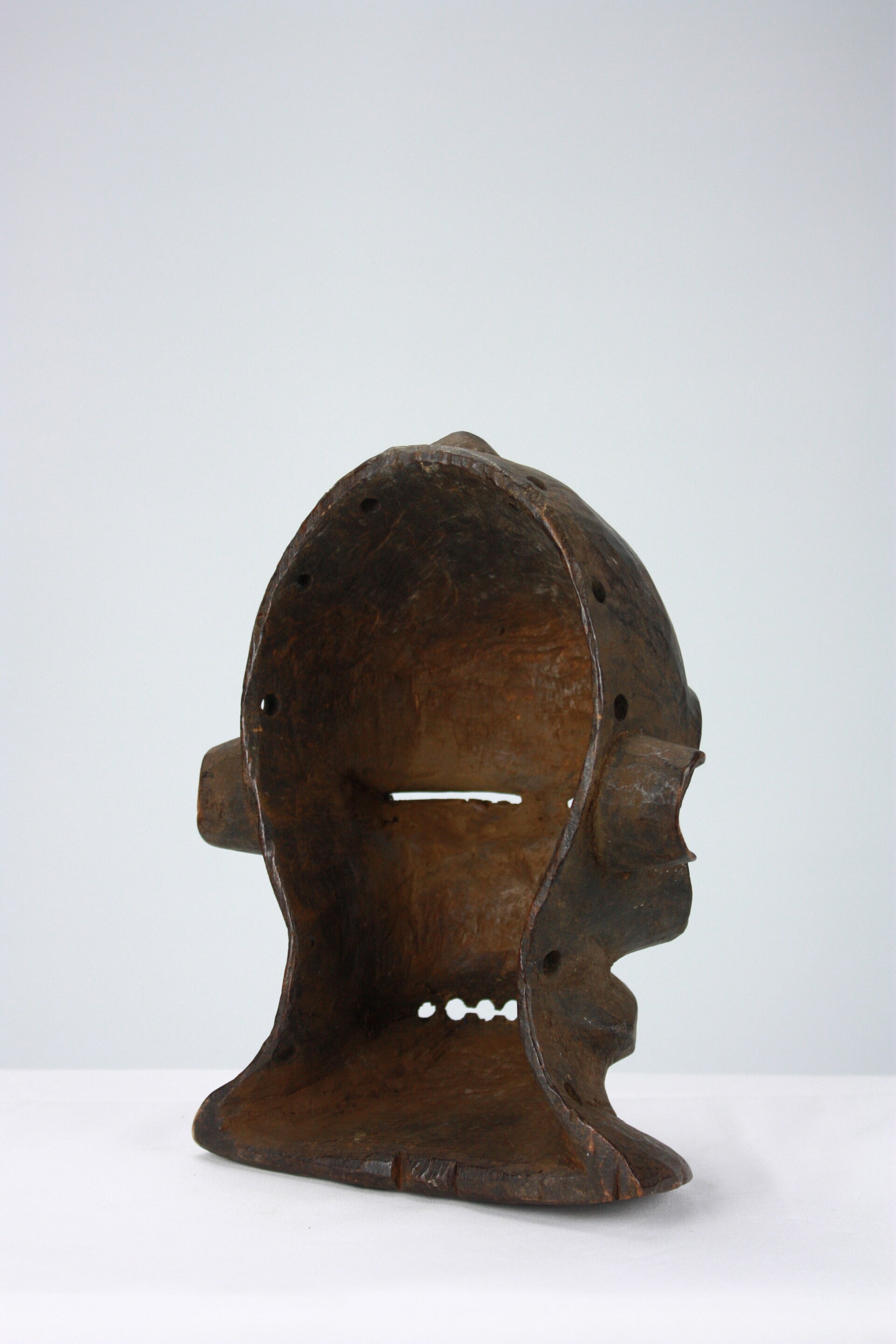 Rich, darkened patina consistent with age and handling contributes to its visual presence, making this mask head both a compelling collector’s object and an evocative example of Central African masquerade artistry.