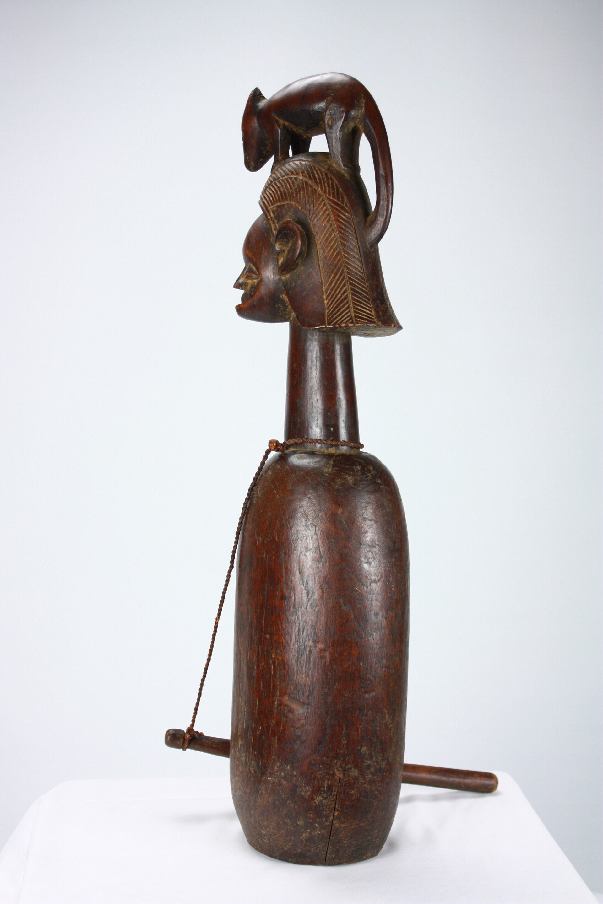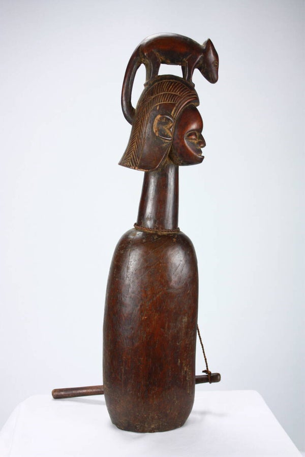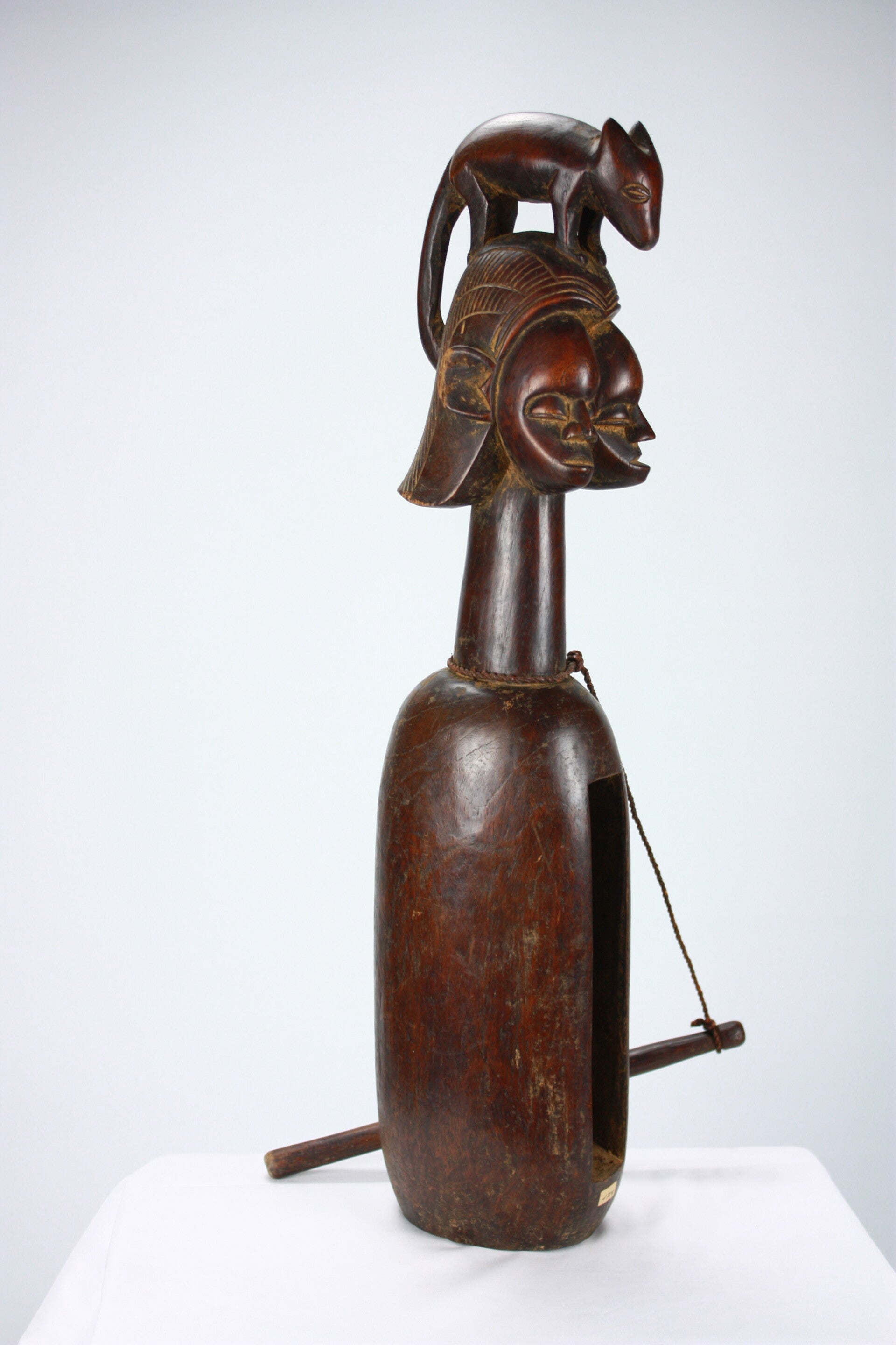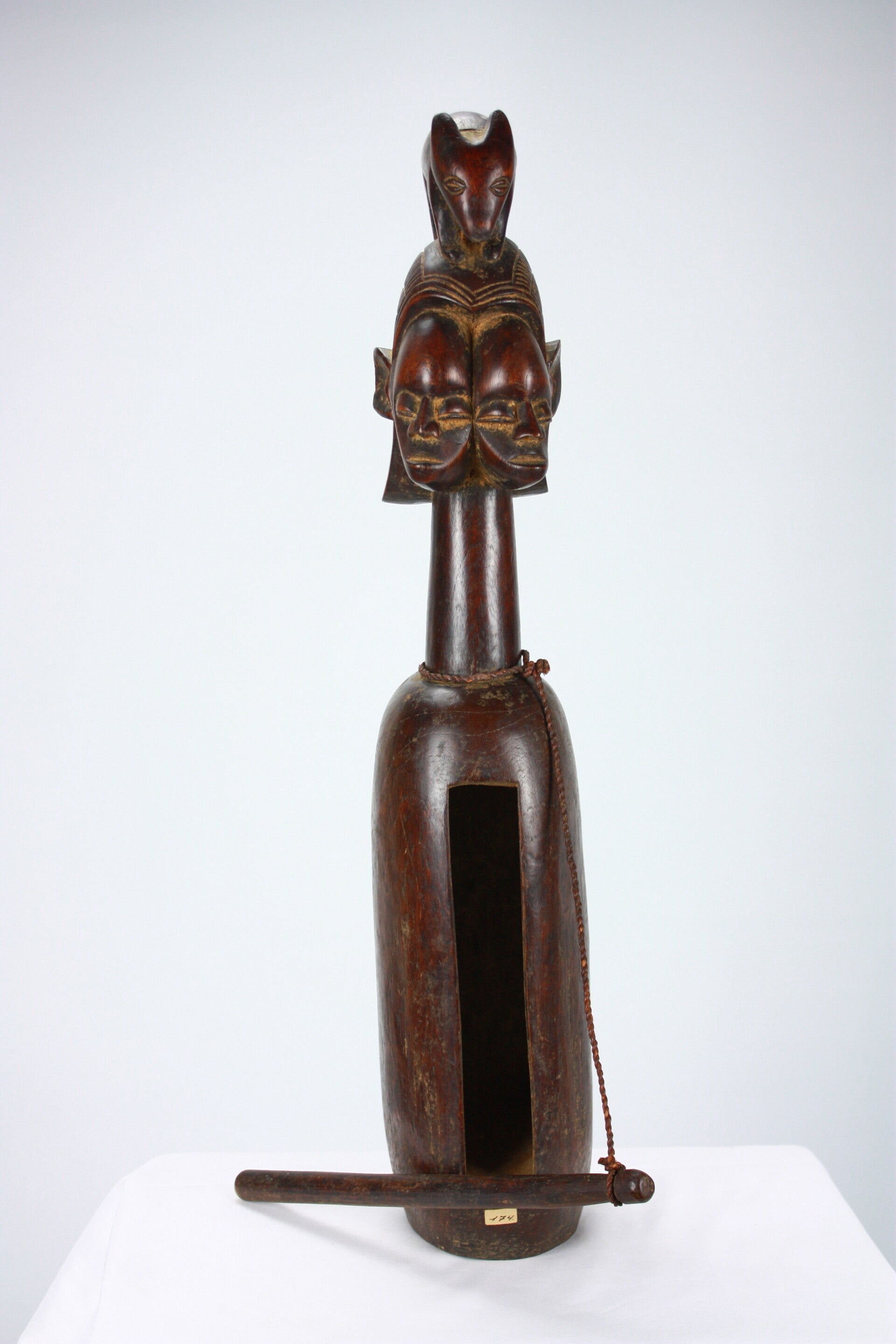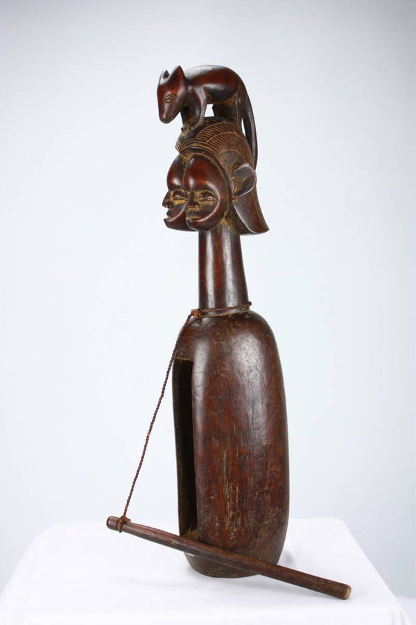 Rare Yaka diviner’s slit drum, carved from a single block of wood with a hollowed resonating body and vertical slit opening. The elongated neck supports a sculptural finial featuring janus-style faces surmounted by an animal figure, a composition associated with divination practices among the Yaka.