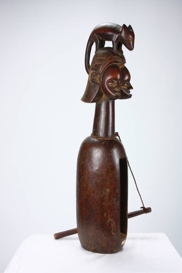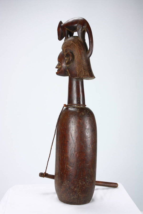 The surface shows consistent wear and age-related marks, enhancing authenticity and character. A striking and uncommon example of Yaka ritual art, combining musical function with powerful symbolic imagery.