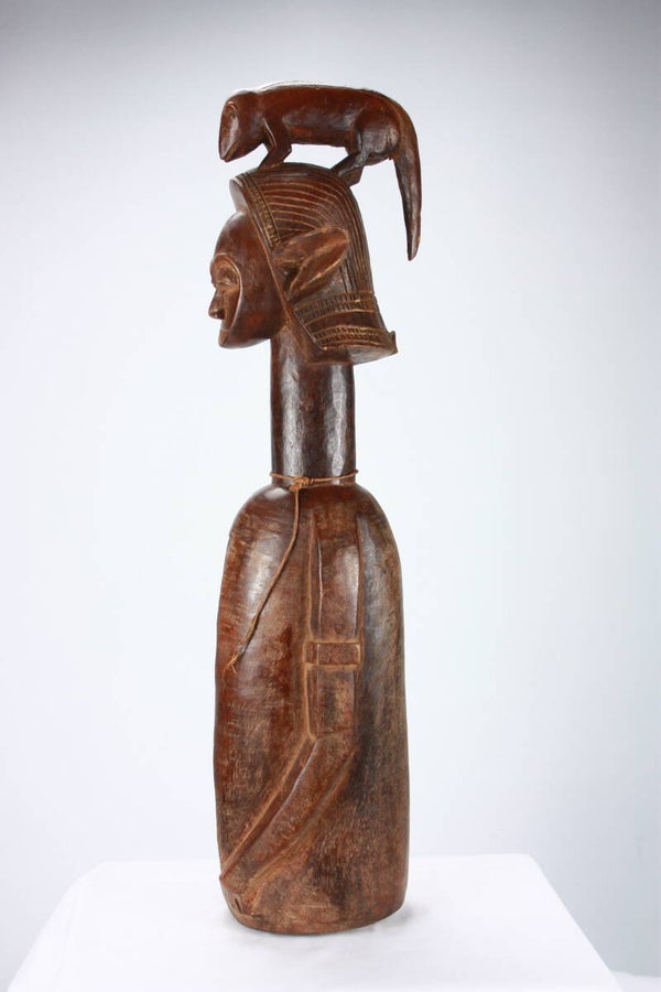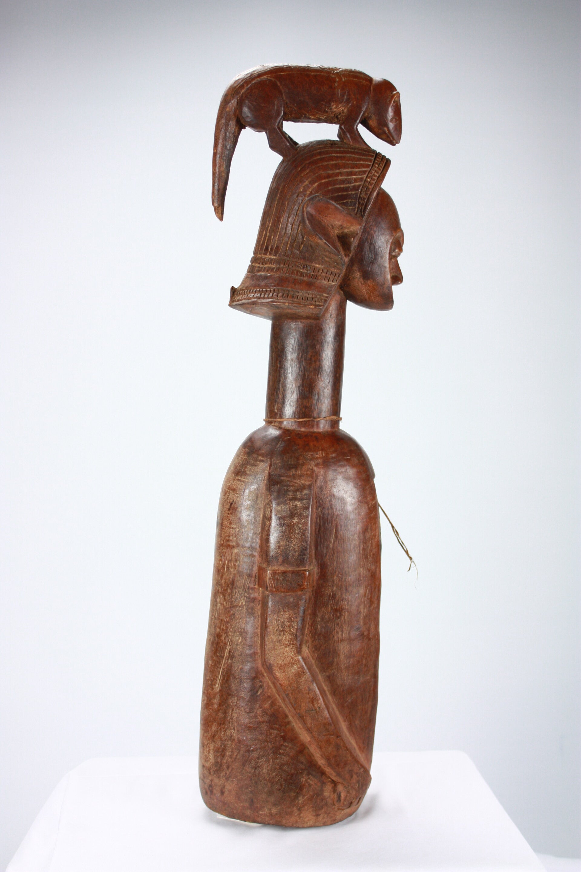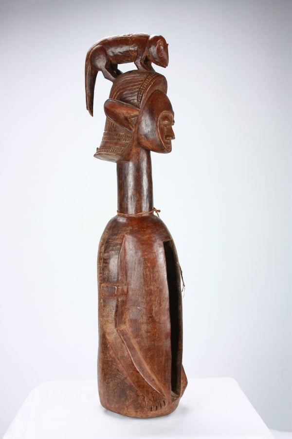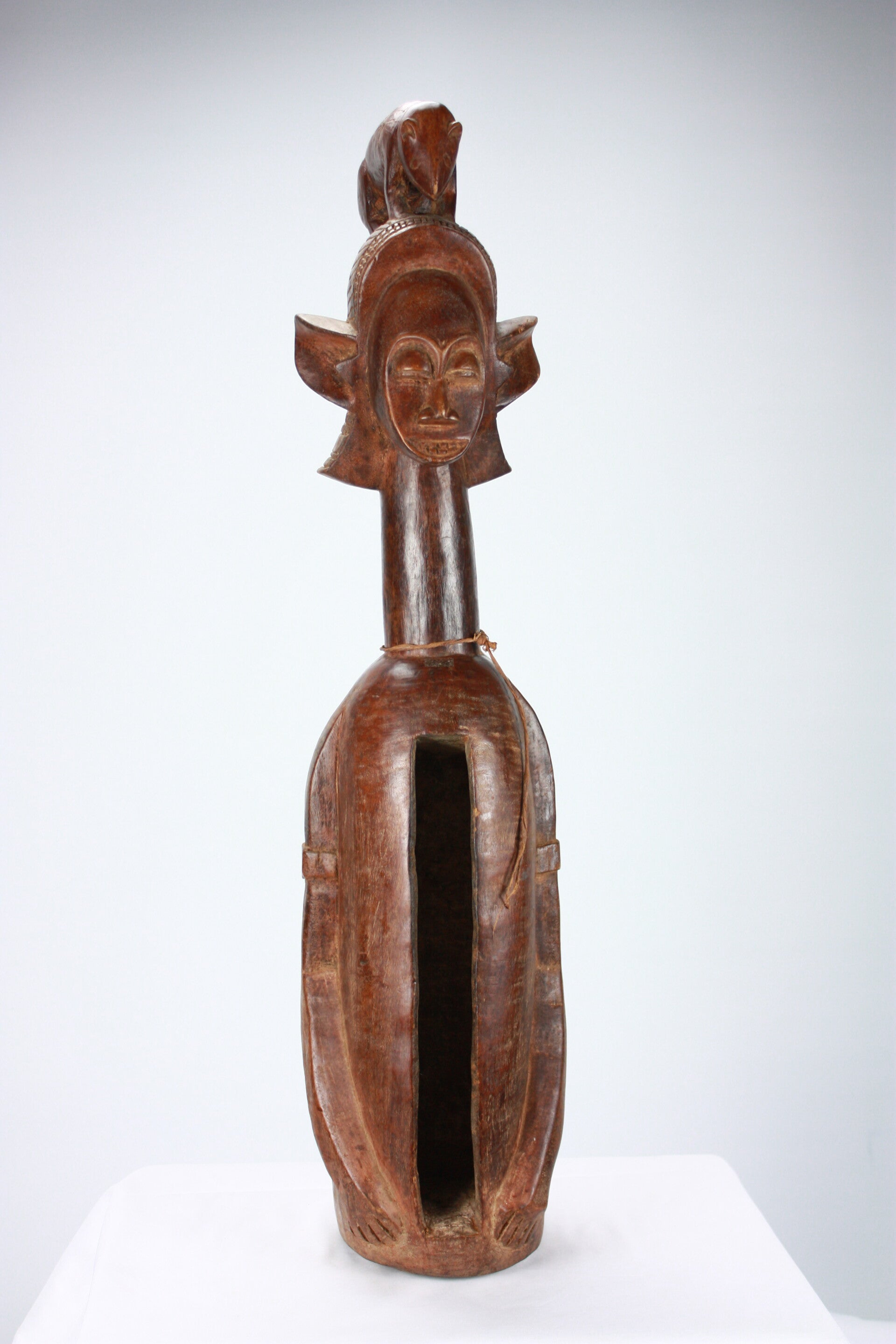 Impressive Yaka diviner’s slit drum surmounted by a finely carved single head crowned with an animal figure. The elongated neck and carefully incised coiffure create a refined vertical silhouette, while the deep resonating slit emphasizes its original ritual function.