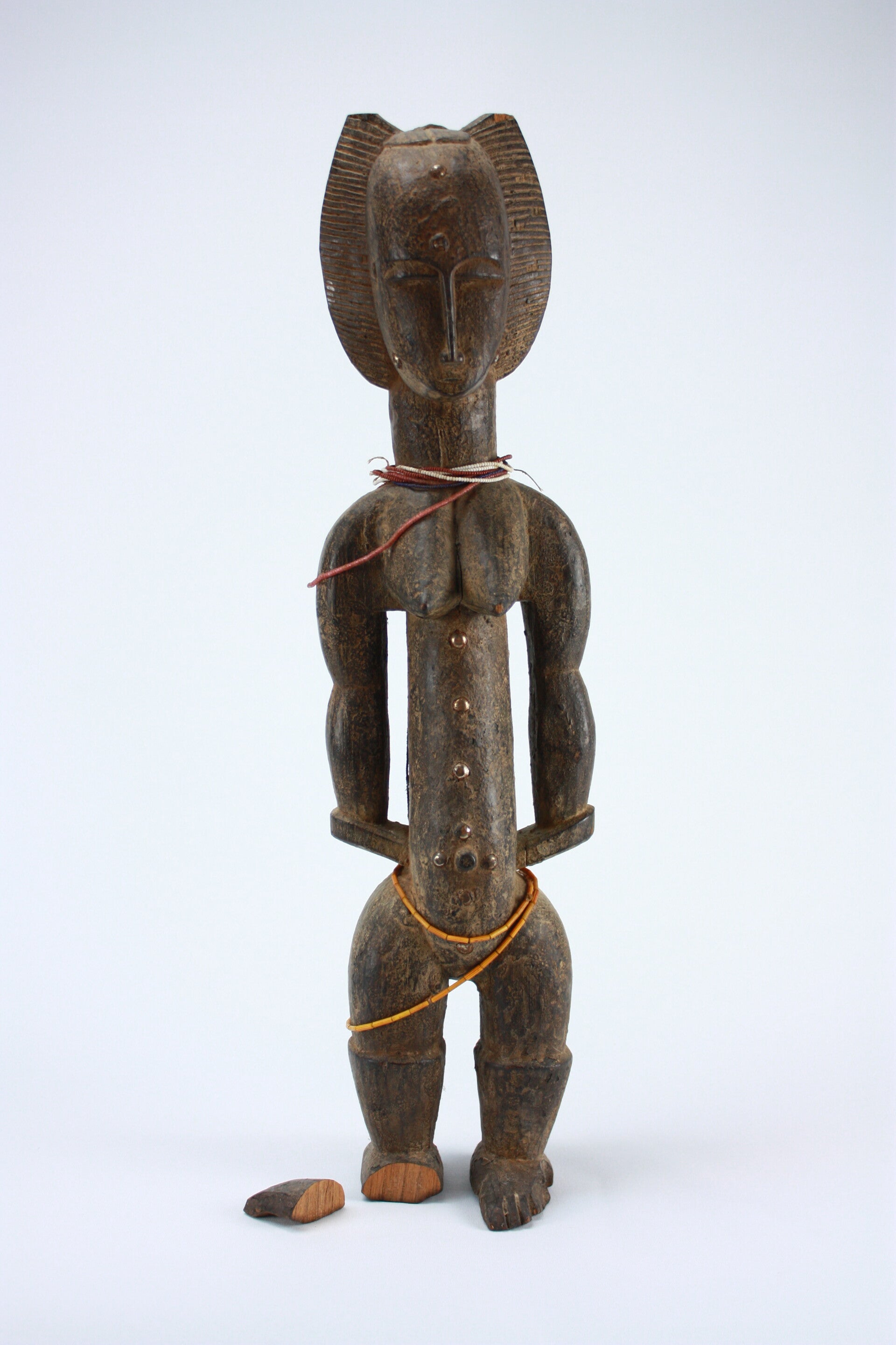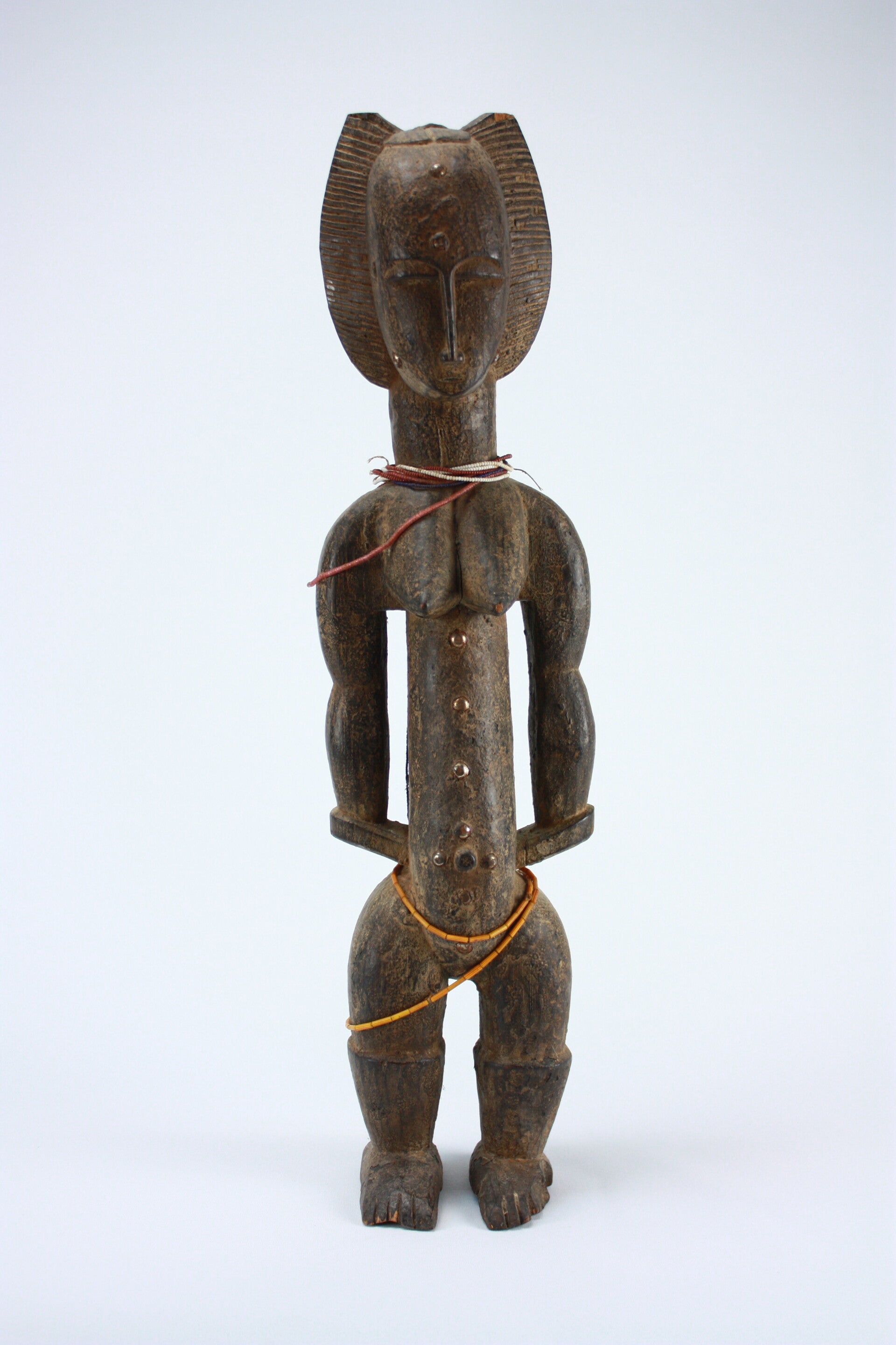 Powerfully carved standing female figure with pronounced cylindrical torso, strong arms held close to the body and a large, flaring coiffure framing the head. The facial features are stylized and geometric, with narrow, half-closed eyes and a long straight nose. Small metal studs accent the face and torso, adding subtle decorative emphasis.