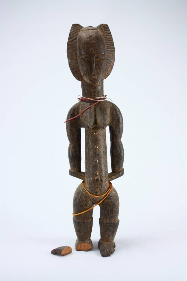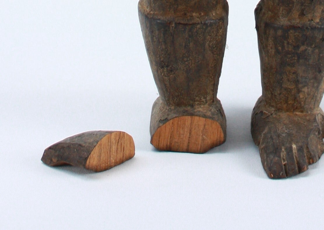 An old break to one foot is present; the detached fragment is preserved. The break is clean and consistent with age-related wood stress.