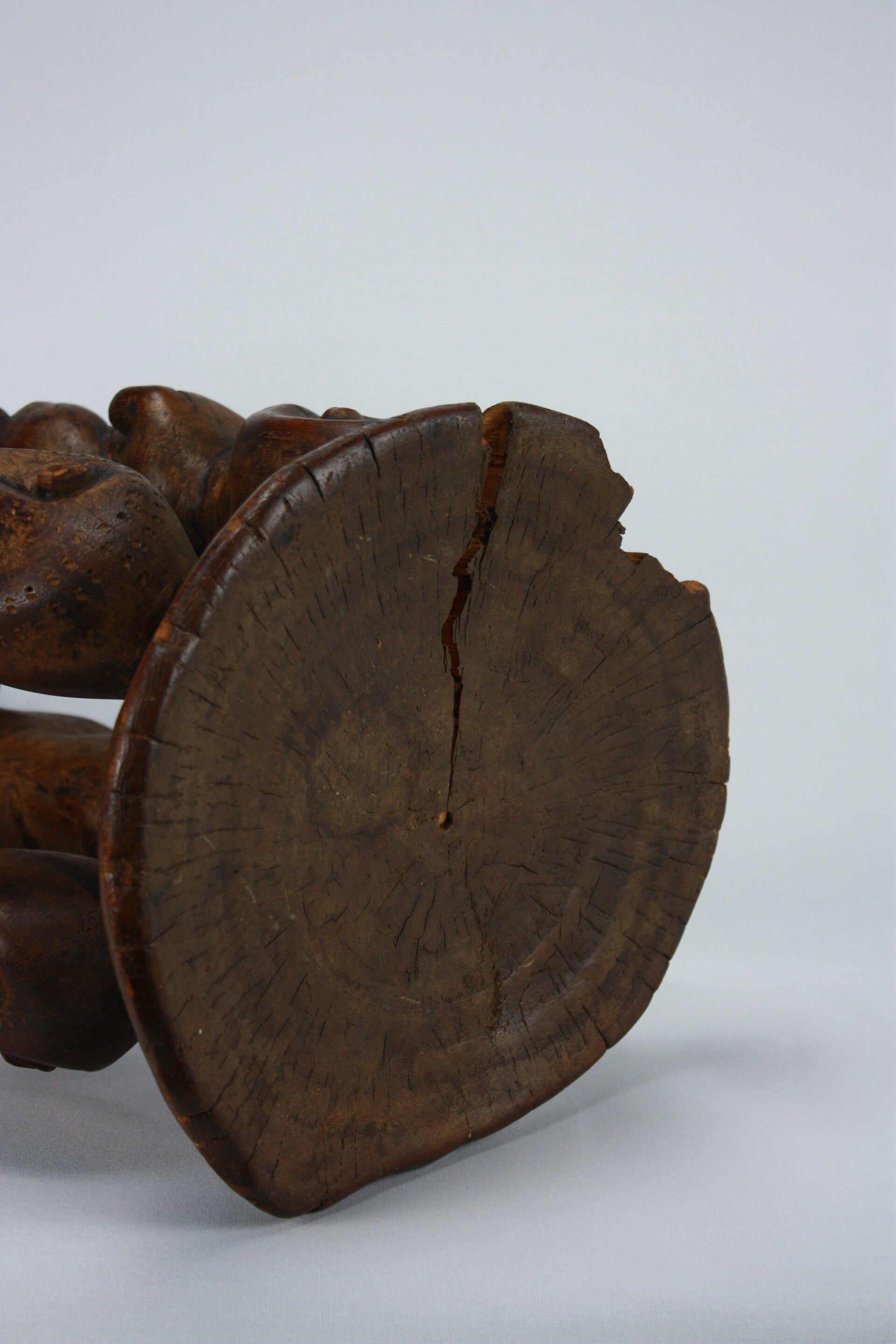 The figures are rendered with rounded, volumetric bodies, stylized facial features and subtle scarification marks. The thick circular seat rests firmly above, creating a compact and architecturally balanced form. The sculpture is carved from a single block of wood.