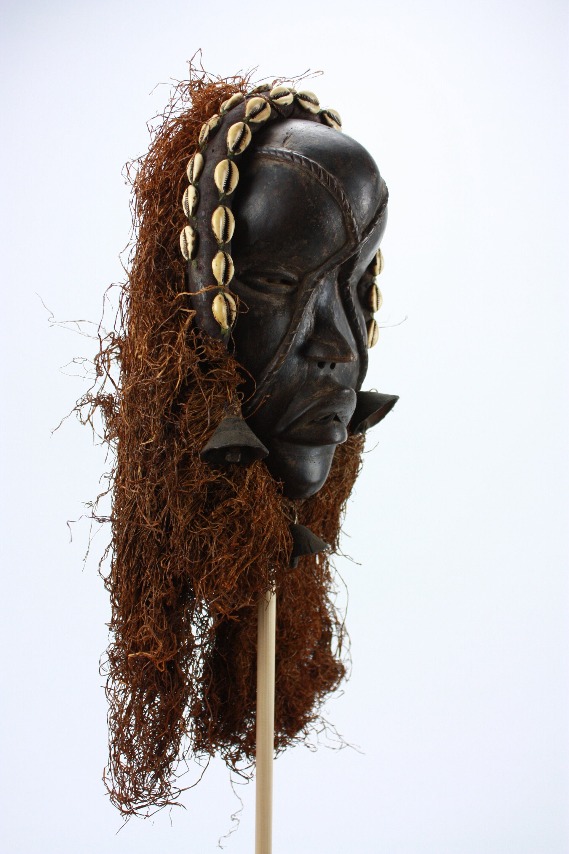 The headdress is bordered with cowrie shells arranged along the rim, symbolizing wealth and spiritual value. Preserved raffia fiber costume elements frame the face and extend below the chin, giving the mask dynamic vertical presence. Small metal bells are attached at the sides and beneath the chin, suggesting performative use where movement would create sound.