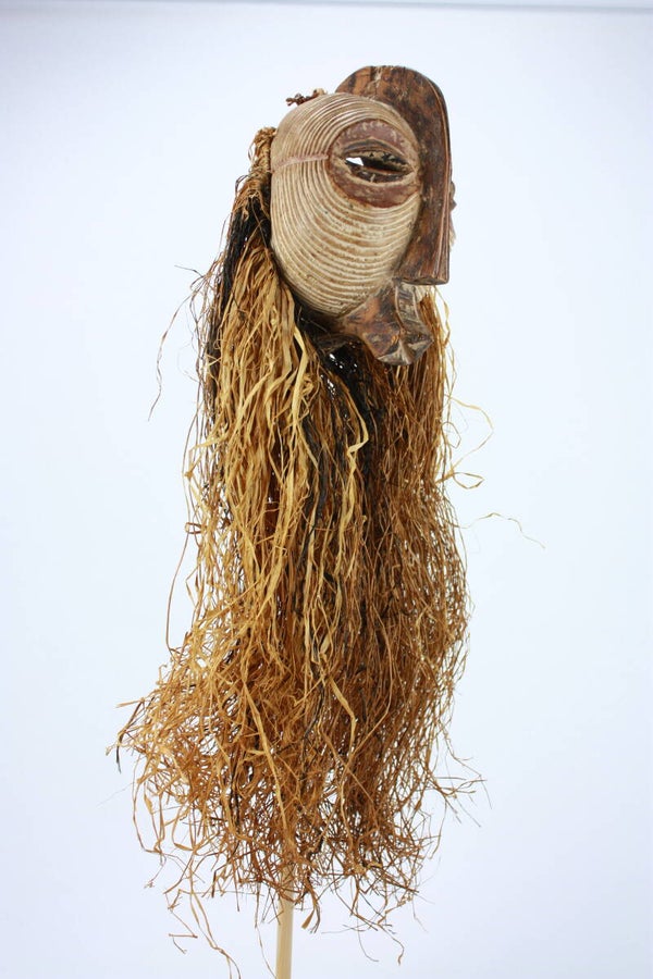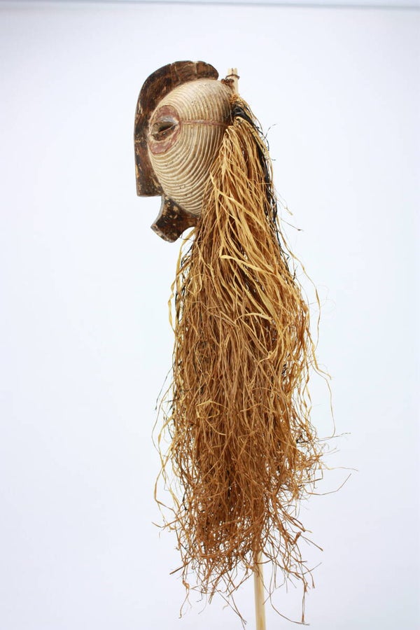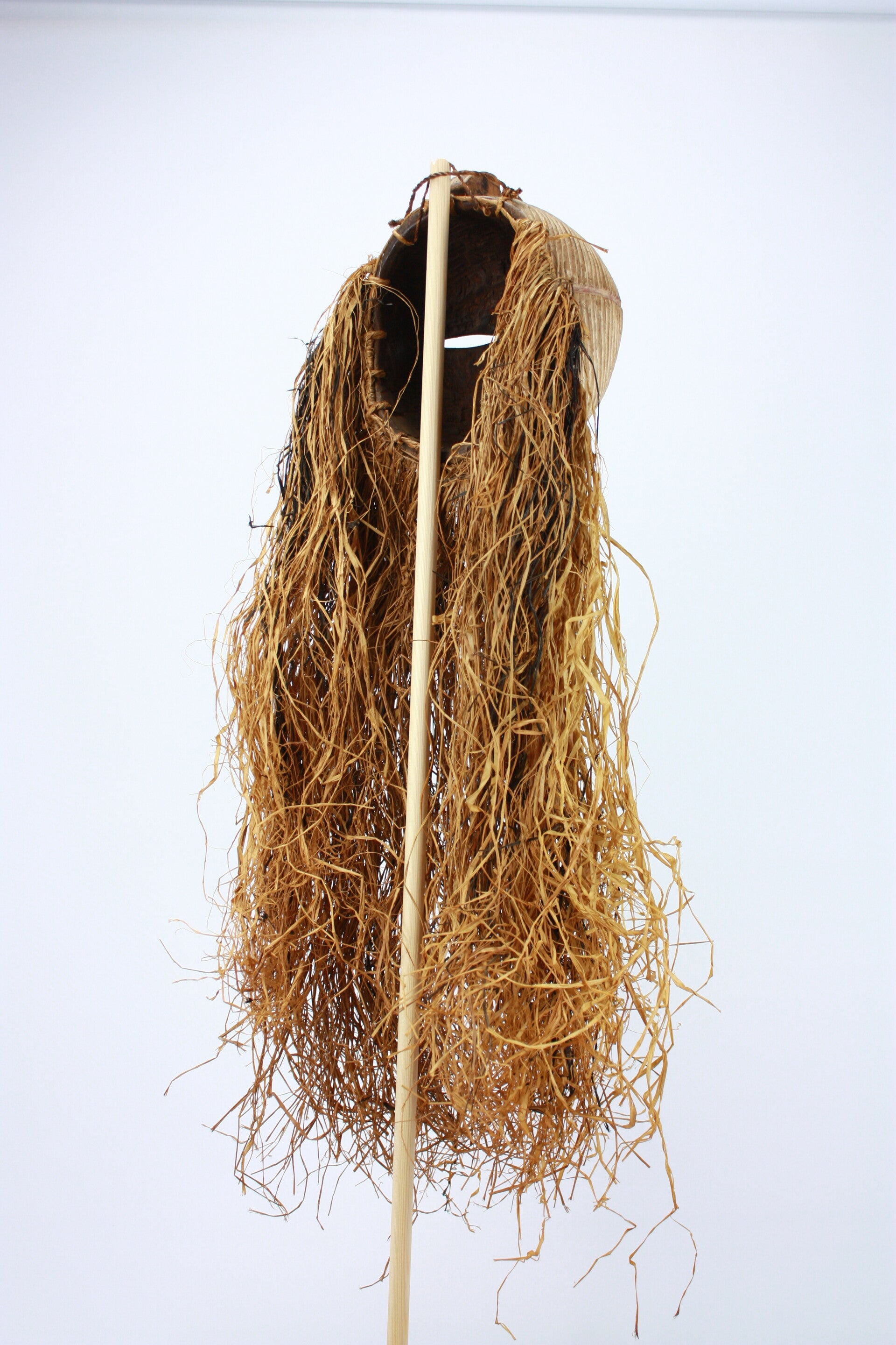 Traces of white and reddish pigment remain within the grooves, creating subtle chromatic contrast. The mask retains its raffia fiber costume attachment forming a long cascading surround, enhancing its ritual presence.