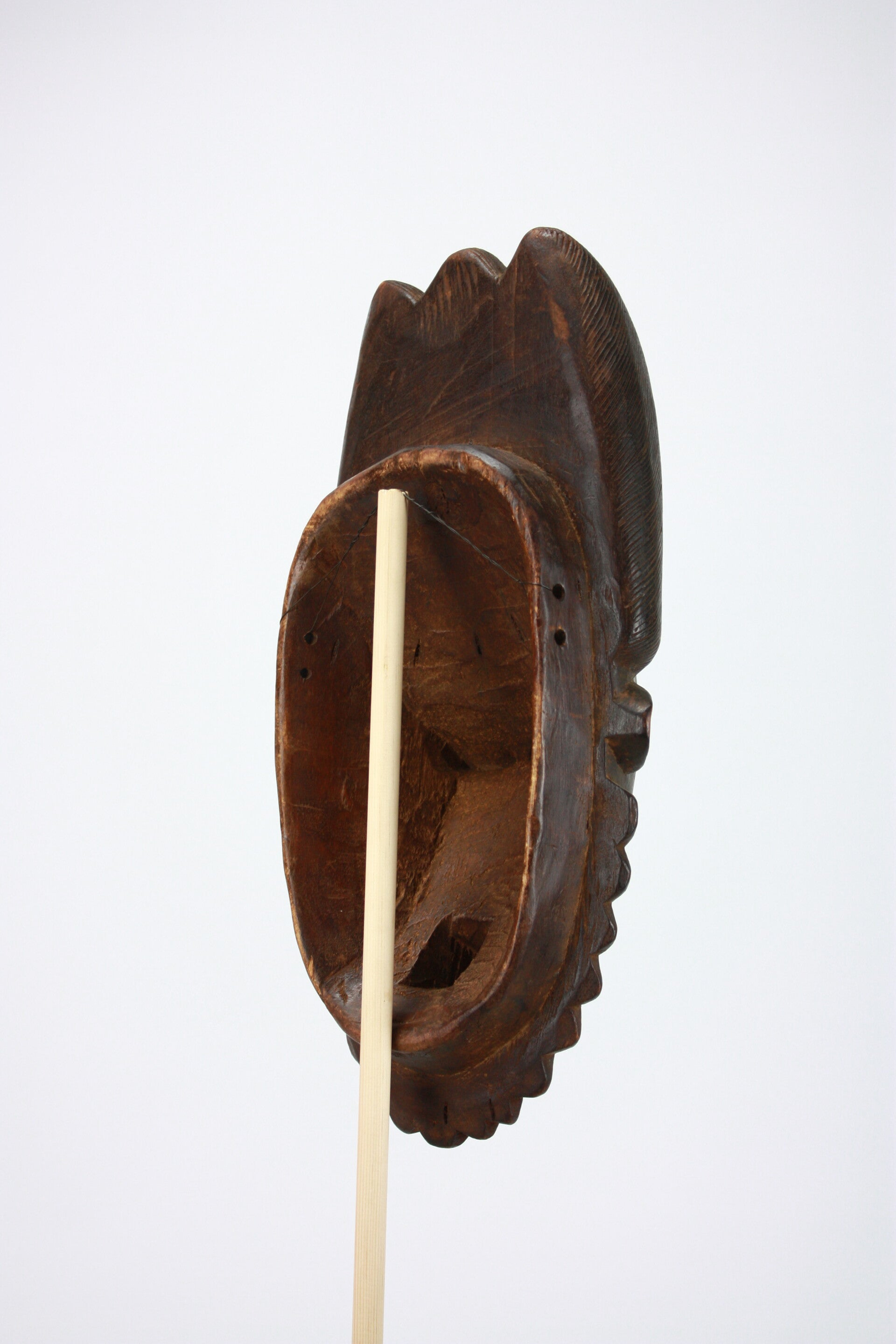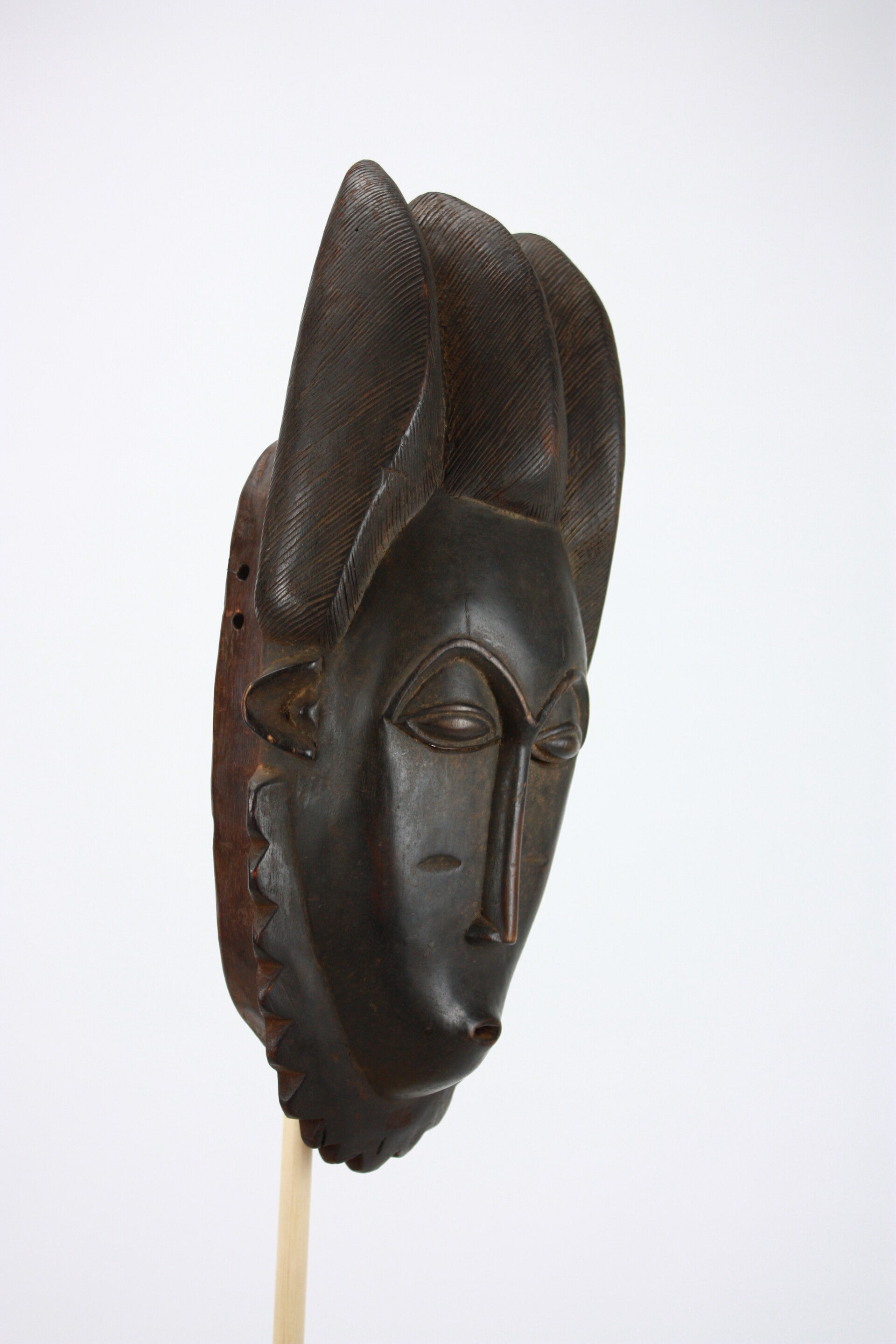 The coiffure rises dramatically in three high crested lobes, each densely incised with fine diagonal striations, characteristic of Baule hairstyling in Mblo portrait masks. The surface shows a deep, lustrous brown patina with areas of handling wear.