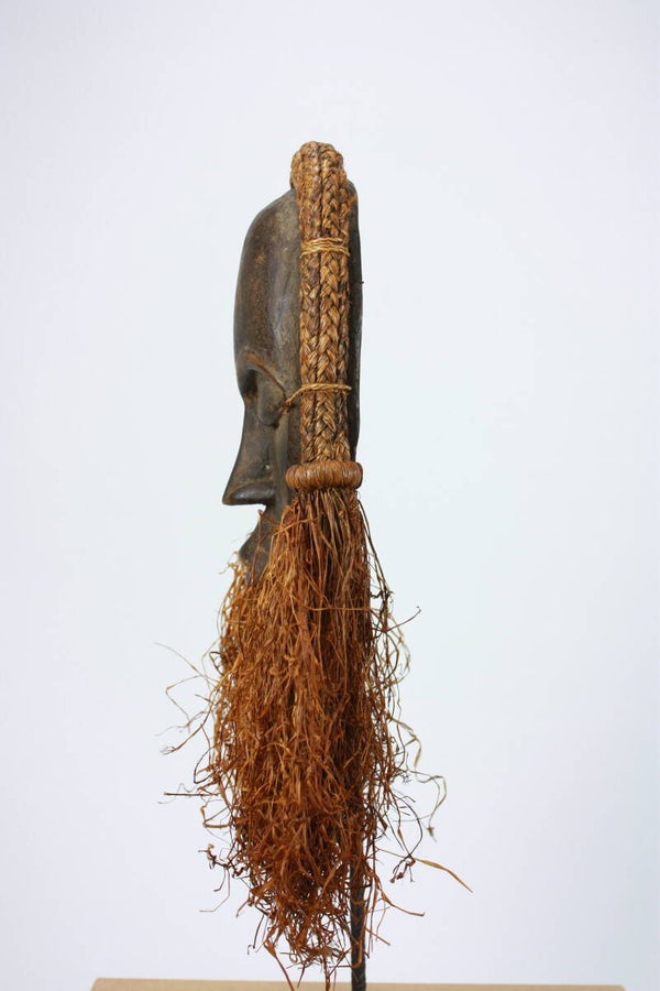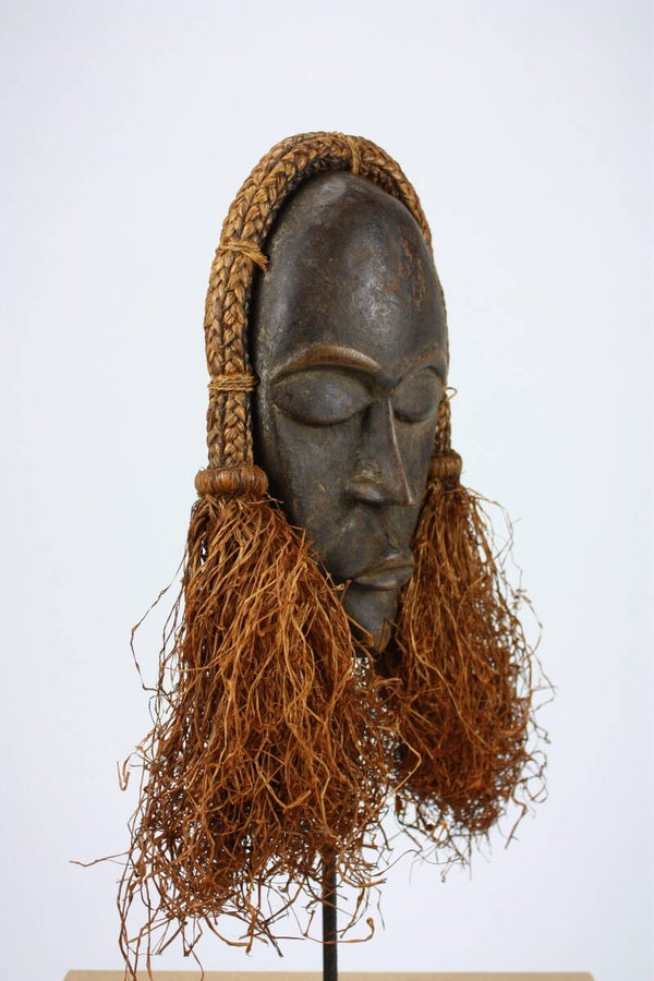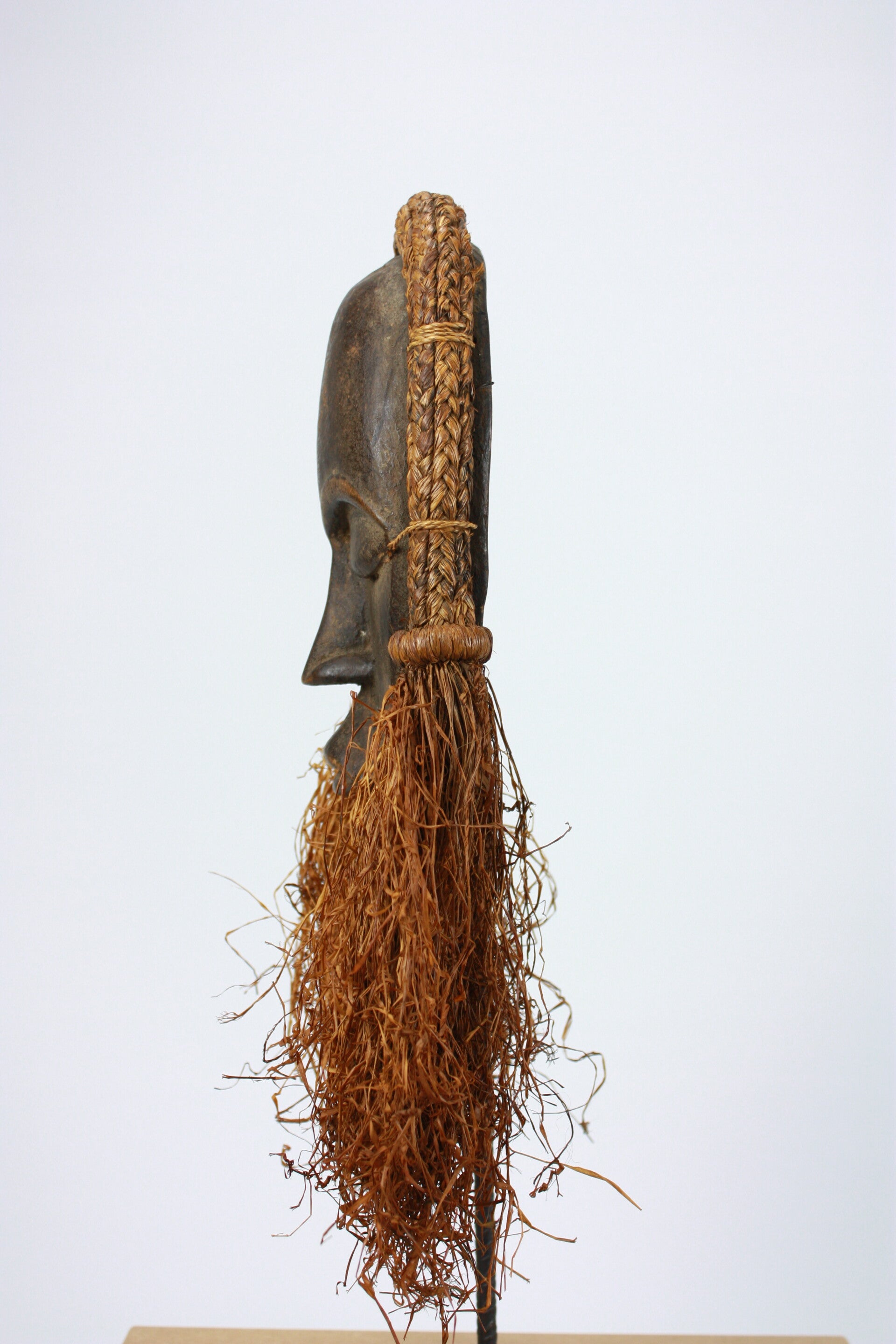 The mask is framed by a braided vegetal fiber coiffure secured along the rim, terminating in thick pendulous raffia tassels on either side. Attachment holes along the perimeter indicate traditional fastening of the fiber elements.