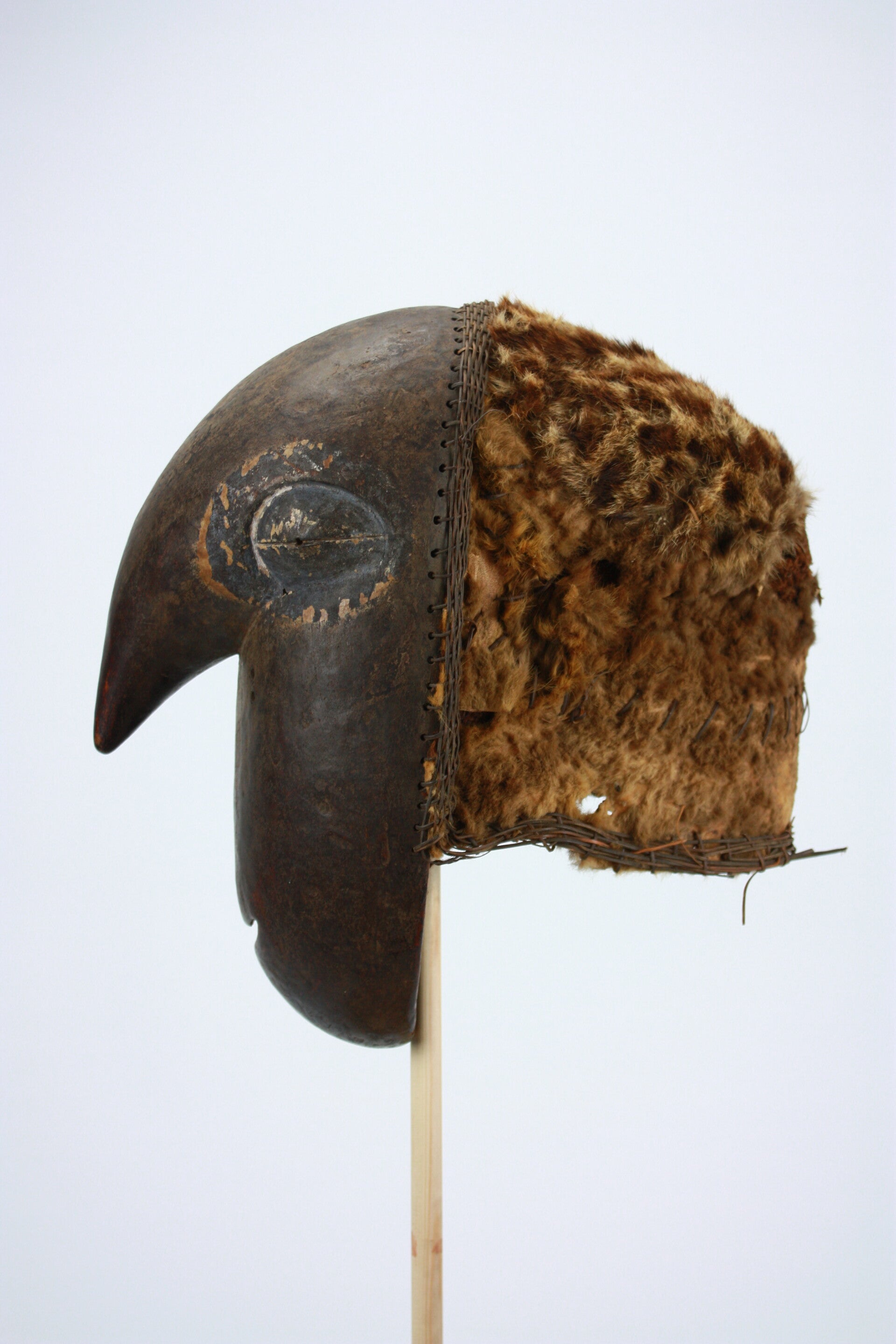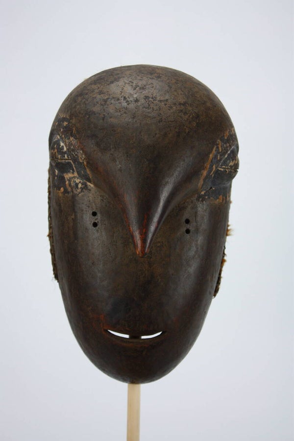 Helmet-type mask carved with a smooth, domed cranium and a pronounced forward-projecting, beak-like facial ridge. The elongated face is minimally articulated, with incised almond-shaped eyes retaining traces of light pigment, small drilled nostril perforations, and a narrow horizontal mouth slit.