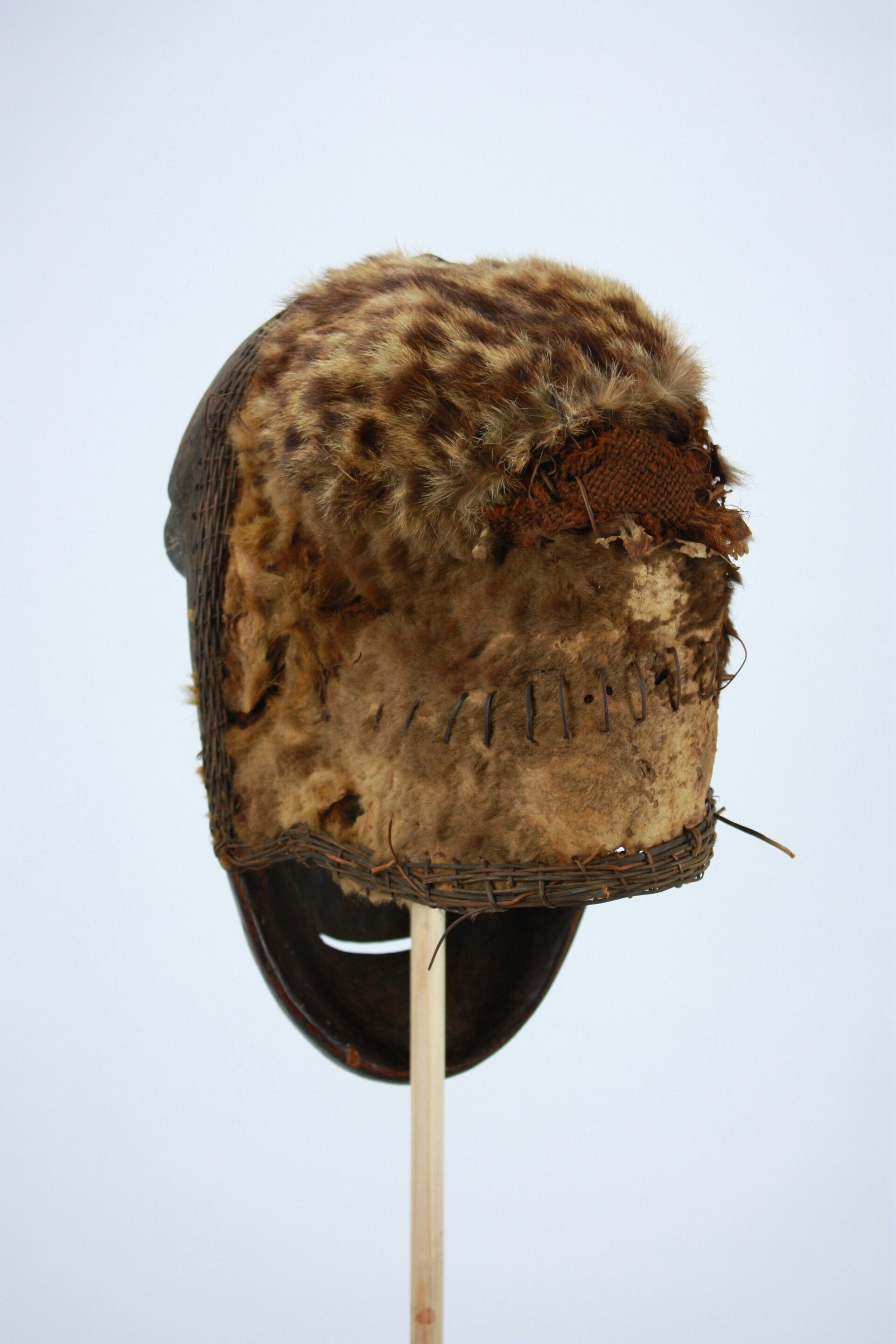 The rear and upper section are covered with animal hide, secured along the perimeter with vegetal fiber and metal stitching, forming a fitted helmet structure. The hide covering suggests integration into a full costume ensemble.