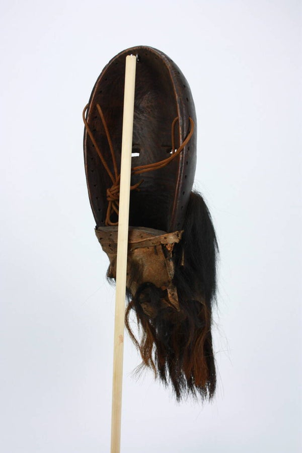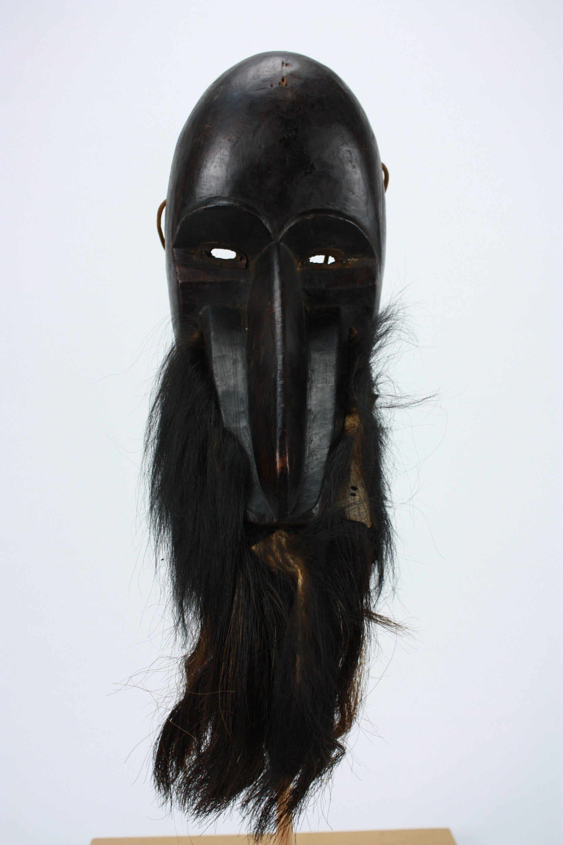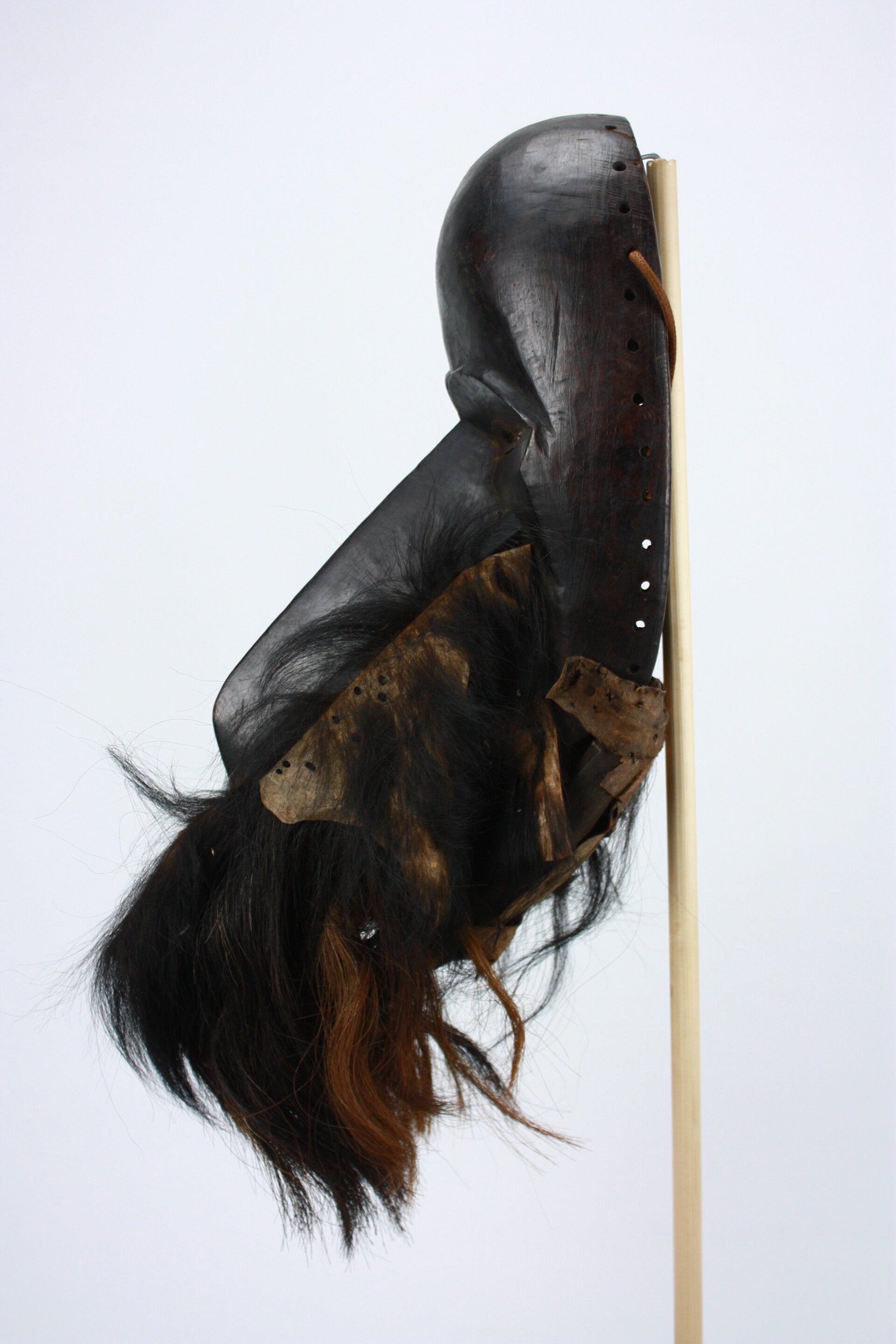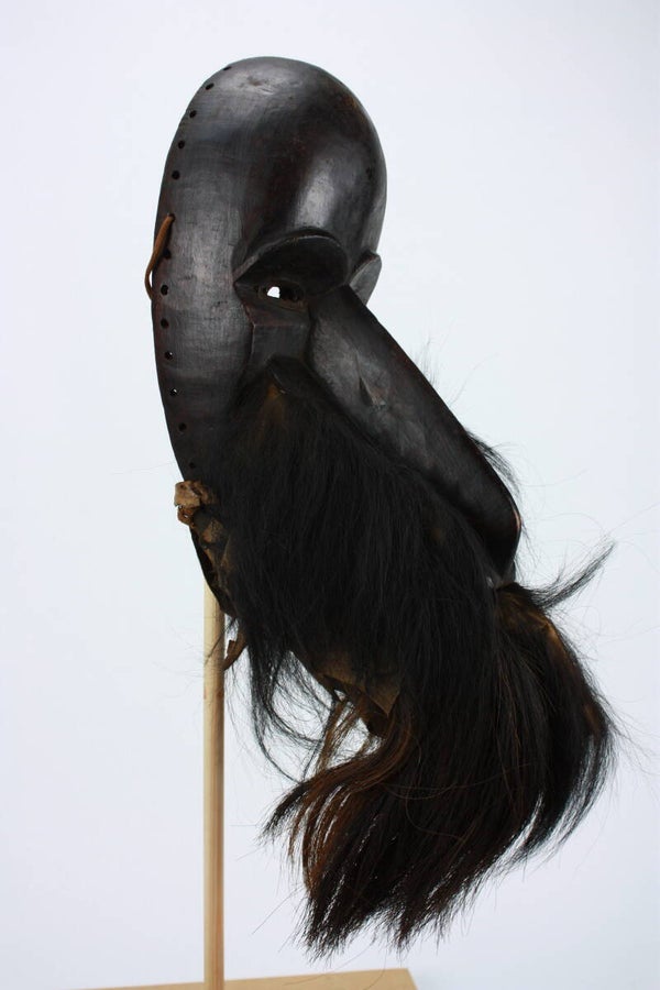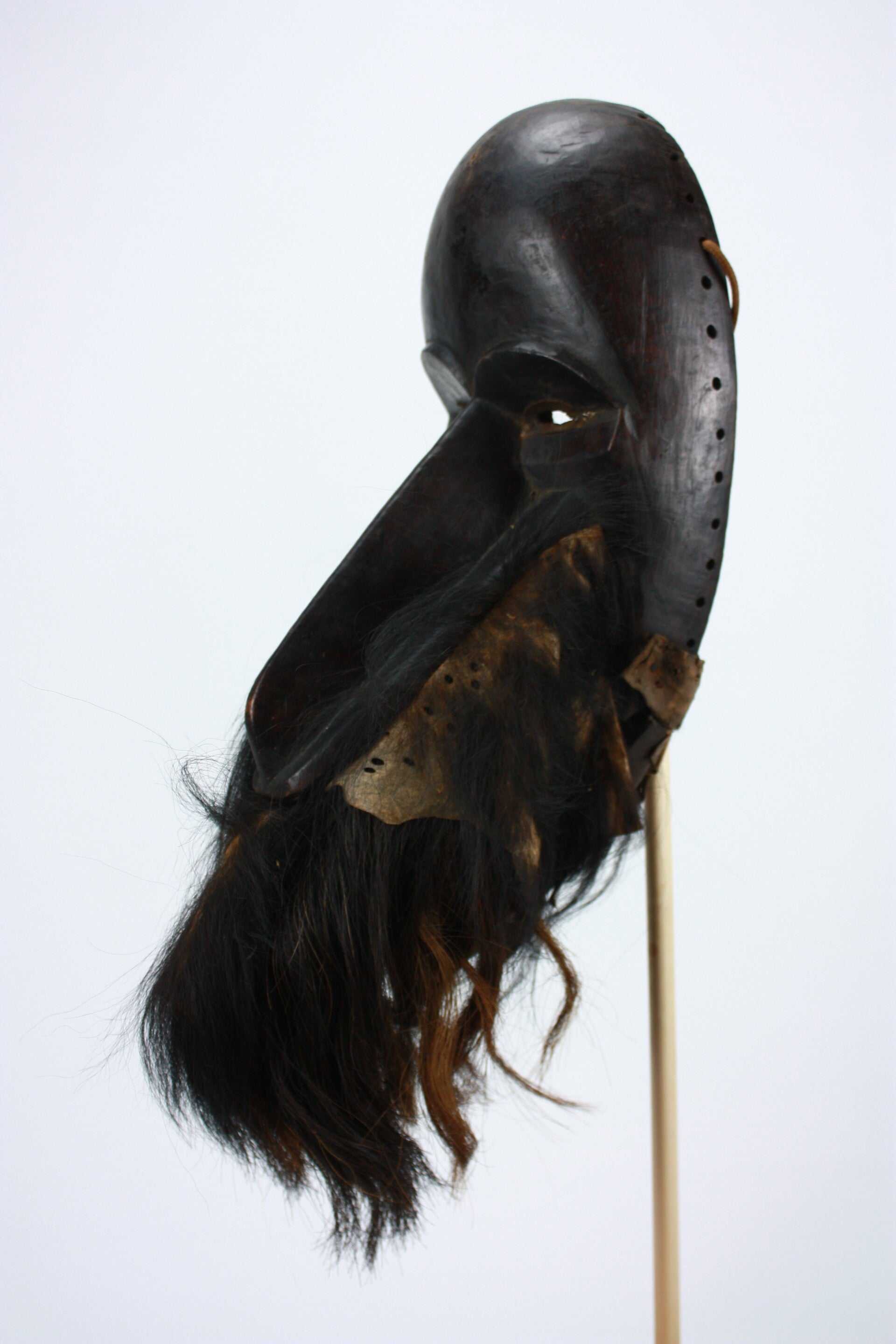 The dark, almost black patina shows a smooth, worn surface with subtle reddish undertones. Along the rim are perforations for attachment of costume elements. Remnants of hide and a long, dense beard of dark animal hair remain attached, enhancing the dramatic presence of the piece.