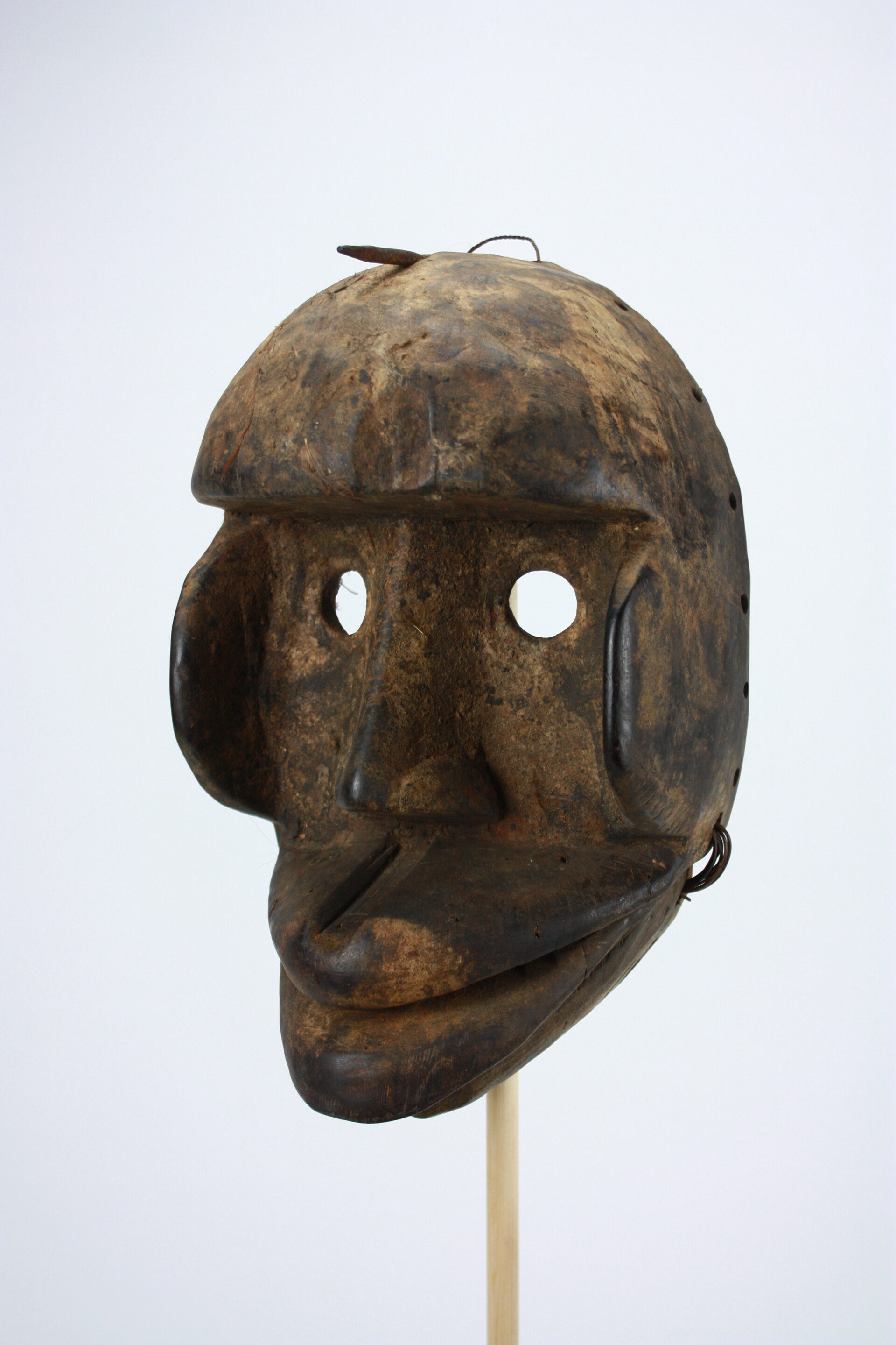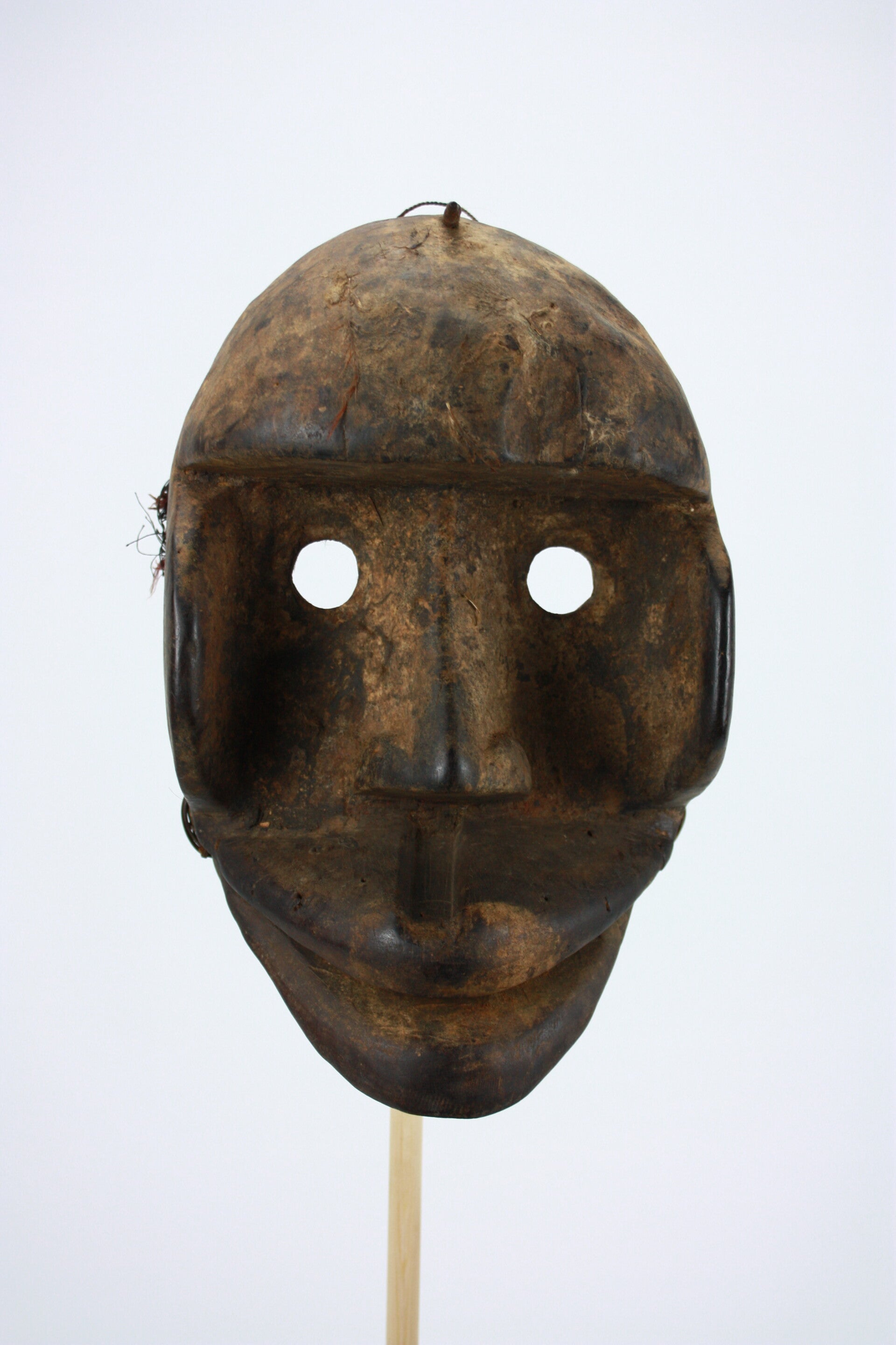 A finely carved Dan Kran mask of compact, rounded helmet form with strongly sculpted facial features. The domed forehead flows into a broad facial plane with circular eye apertures and a short, triangular nose. Full, rounded cheeks frame the composition, leading to the characteristic projecting mouth construction.