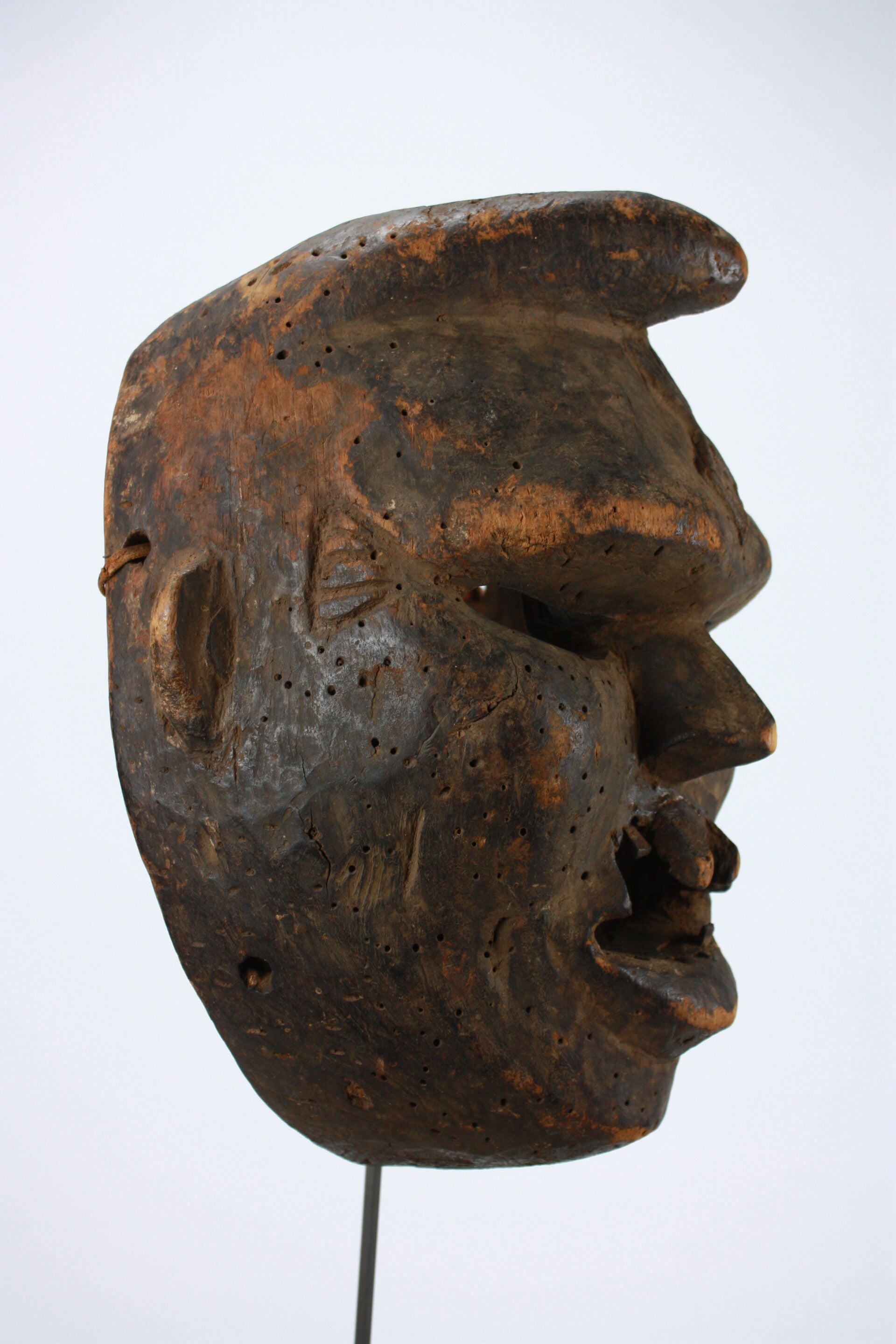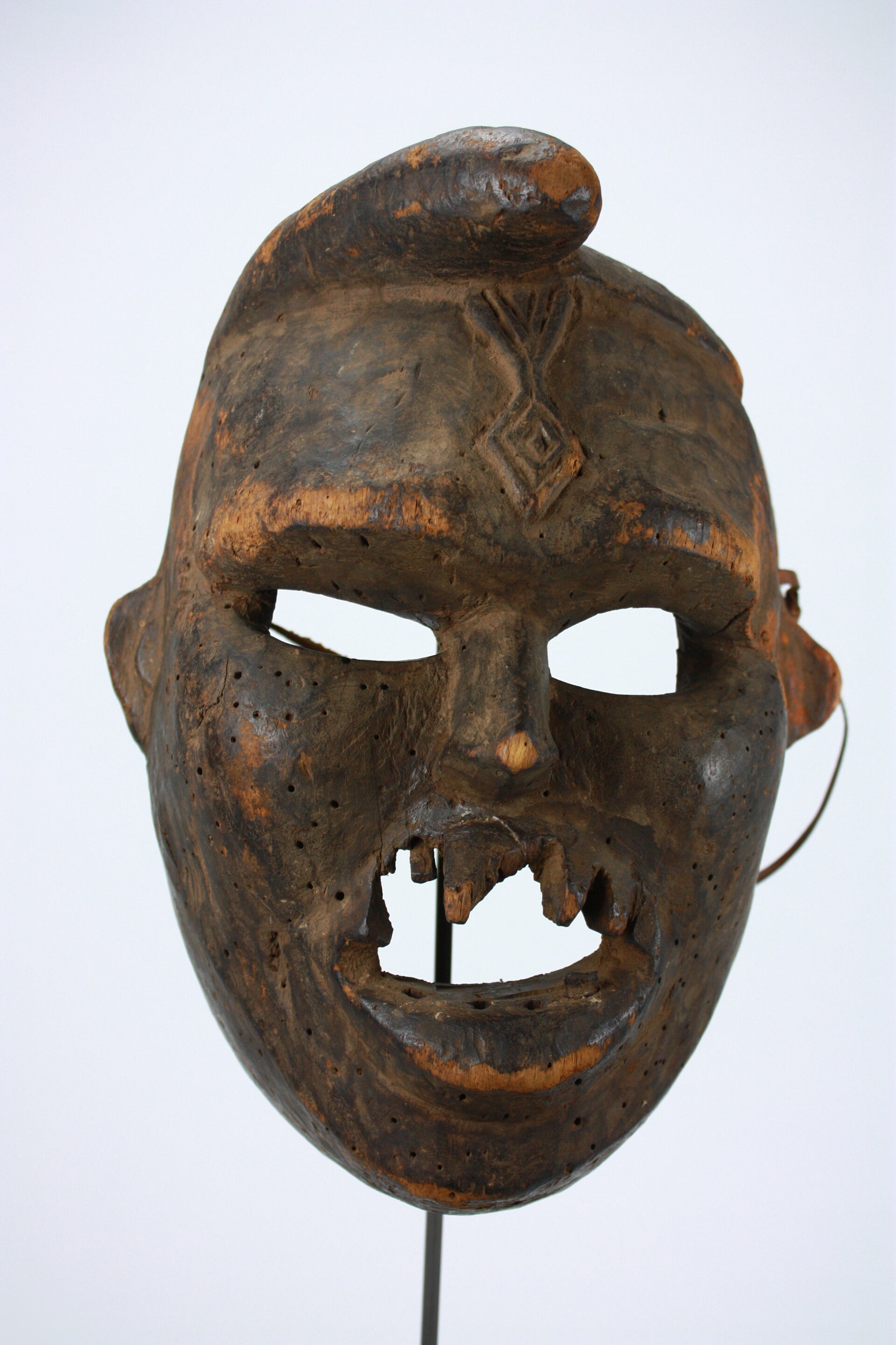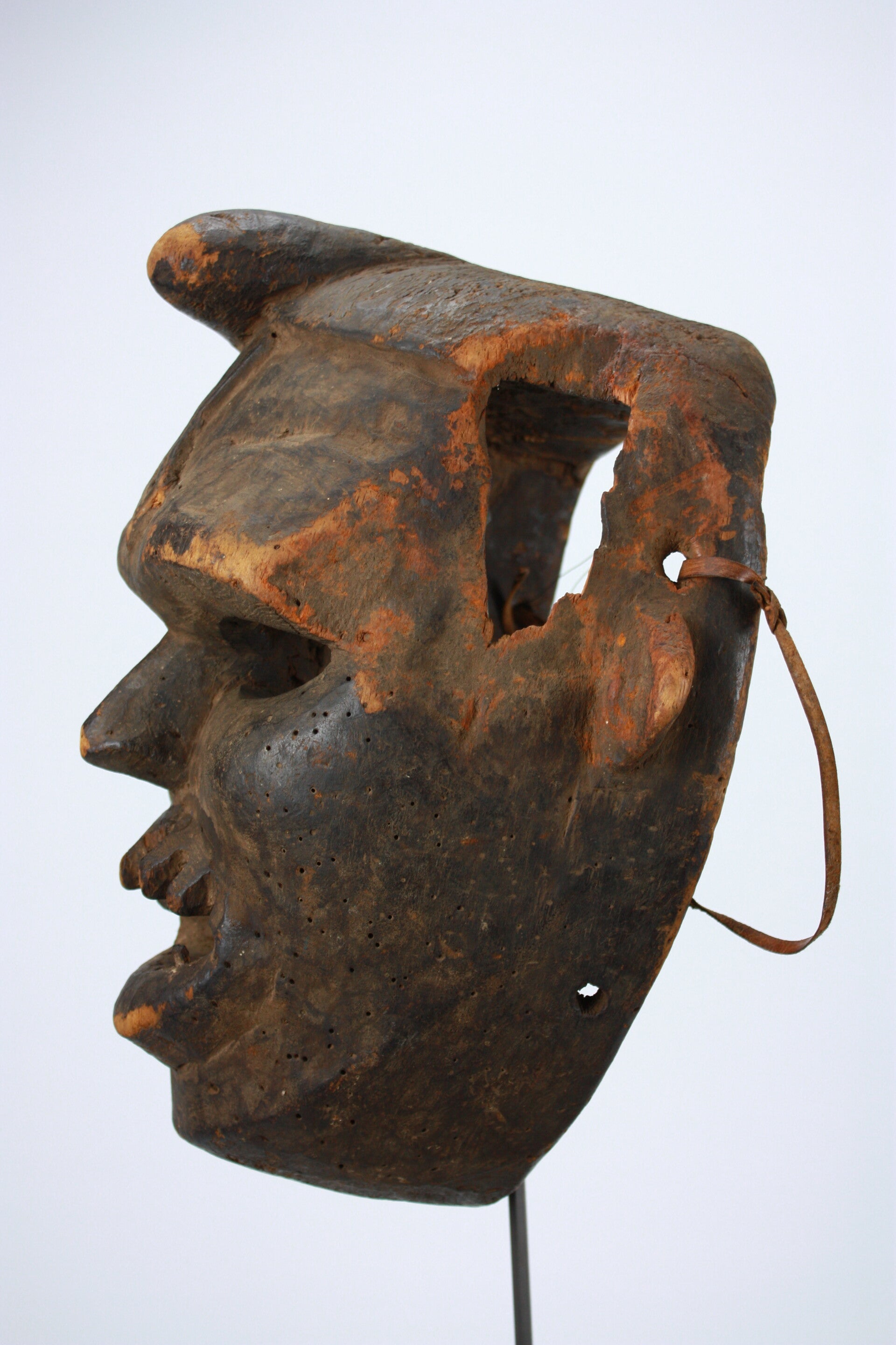 Carved wooden helmet mask with pronounced brow ridge, narrow eye slits, projecting nose, and open mouth with carved teeth. Small perforations across the surface and along the rim indicate attachment of costume elements. Deeply hollowed at the reverse; leather thongs remain.