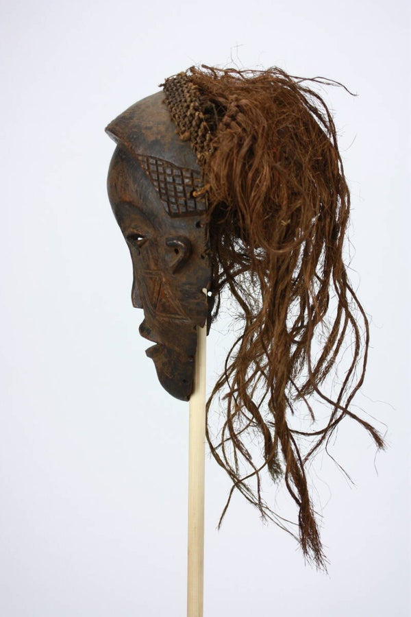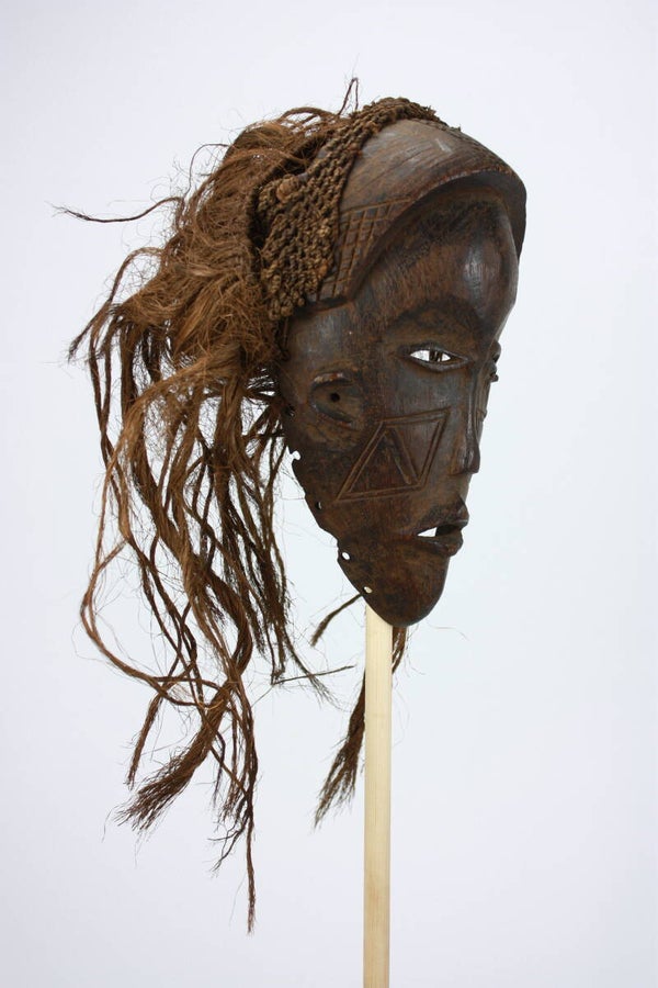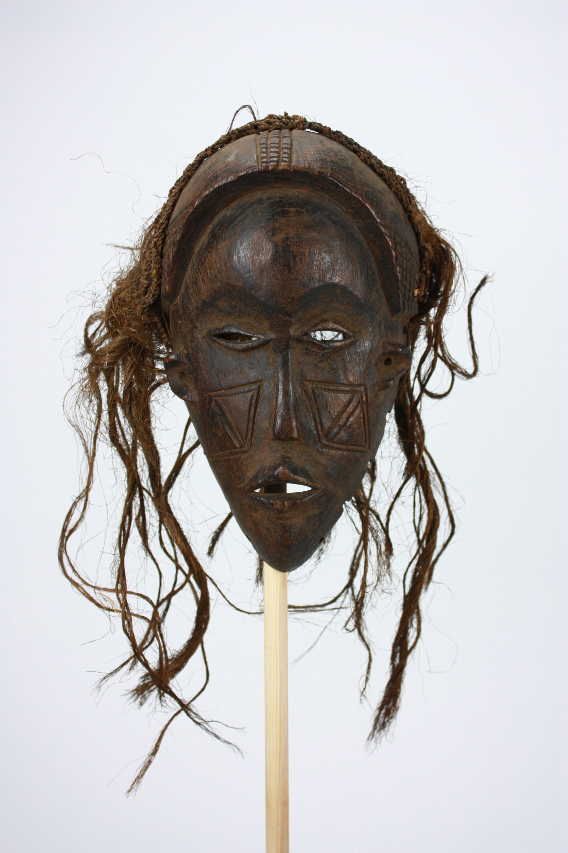 Carved female face with narrow, half-closed eyes, delicate mouth and geometric cheek scarification. The coiffure is indicated by carved elements and remains of braided fibre attachments.