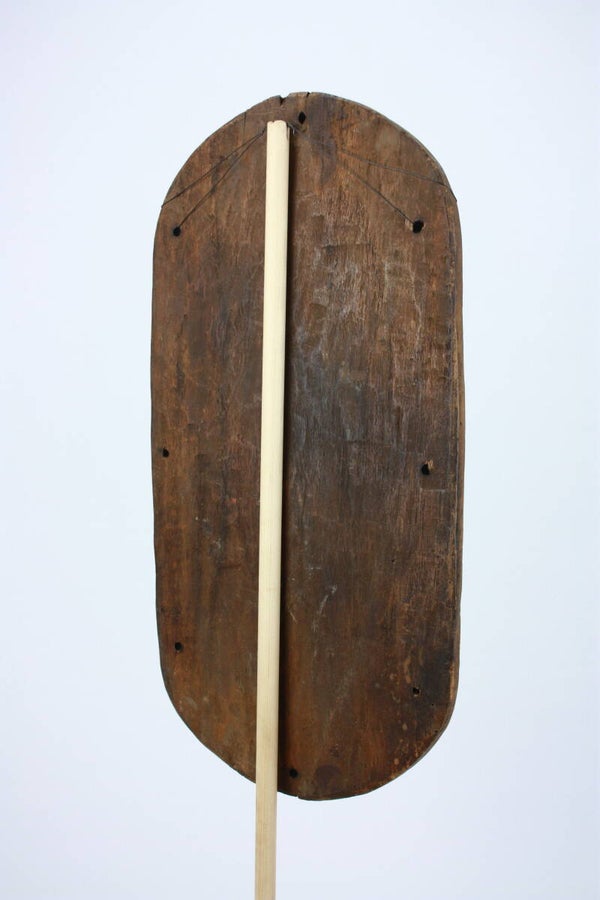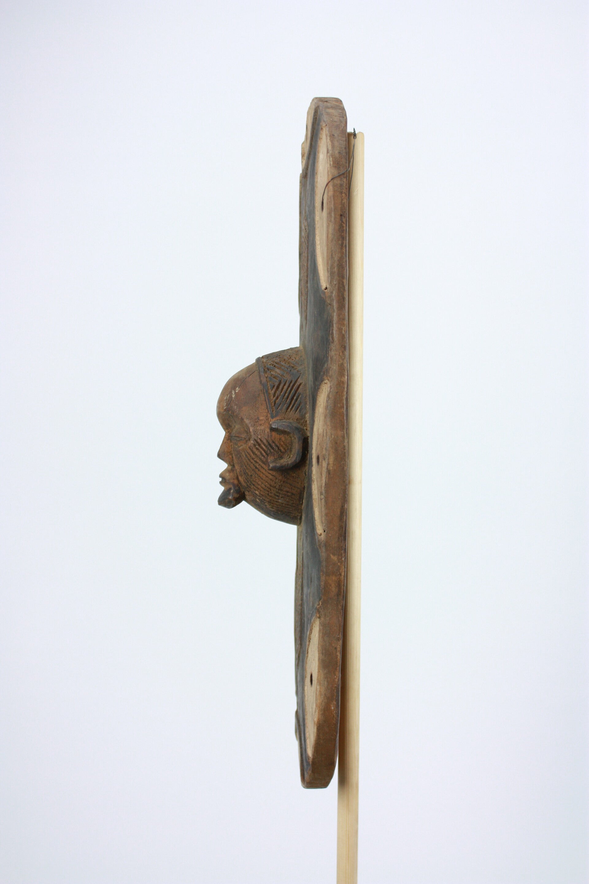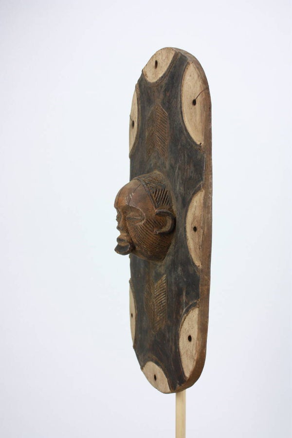 Ceremonial wooden panel with a central projecting carved head surrounded by geometric decoration and contrasting circular fields. The style and form relate to Ekpo/Ekpe society mask-panels used in ritual and masquerade contexts among Eket, Efik and Ibibio communities.
