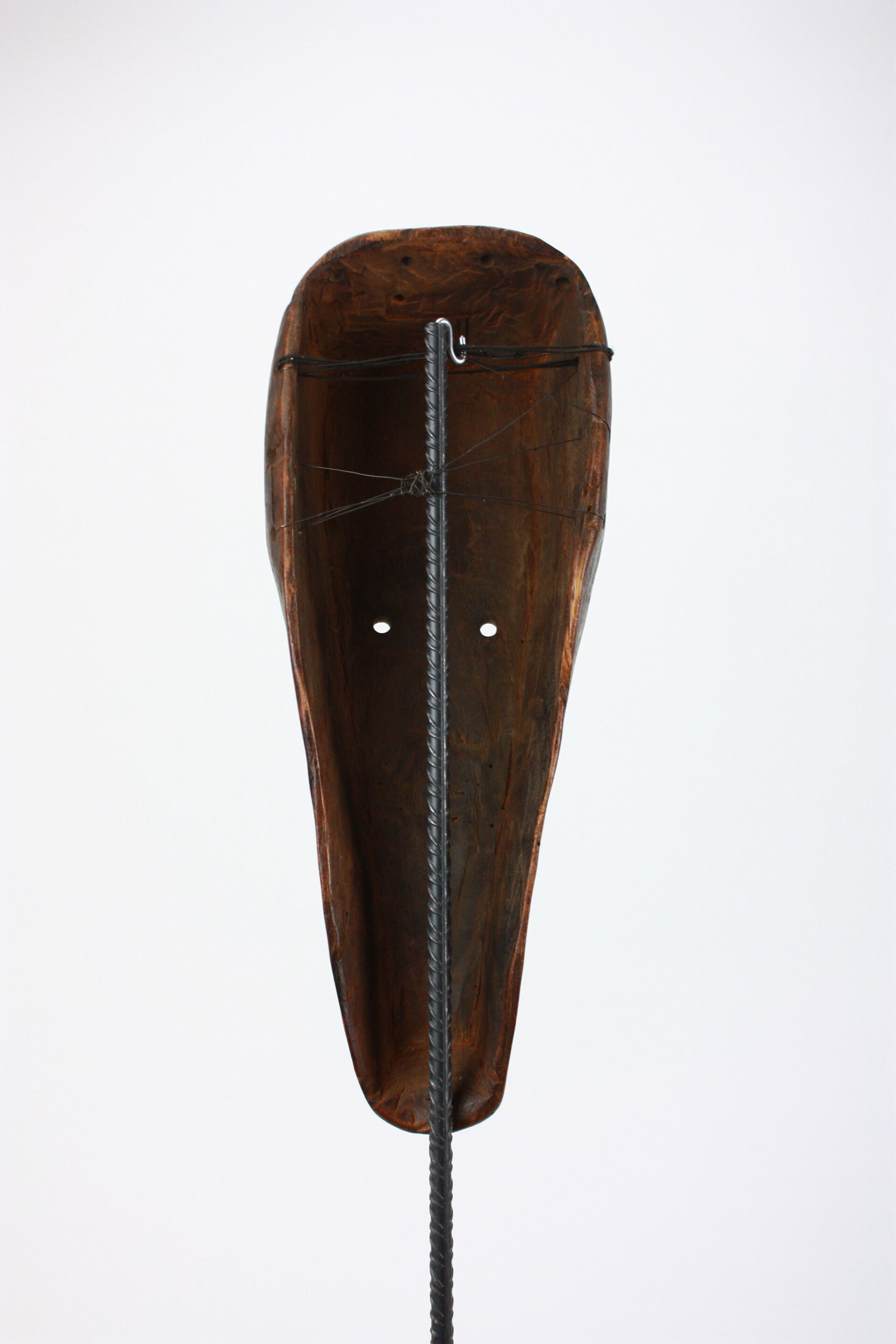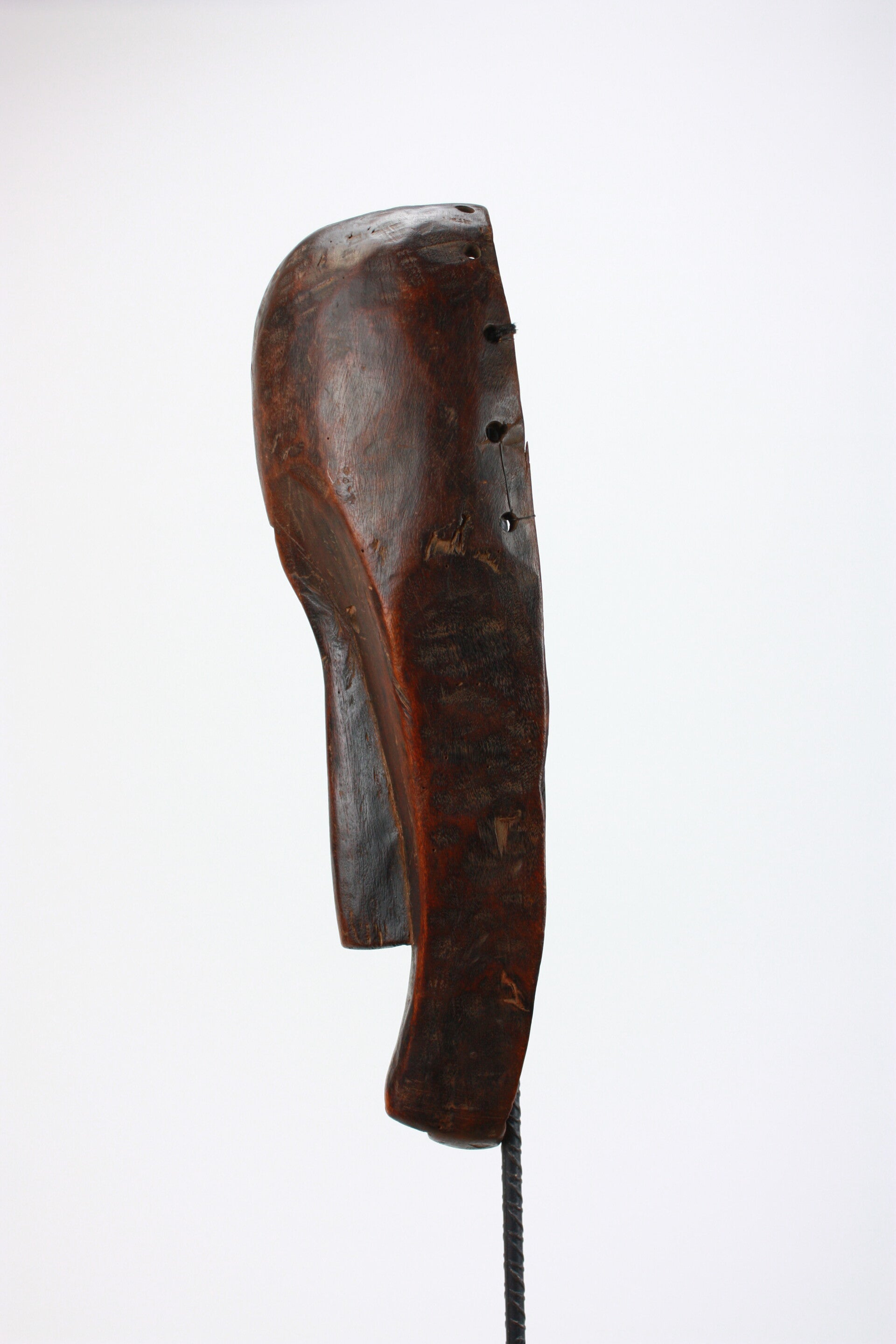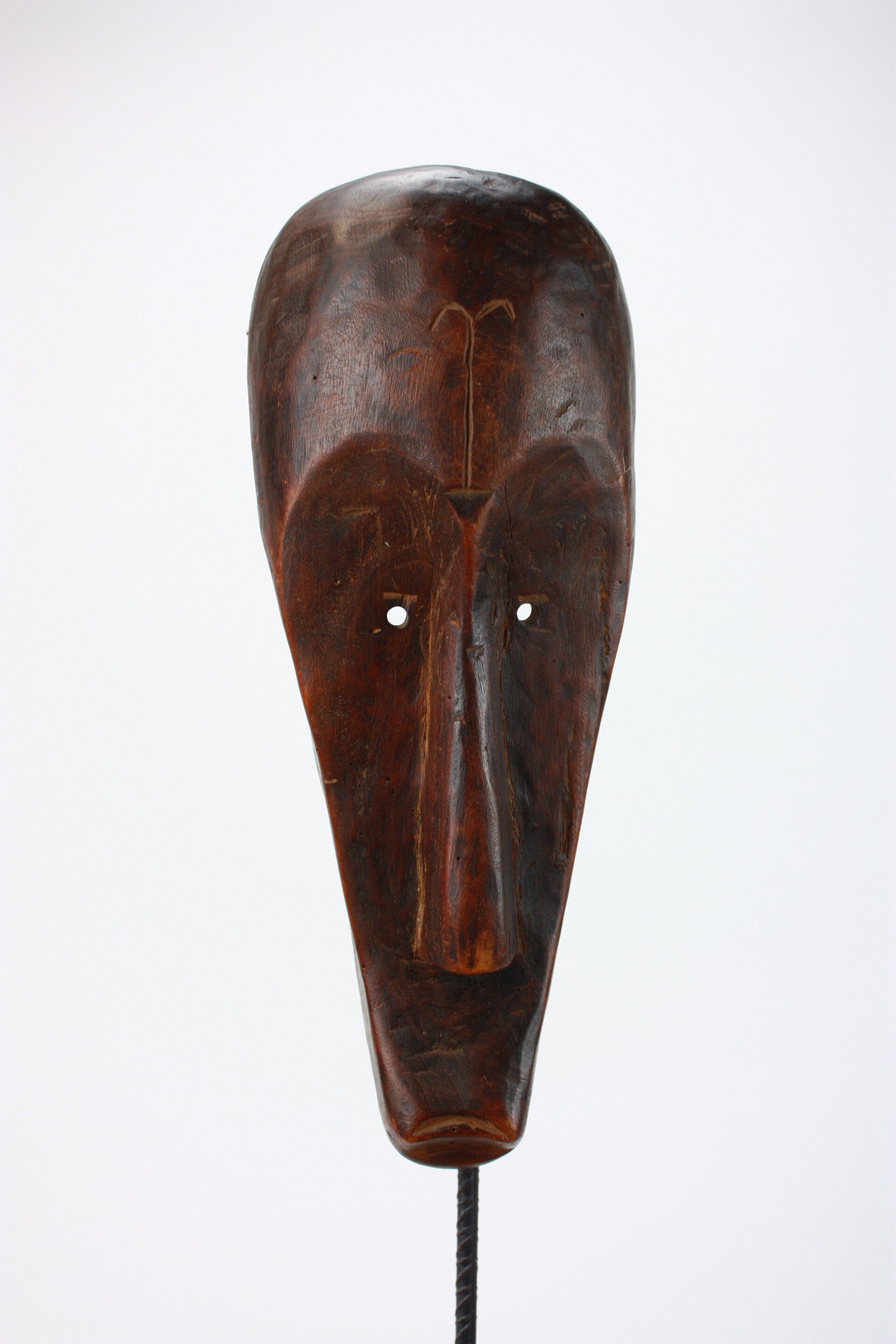 The incised forehead motif and elongated proportions relate to Fang-region carving traditions, though the drilled eyes and simplified modeling suggest a later or regional variation rather than a classic Ngil type.