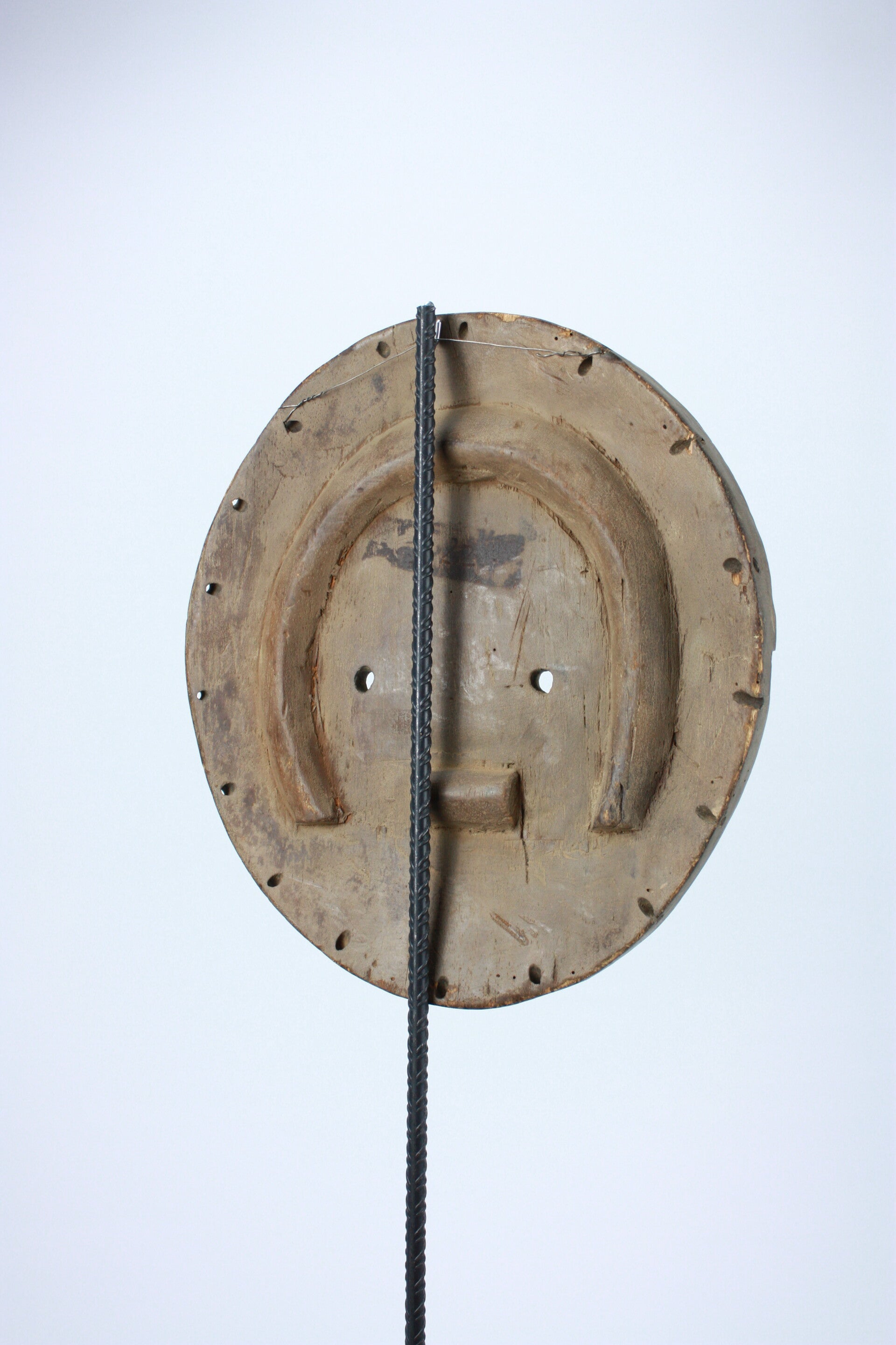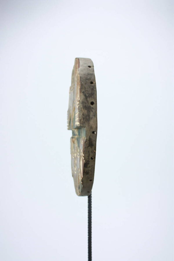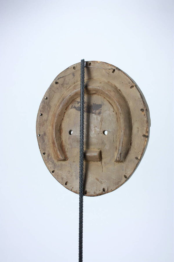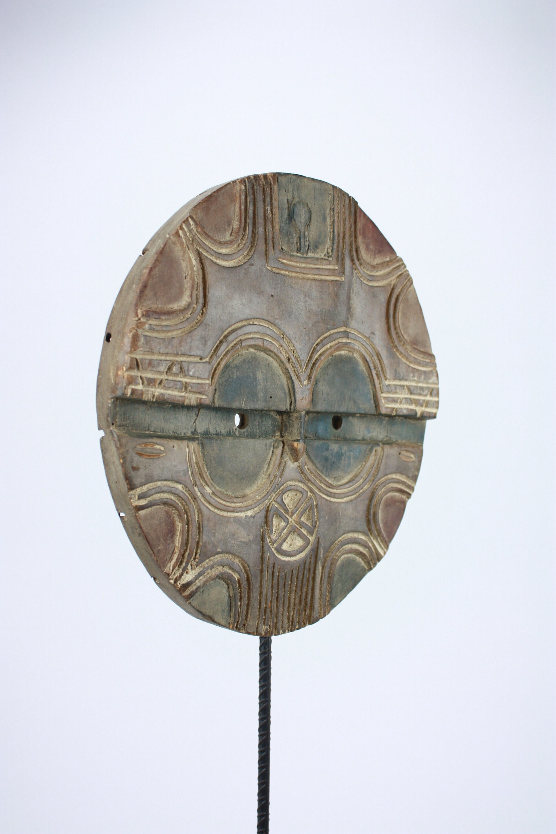 Carved and painted wooden Kidumu mask of circular form with concentric arcs, geometric motifs and muted red, white and blue-grey pigments. Symmetrical oval eye fields and a central “cross” medallion are characteristic of Teke-Tsaye ceremonial carving. Light surface wear and age patina evident.