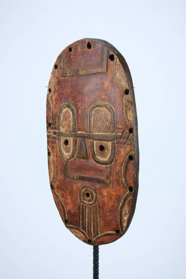 Carved and painted wooden Kidumu mask of elongated oval form with stylized facial features and geometric surface decoration. The eyes are framed within arched panels divided by a horizontal band, with small perforations for attachment of raffia or costume elements. Circular and linear motifs accent the lower section, typical of Teke-Tsaye ceremonial masks.