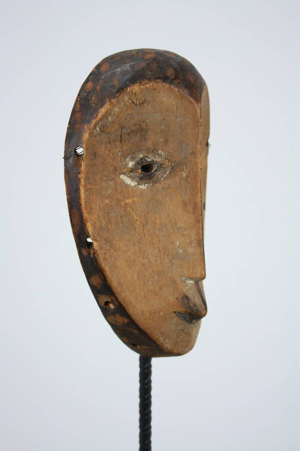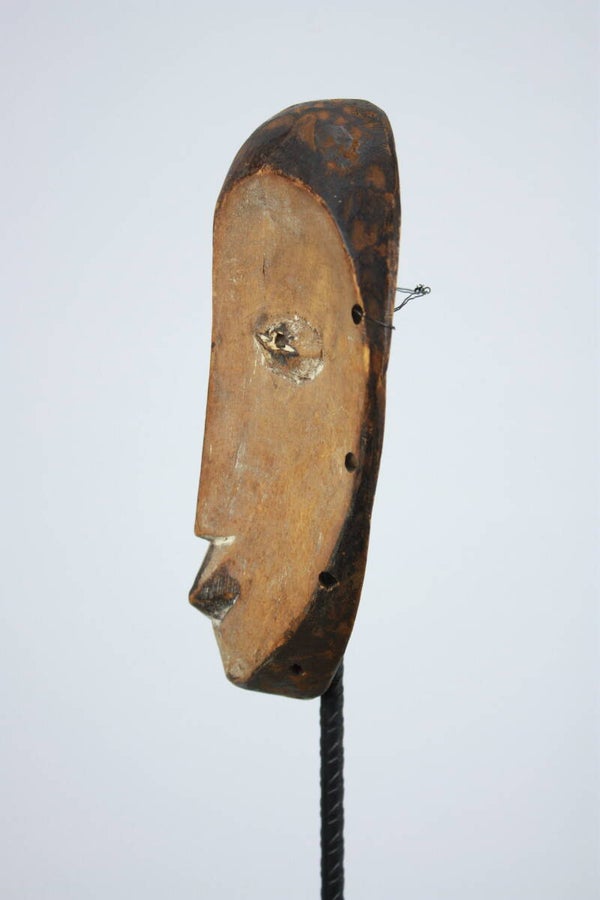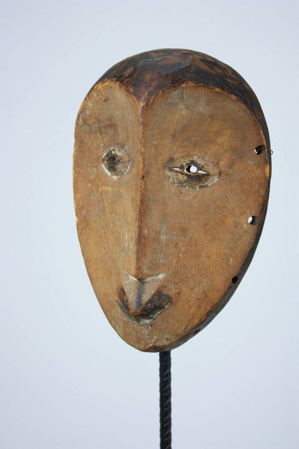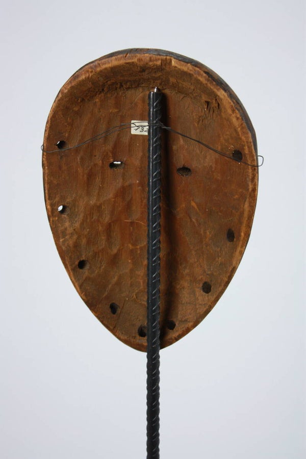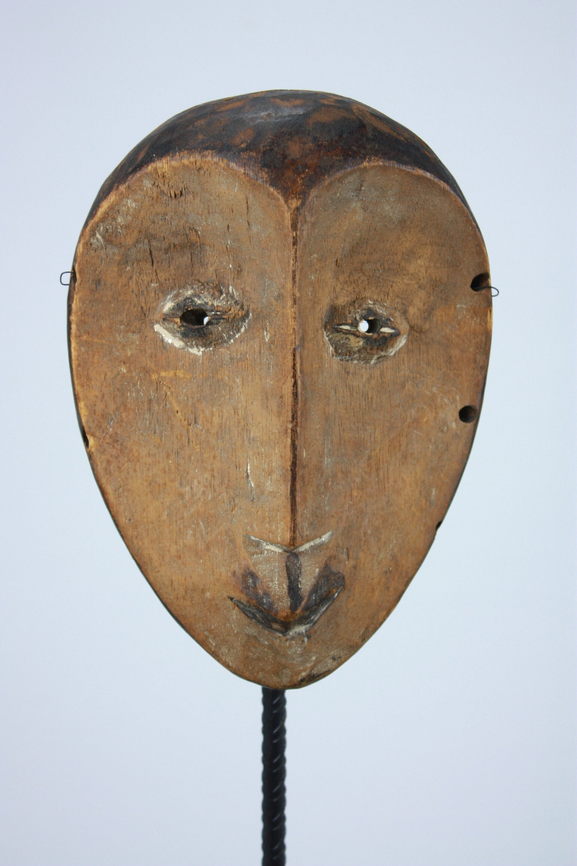 Carved wooden mask of compact oval form with softly modeled features, small pierced eyes and a delicately shaped mouth. The face is divided by a subtle vertical ridge, giving the composition a balanced and harmonious expression.