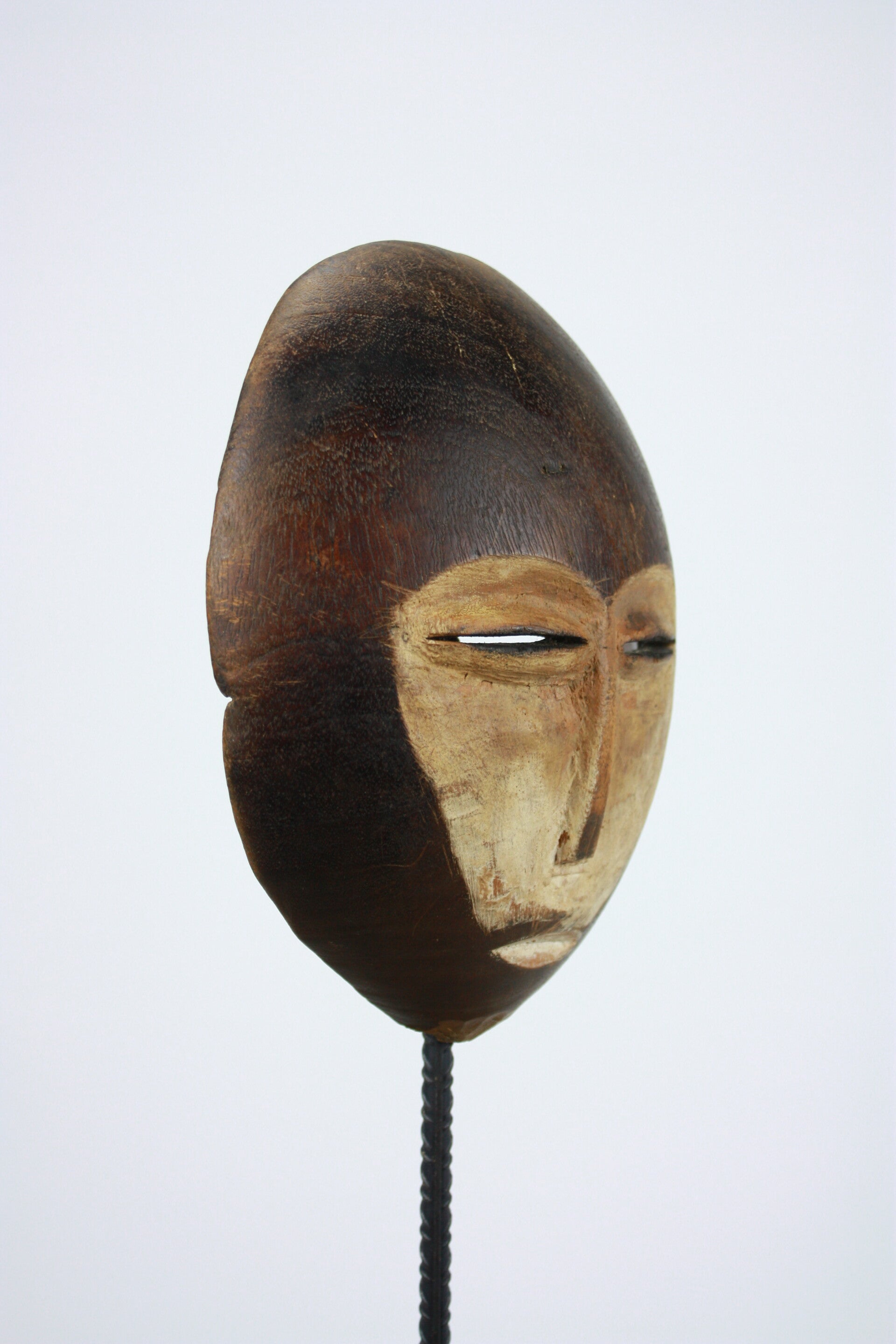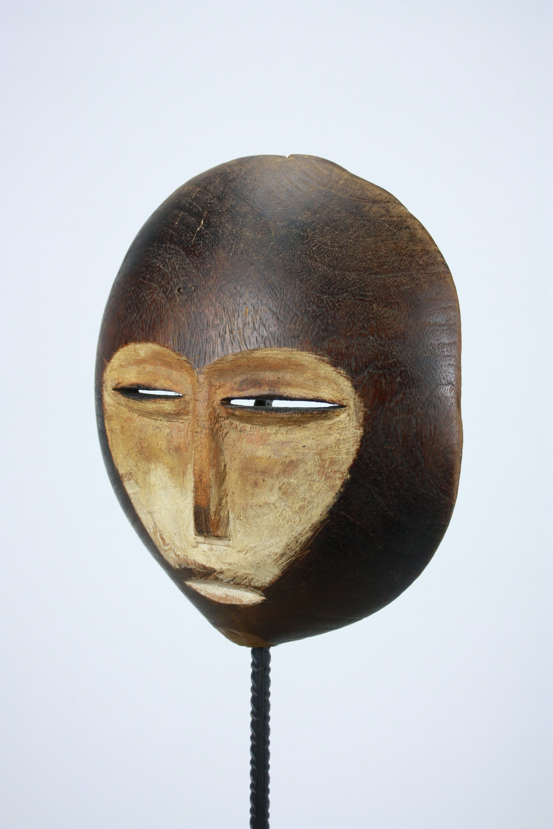 Carved wooden mask of rounded, almost circular form with a broad domed forehead and finely slit eyes set within a light-toned facial field. The elongated nose and small, closed mouth create a calm and introspective expression typical of masks associated with the Bwami society.