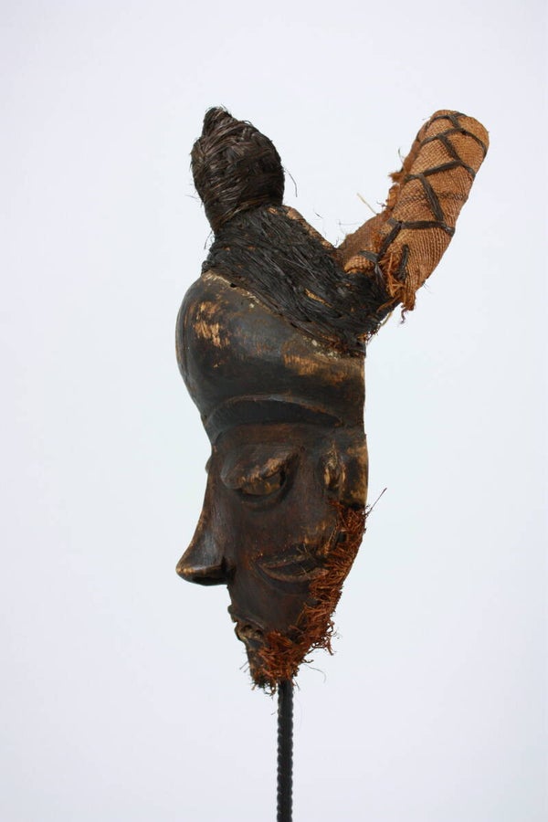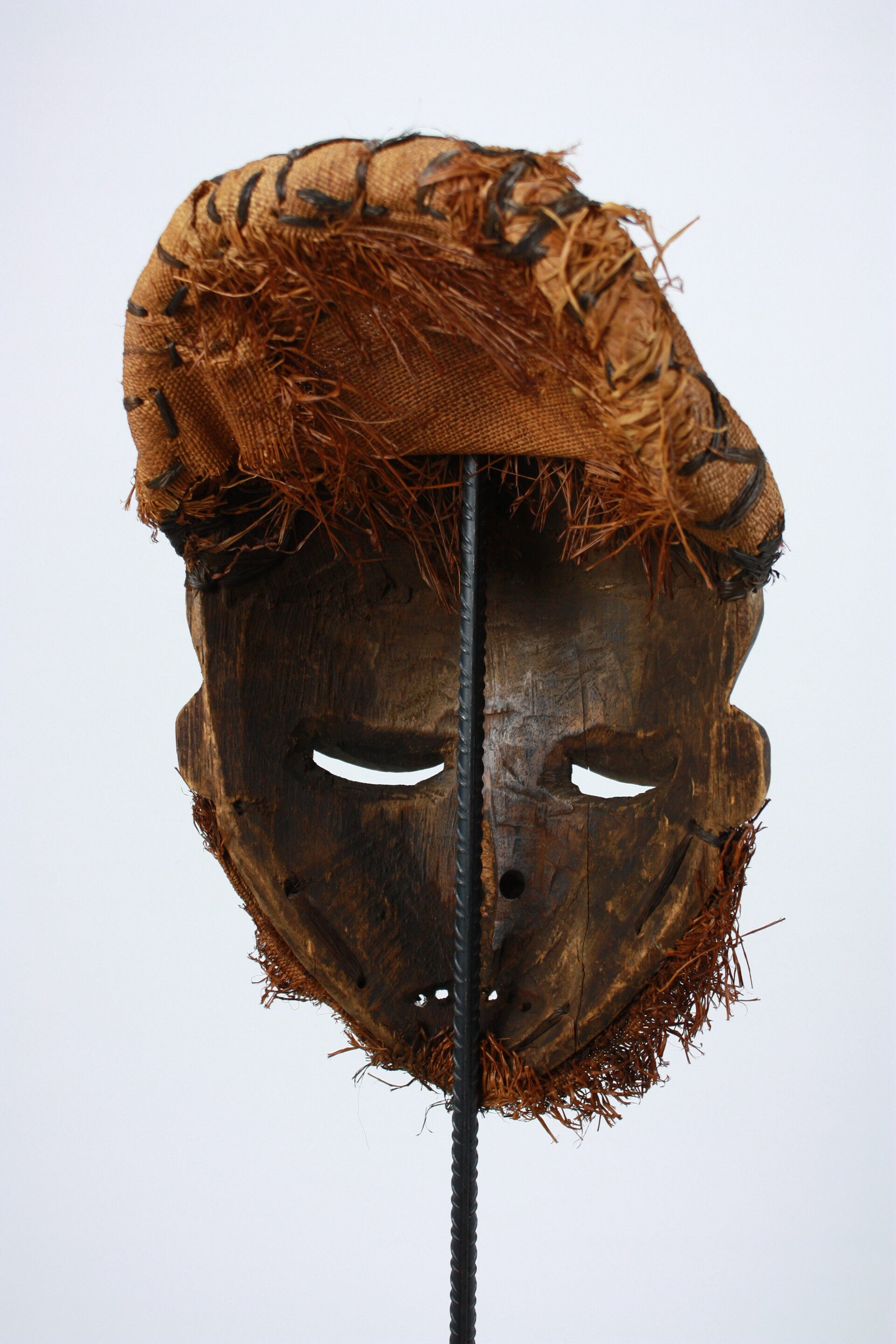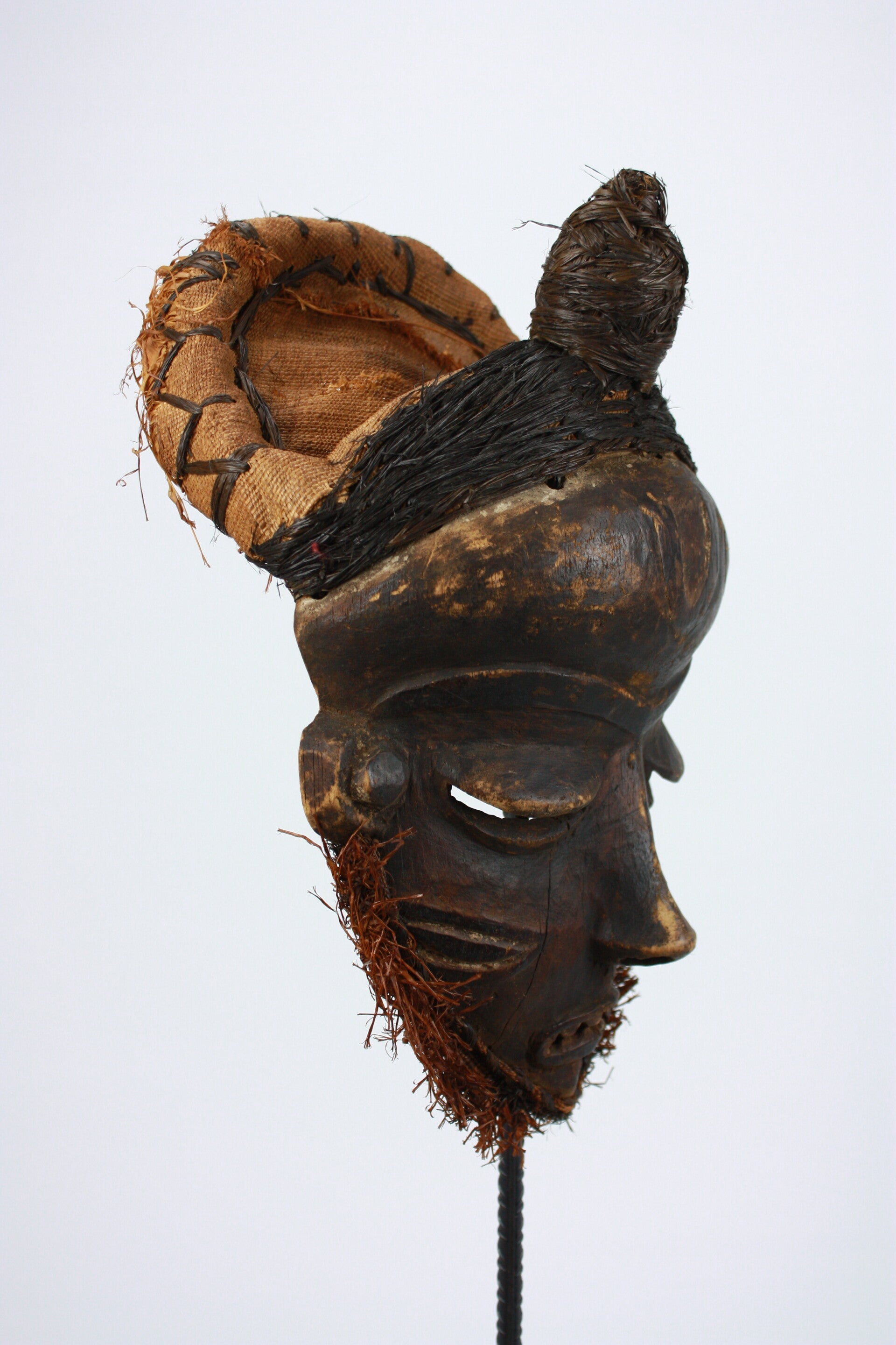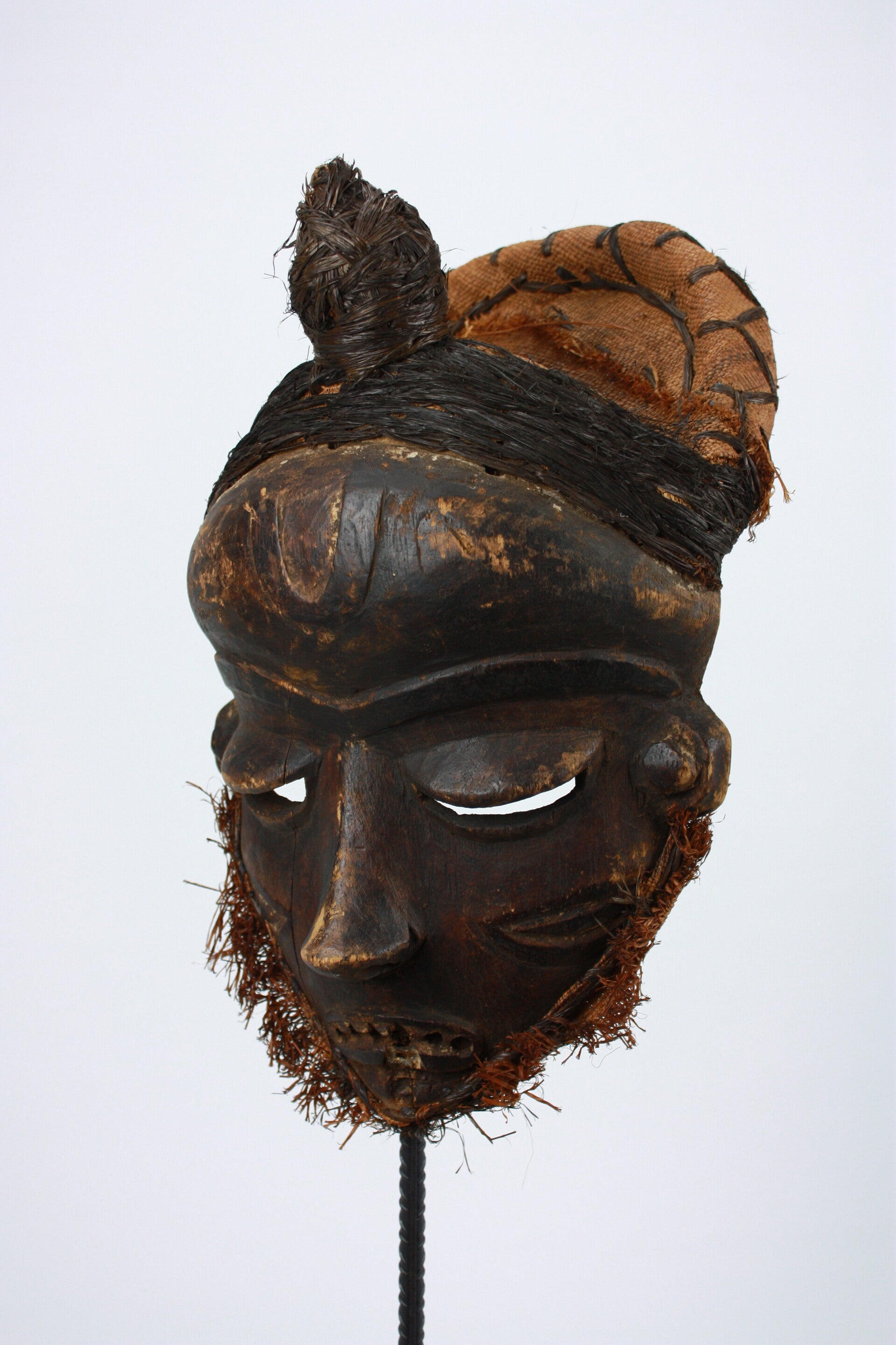 The mask retains elements of its original fiber beard and elaborate headdress construction, composed of woven textile, plant fibers and braided material. The dark, lustrous patina and visible wear are consistent with age and traditional use.