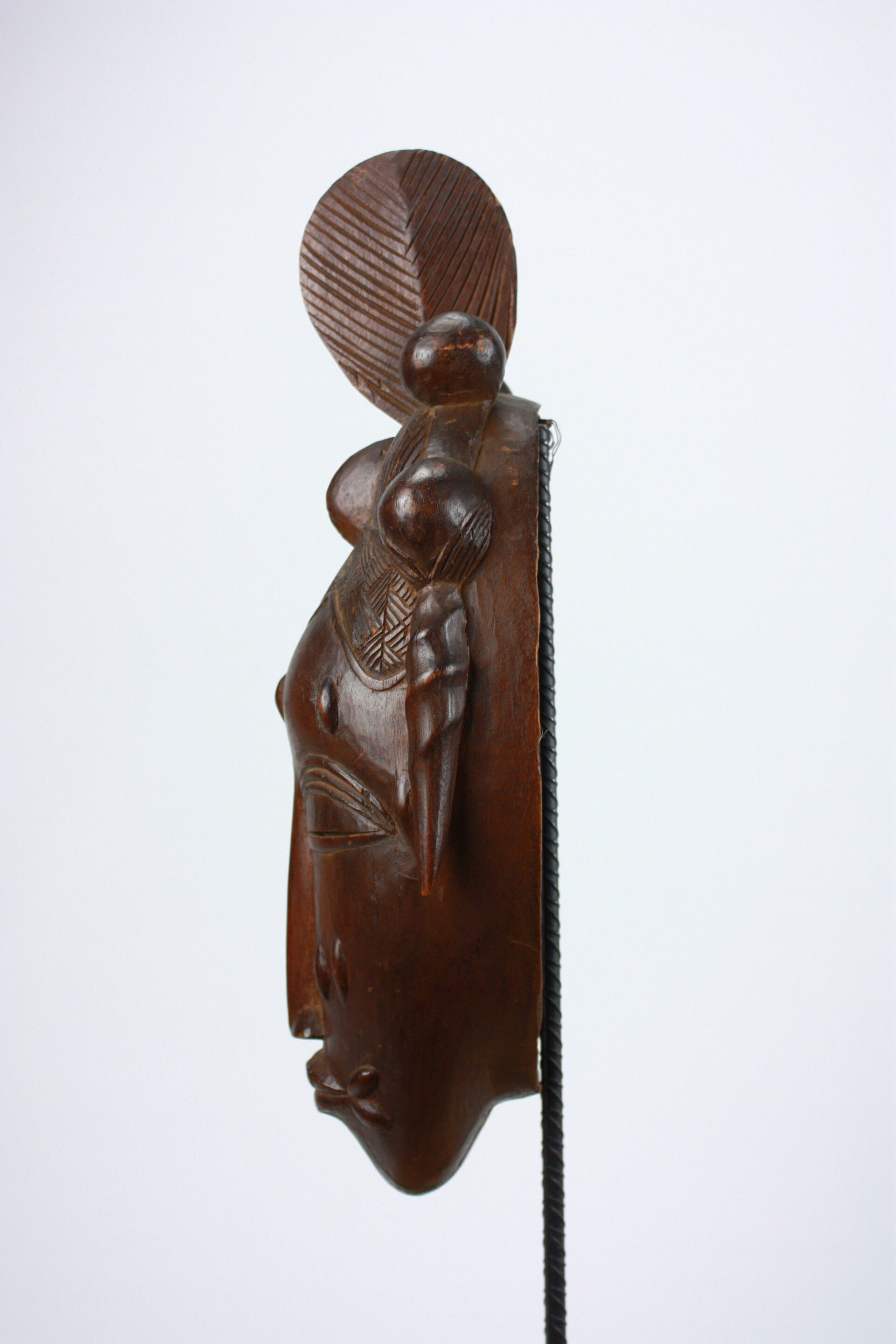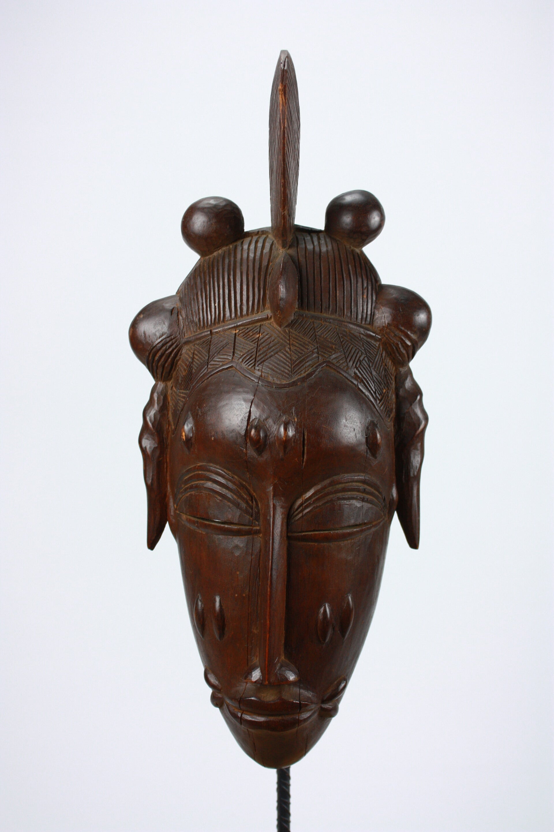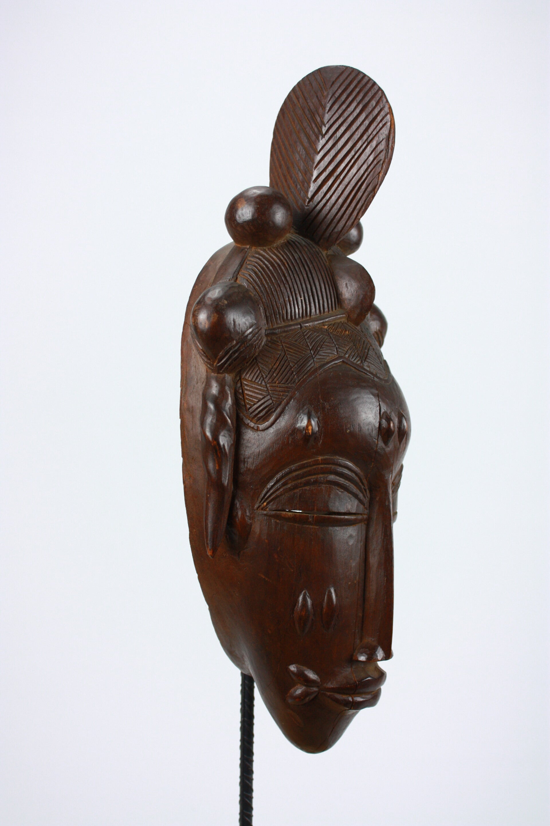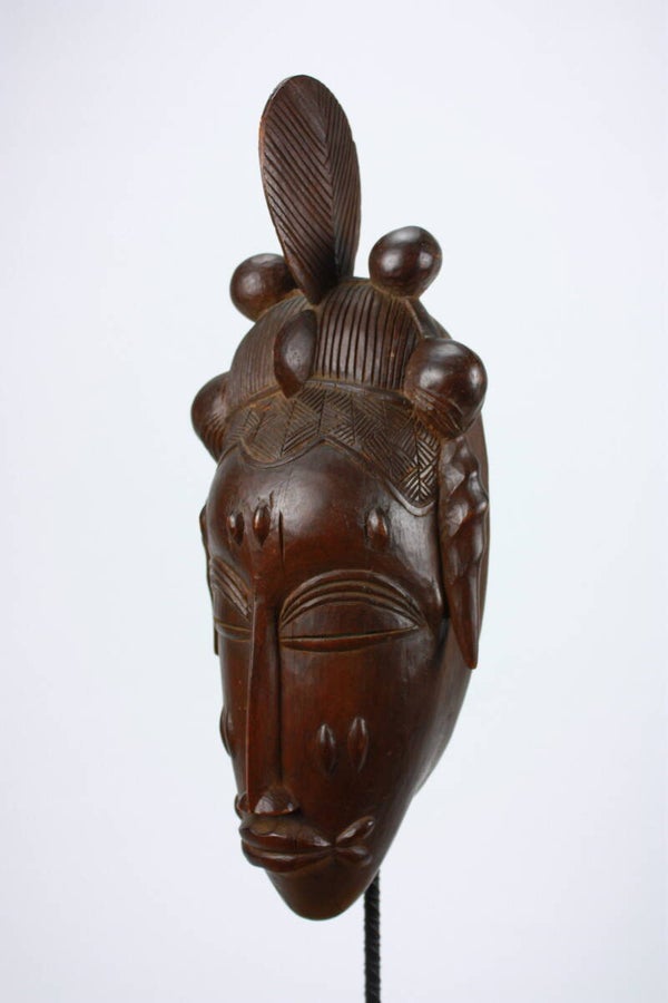 Wooden portrait mask with elaborate crested coiffure, scarification marks and refined, symmetrical features. Dark brown patina with visible age and wear. 20th century.