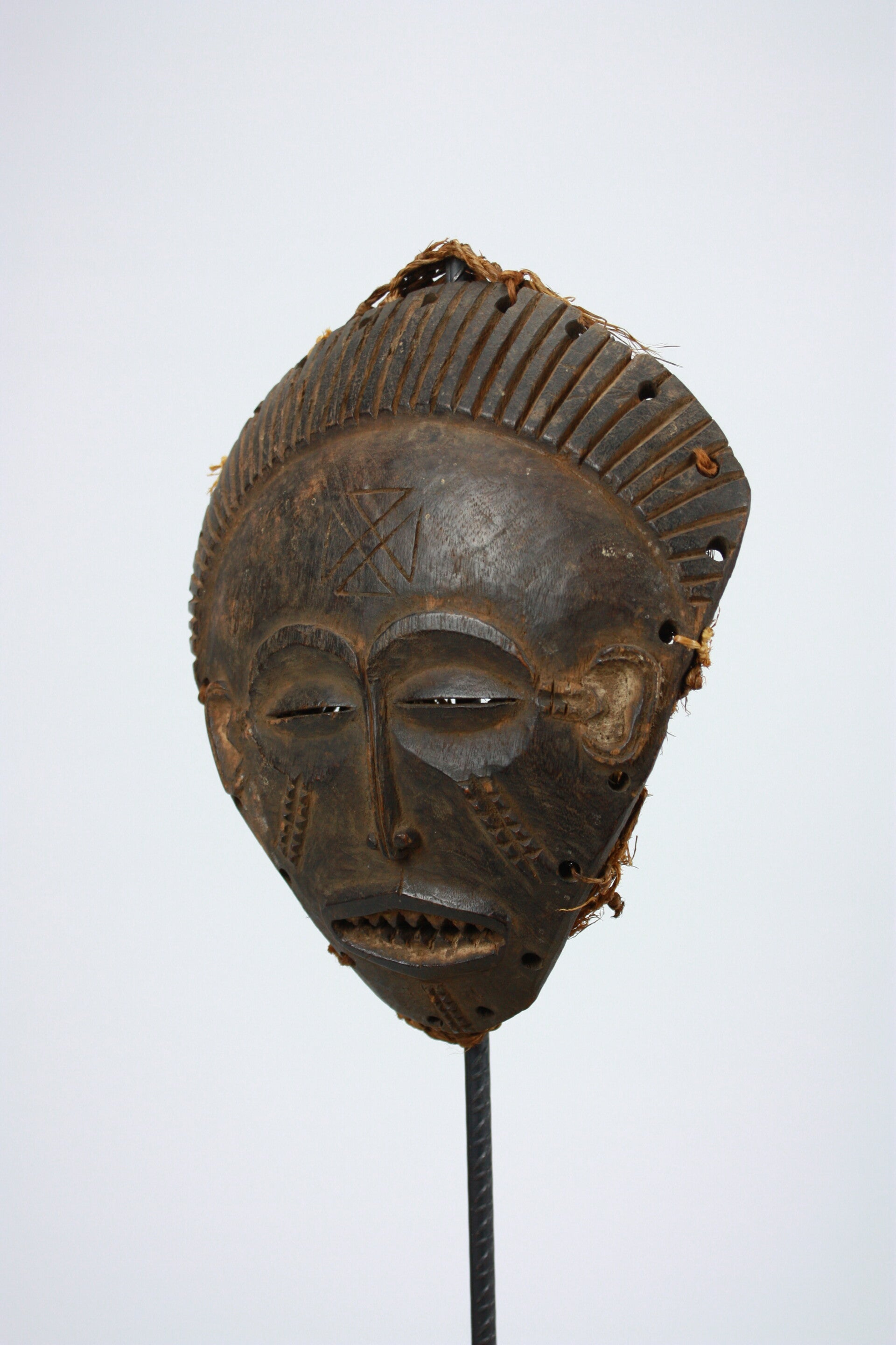 Wooden female mask representing Pwo, the idealized ancestral woman in Chokwe tradition. The face shows half-closed eyes, scarification marks on the cheeks and forehead, and a geometric motif carved at the center of the forehead. The open mouth with carved teeth and the radiating coiffure with pierced rim for attachment are characteristic features.