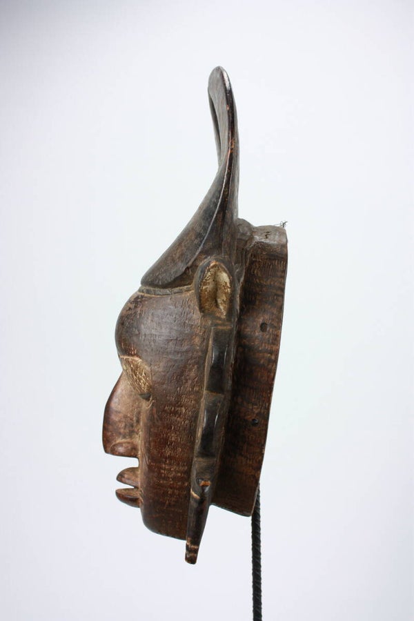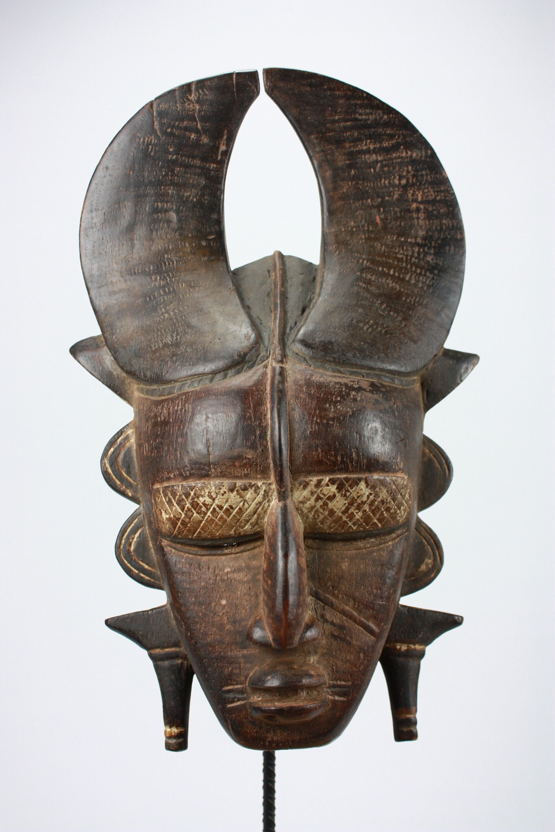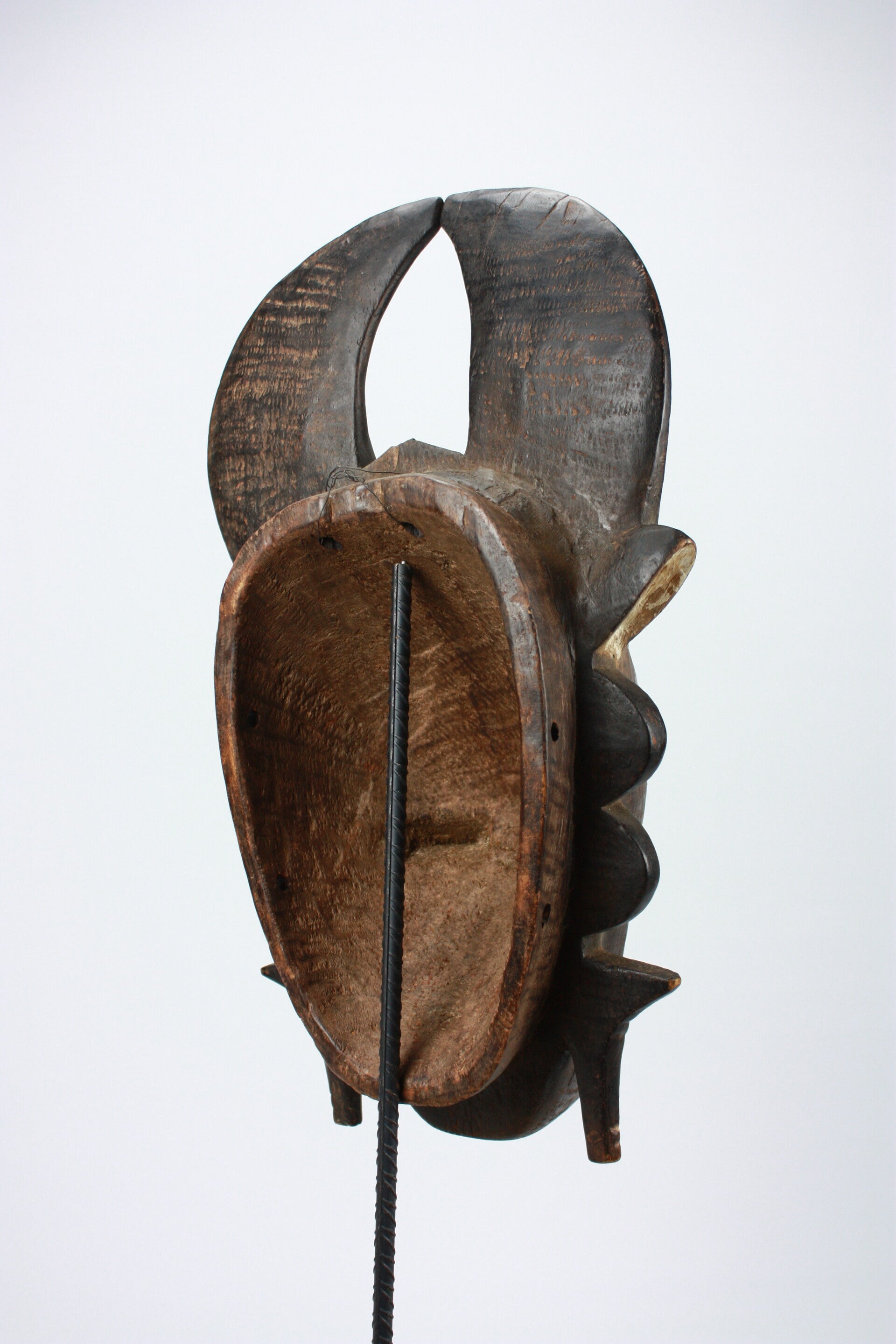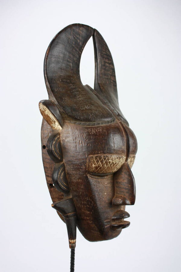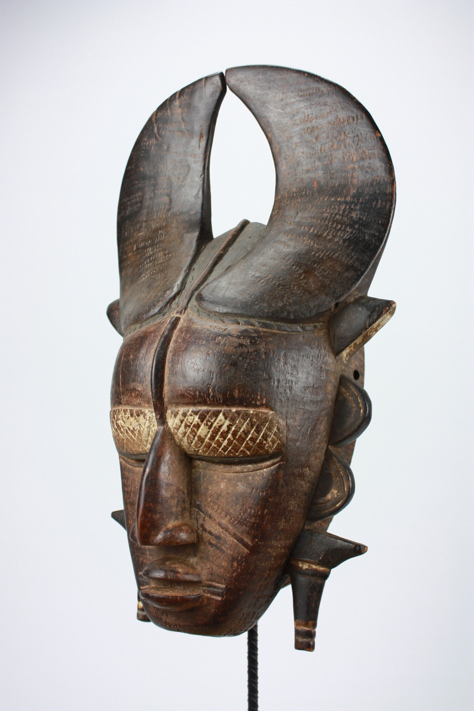 Wooden mask associated with the Do society of the Djimini people. The face is surmounted by large, crescent-shaped horns and features heavy-lidded eyes with cross-hatched scarification, a straight central nose ridge, and a composed mouth. Lateral projecting elements and layered forms enhance its strong sculptural presence.