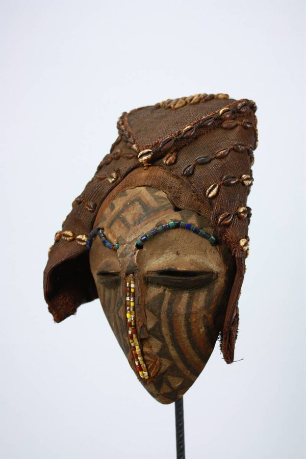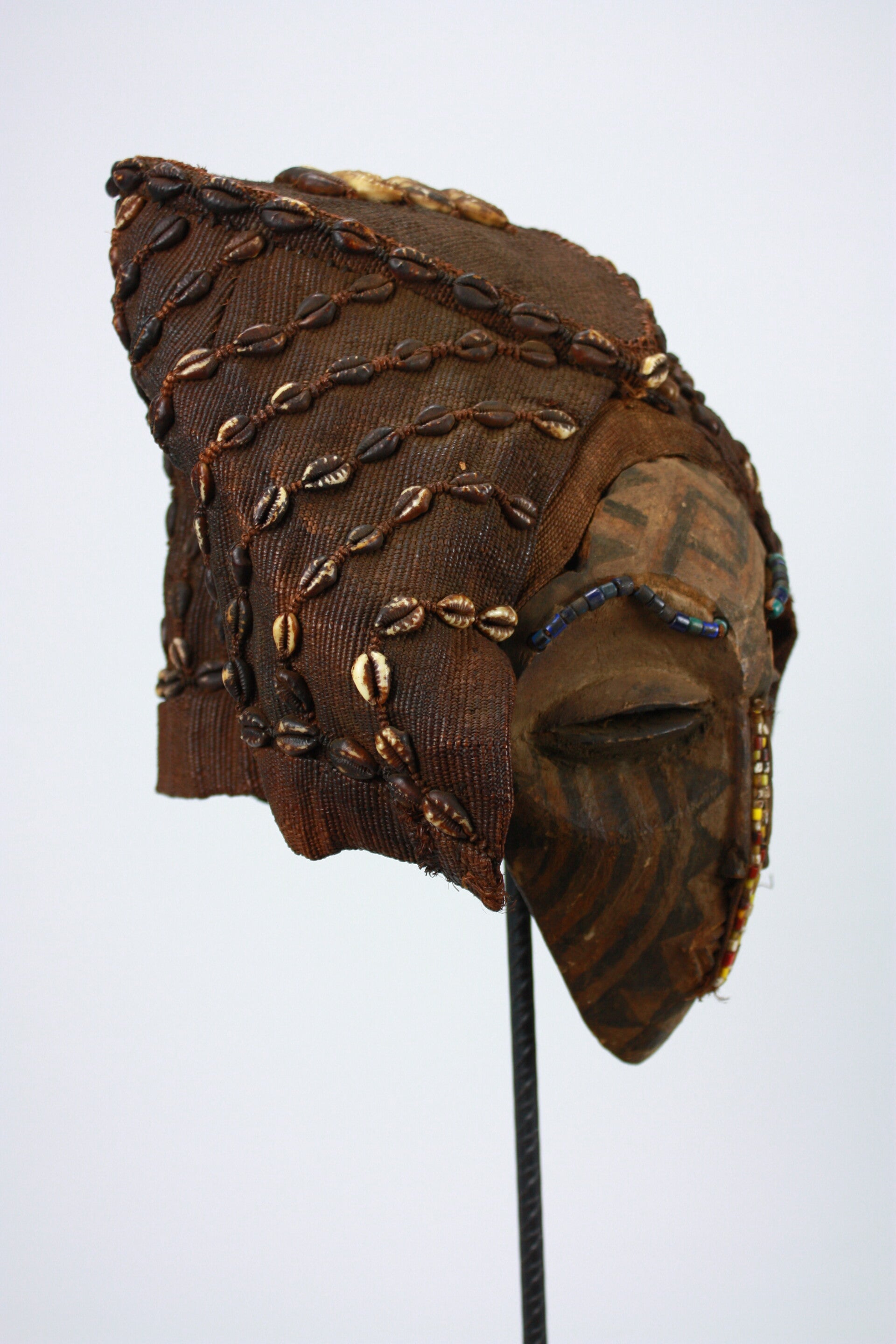 Carved wooden female mask representing Ngaady a Mwaash, adorned with geometric facial scarification motifs and delicate bead accents at the eyebrows and nose. The surface retains painted decoration in earthy tones. The elaborate textile headdress is richly embellished with cowrie shells arranged in radiating patterns.