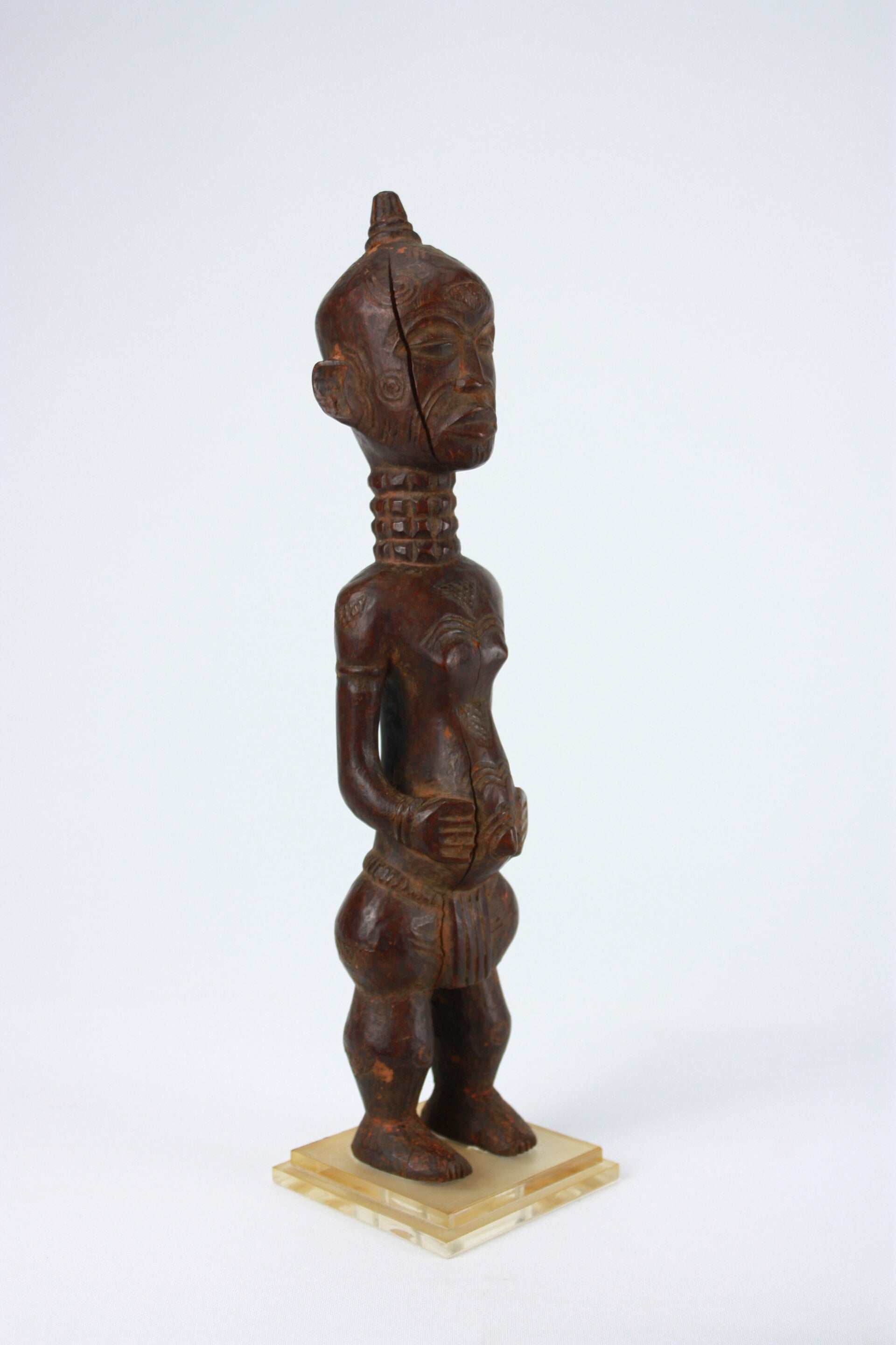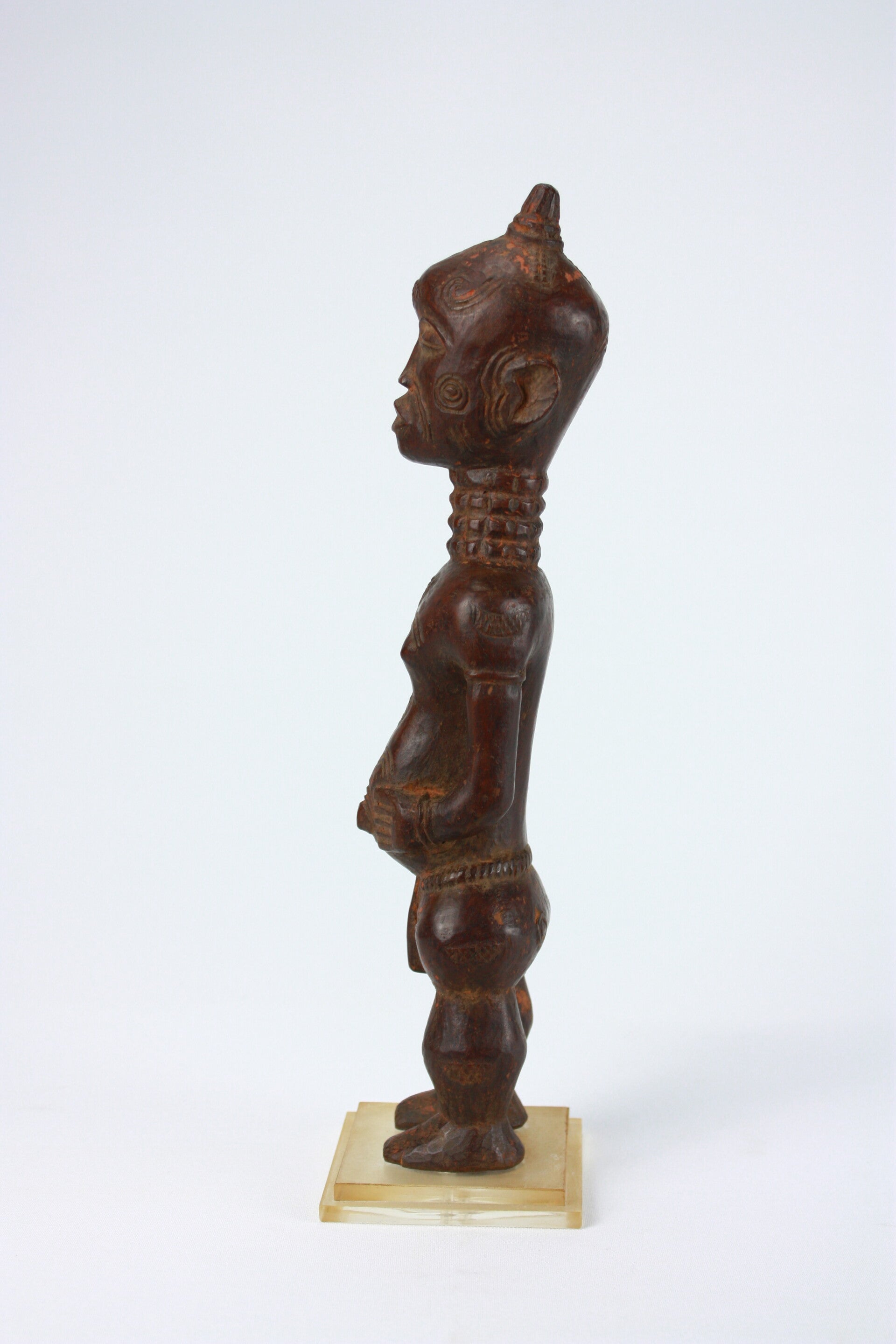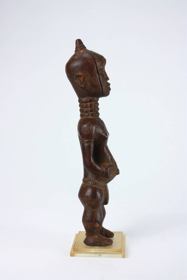 The hands rest on the abdomen, emphasizing the slightly protruding belly, a posture associated with Lulua mbùlenga figures symbolizing fertility and protection. Additional carved decoration appears on the chest and hips.