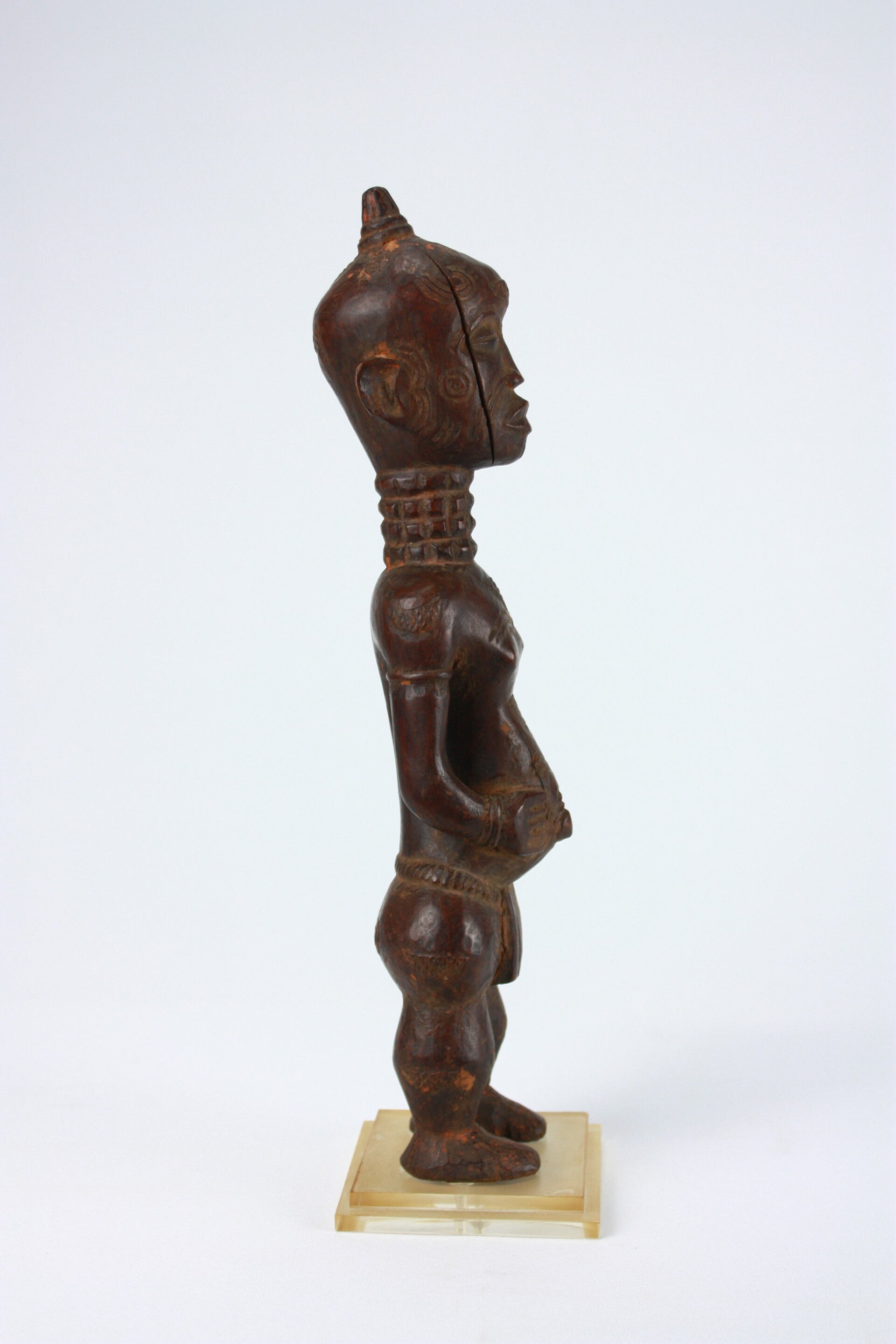 Carved wooden standing female figure with elongated neck decorated by ring-like bands and a small crest-like coiffure. The face shows stylized features with almond-shaped eyes, pursed lips, and scarification marks on the cheeks and temples.