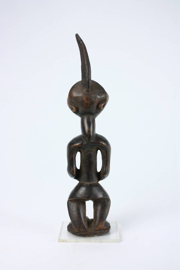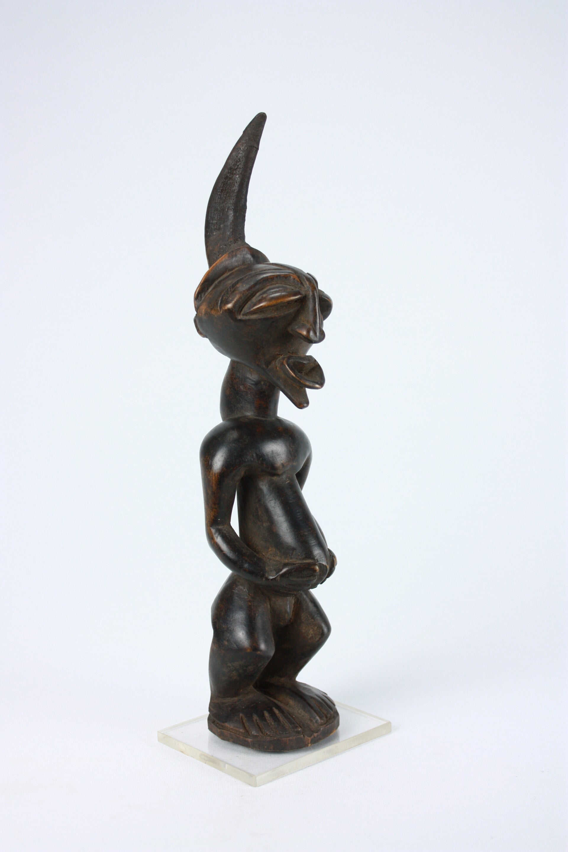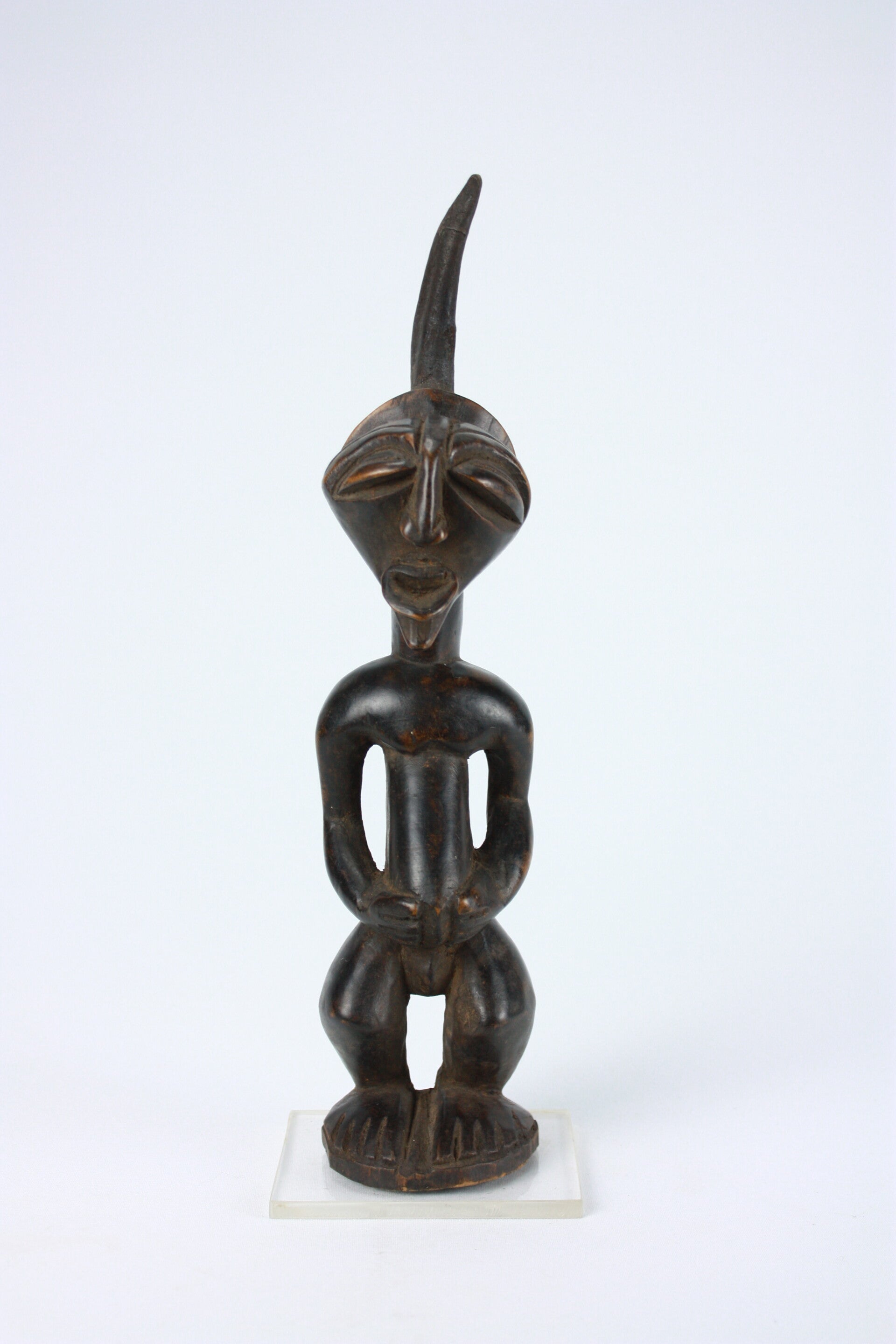 Figures of this type are associated with Songye nkisi power figures, traditionally used in spiritual and protective rituals and believed to contain or channel supernatural forces.