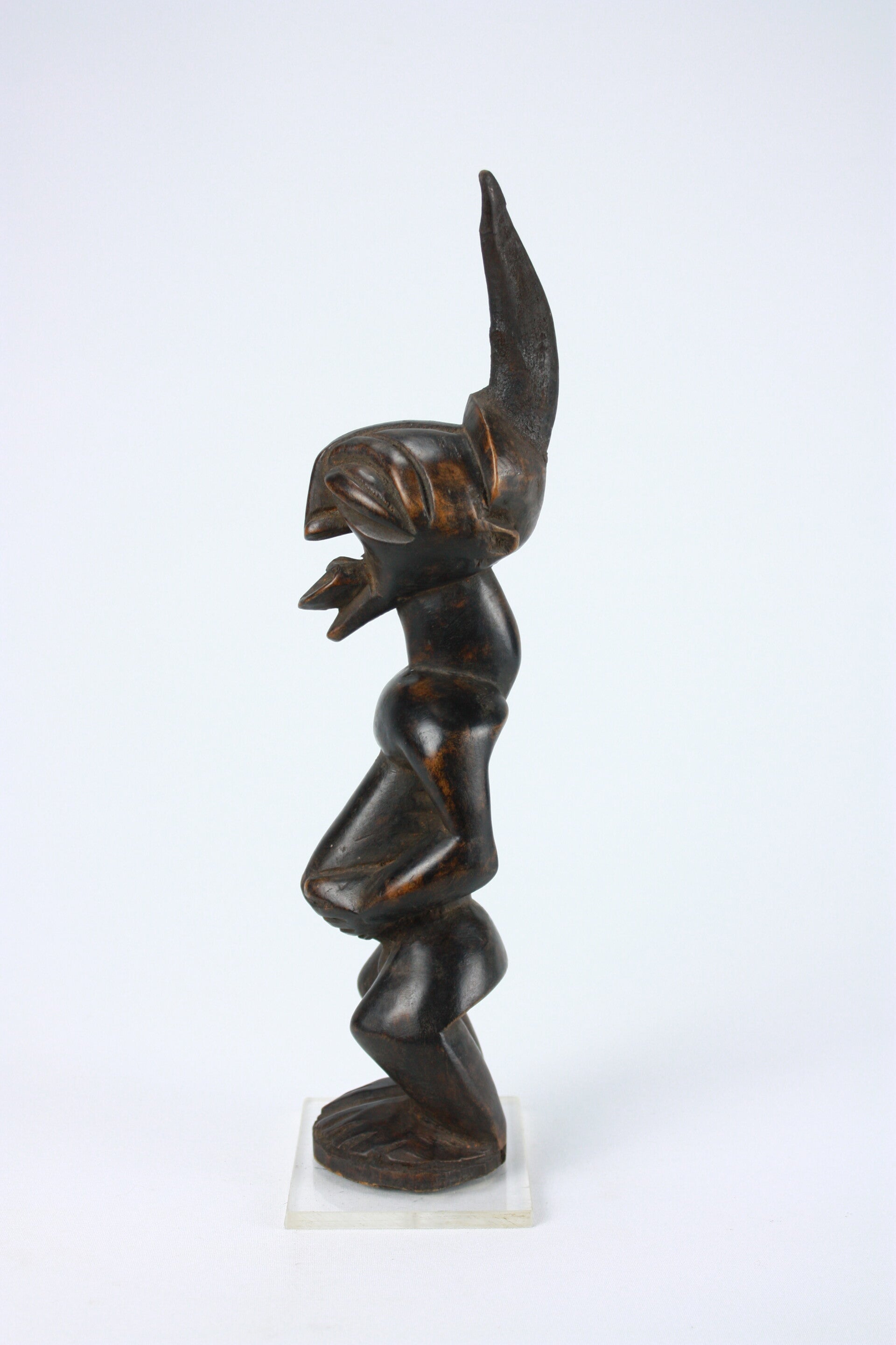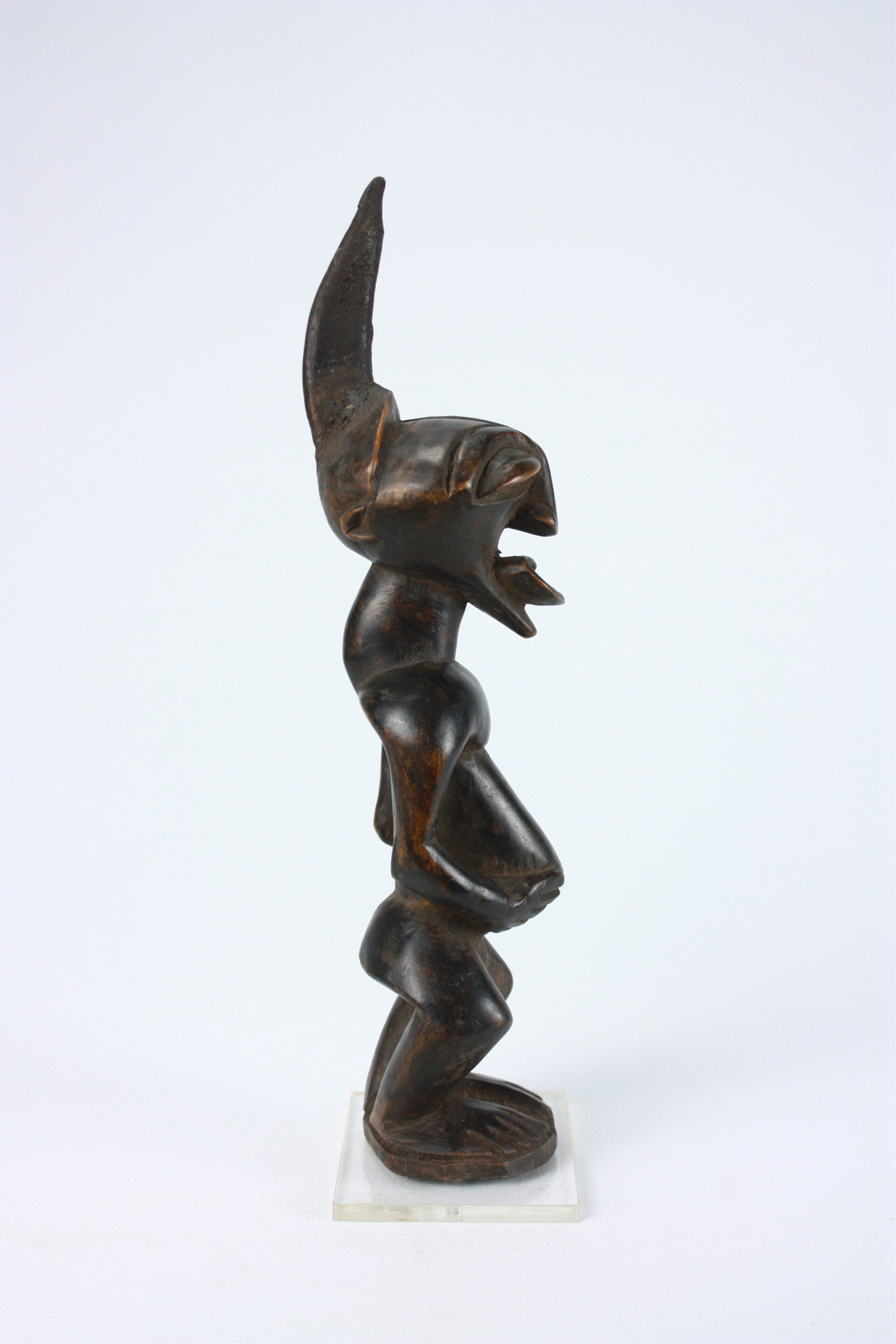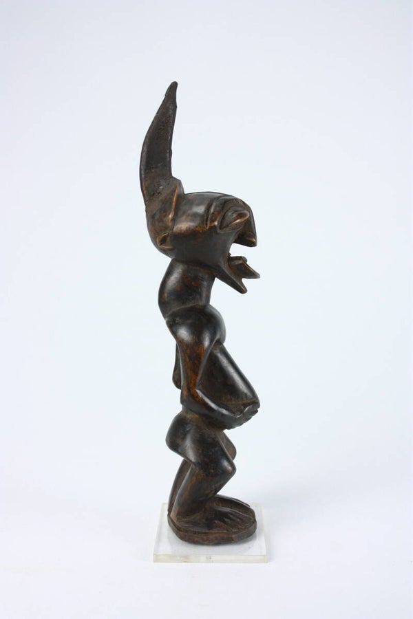 Carved wooden standing male figure with elongated head, heavy-lidded almond-shaped eyes, and an open mouth with projecting lips. The figure stands with bent knees, the hands placed on the abdomen, and a prominent crest-like projection rising from the top of the head.