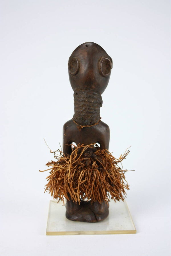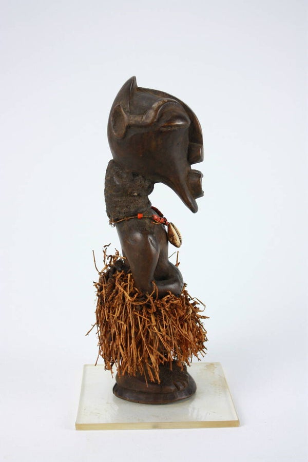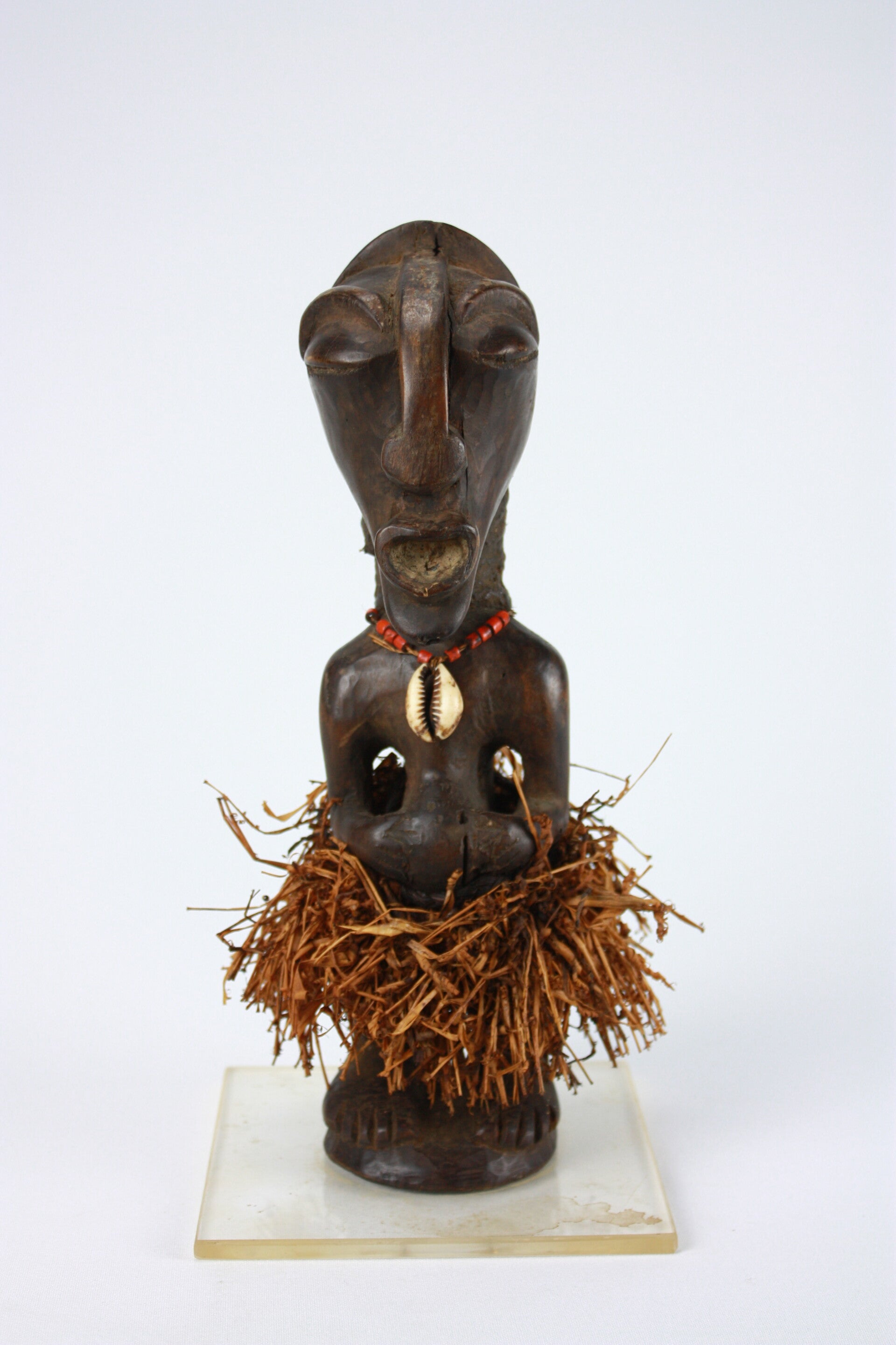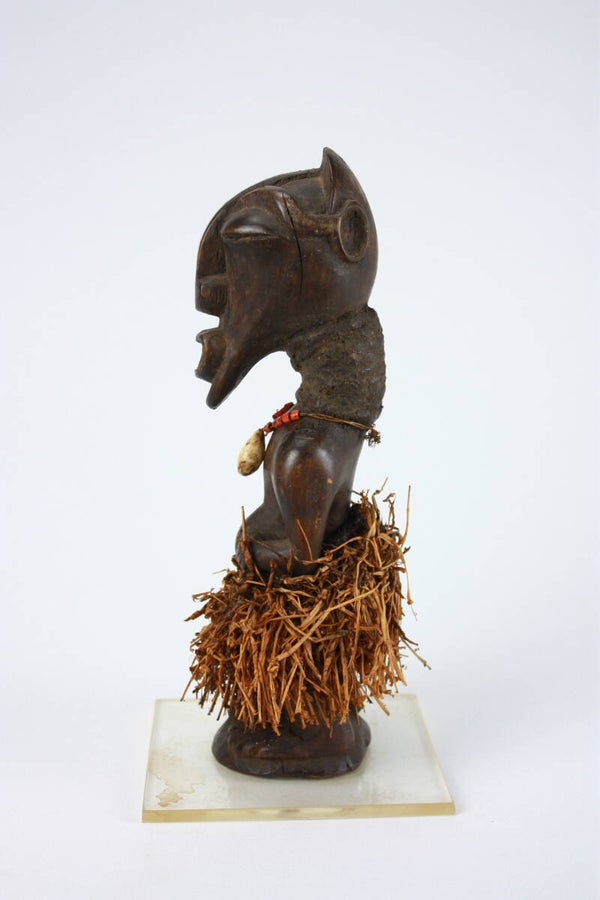 Carved wooden standing figure with elongated head, heavy-lidded almond-shaped eyes, and a prominent open mouth. The figure stands upright with hands placed on the abdomen. Around the waist is a skirt of plant fibres, while the neck is adorned with a small necklace with beads and a cowrie shell. Cavities in the torso likely once contained magical substances associated with its ritual function.