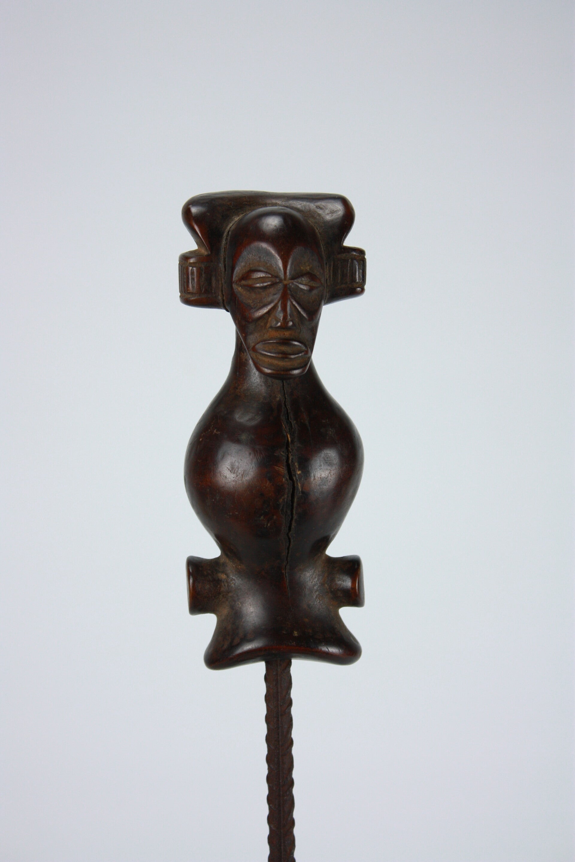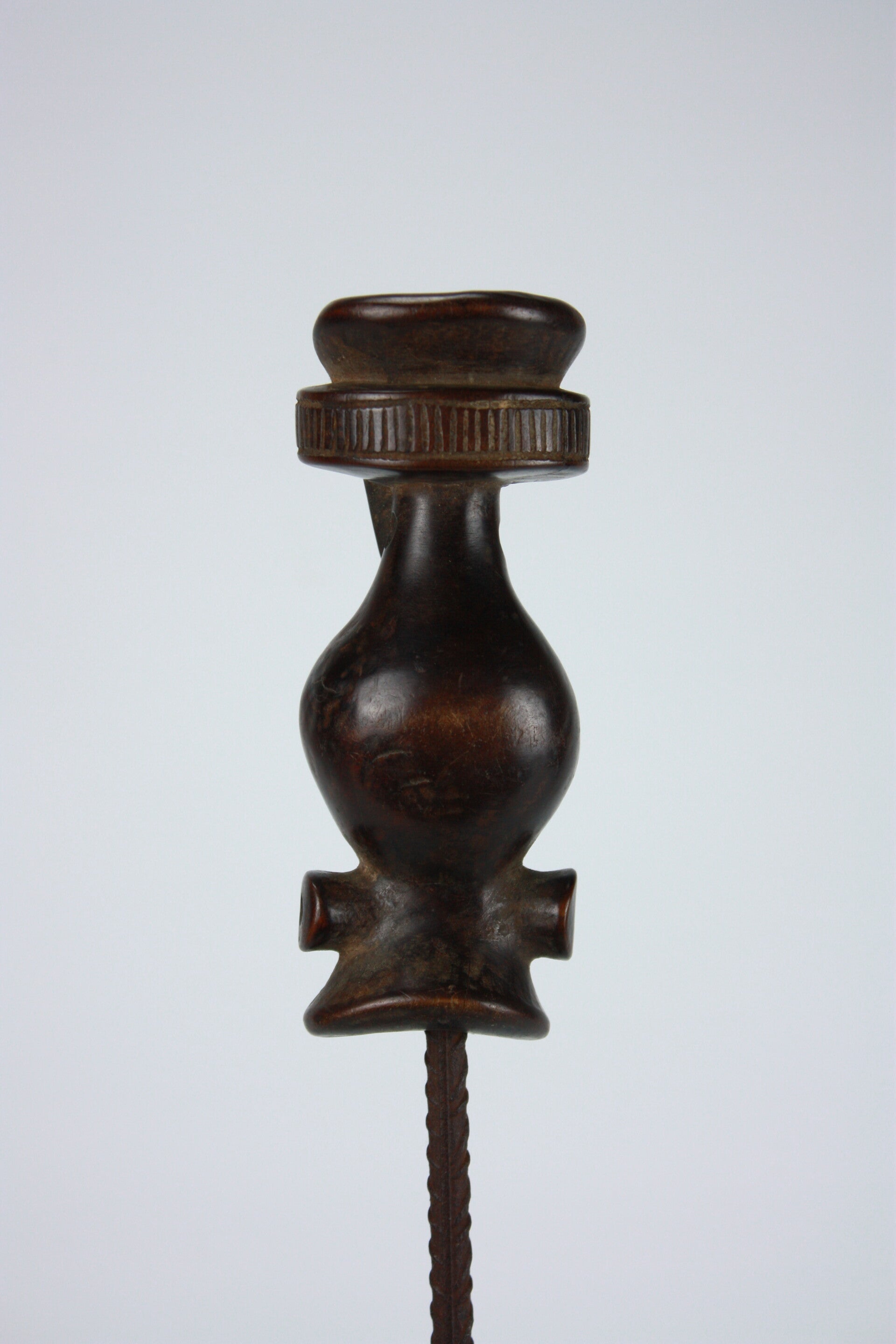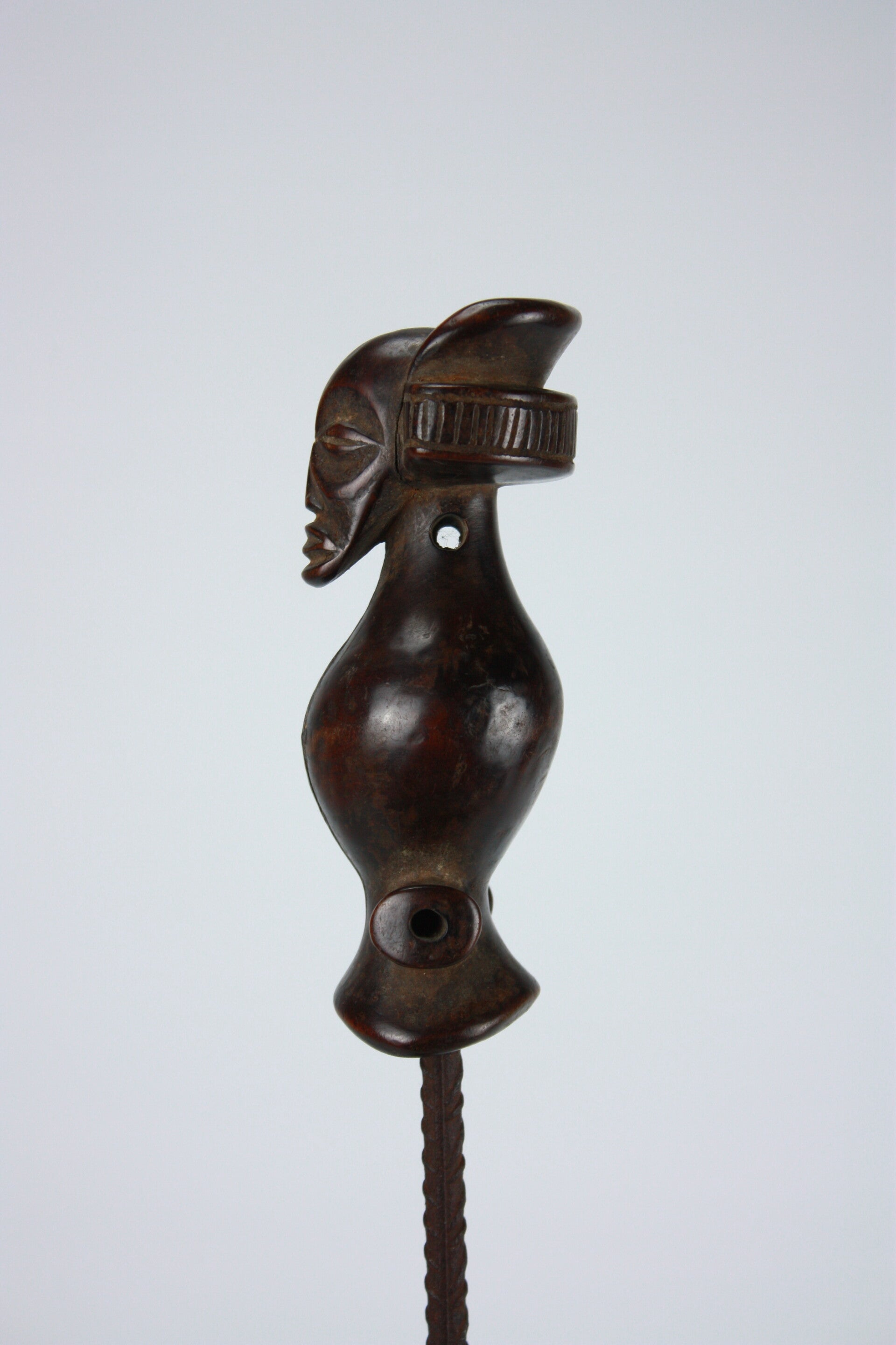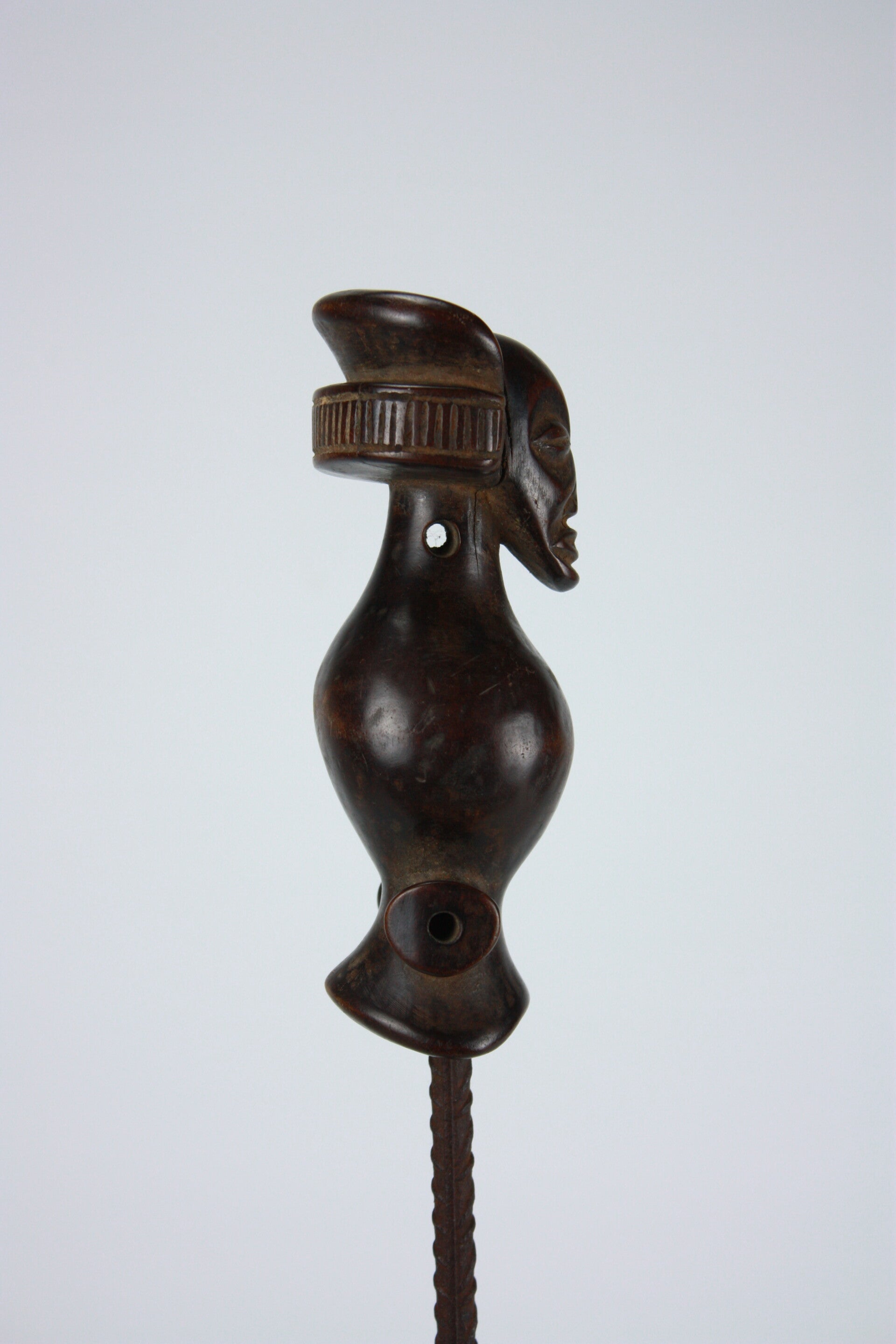 Whistles of this type, known as kasengosengo, were used by hunters for communication in the bush. By producing high-pitched signals, they could call hunting dogs, signal companions, or coordinate movements during the hunt. The anthropomorphic carving also held symbolic meaning, often representing ancestors or protective spirits believed to guide and safeguard the hunter.